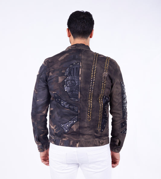 KINGZ Herren Biker Jeans Jacke, Totenkopf Motiv, Slim Fit, Modell 1719, Army