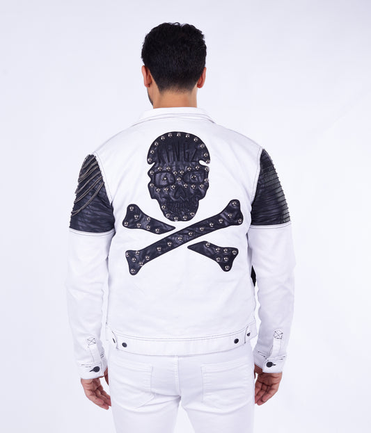 KINGZ Herren Biker Jeans Jacke, Totenkopf Motiv, Slim Fit, Modell 1593, Weiß