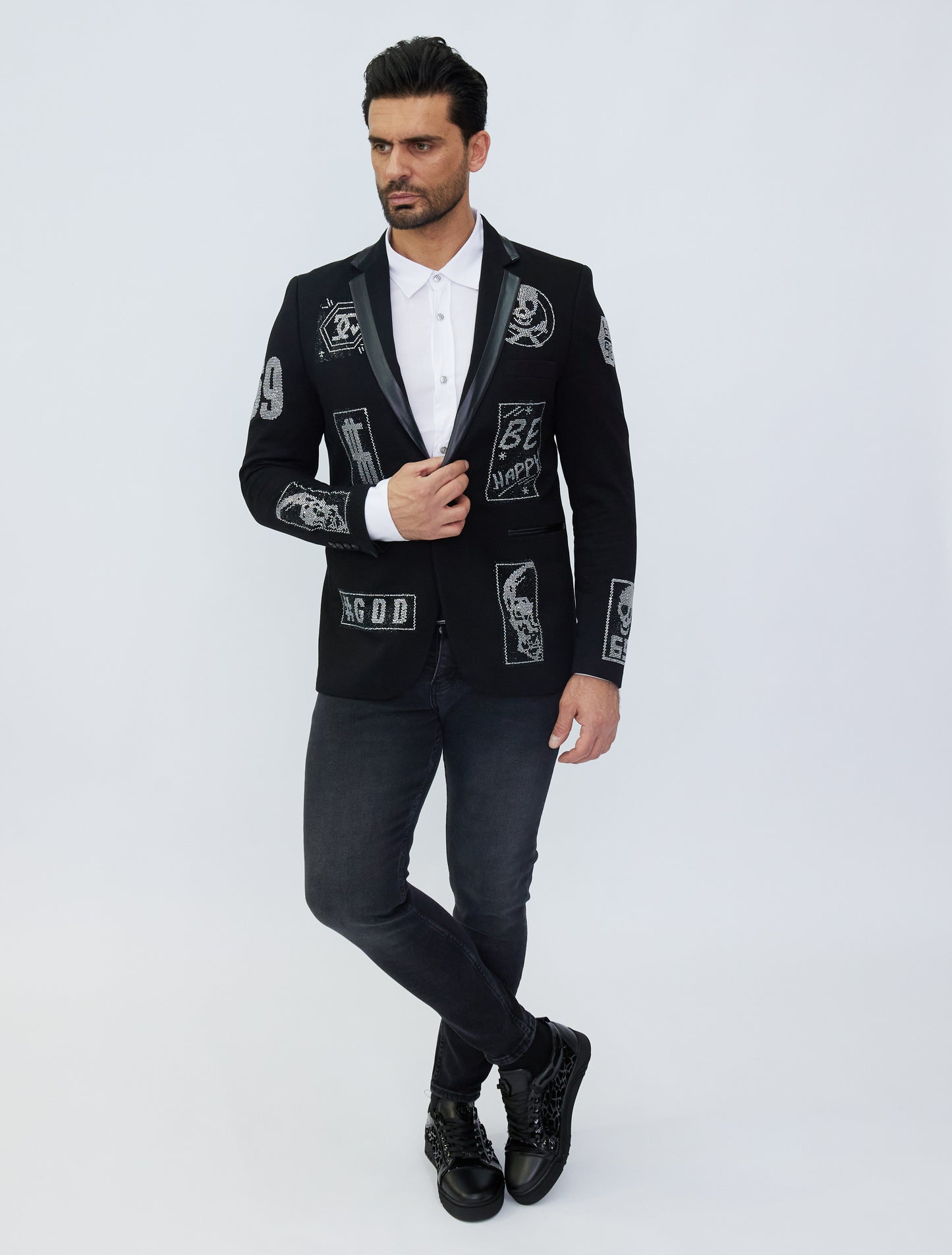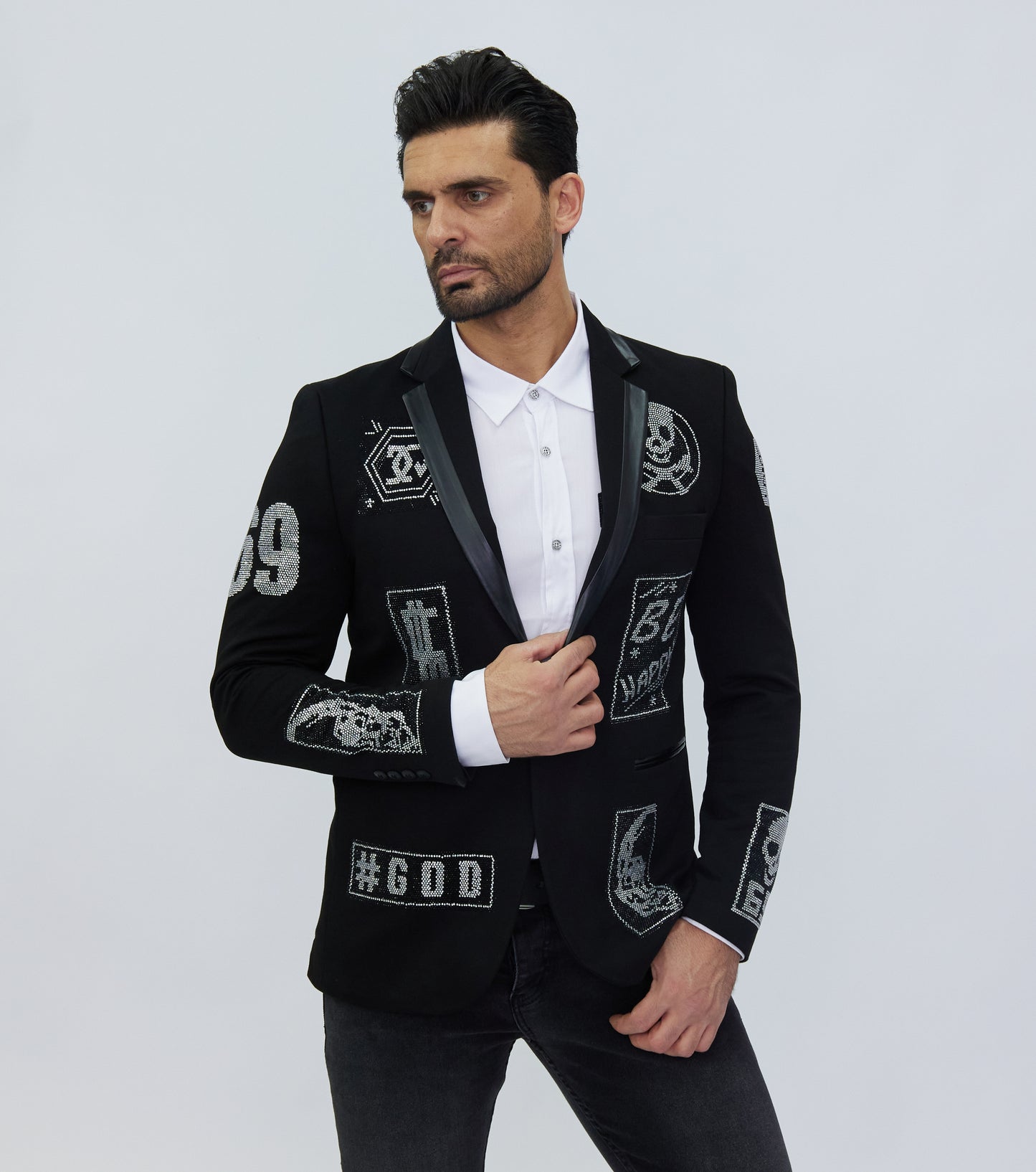 Give your wardrobe a special update with this designer blazer for the fashion-conscious man. The pleasant wearing comfort thanks to the high material quality will convince you. Fine jersey jacket with a special collar design that is complemented with black synthetic leather. In a very fashionable look with many rhinestone motifs, which are applied to the front and on the arms. This unusual style definitely makes this men's jacket the ideal companion for a trendy, extravagant look.