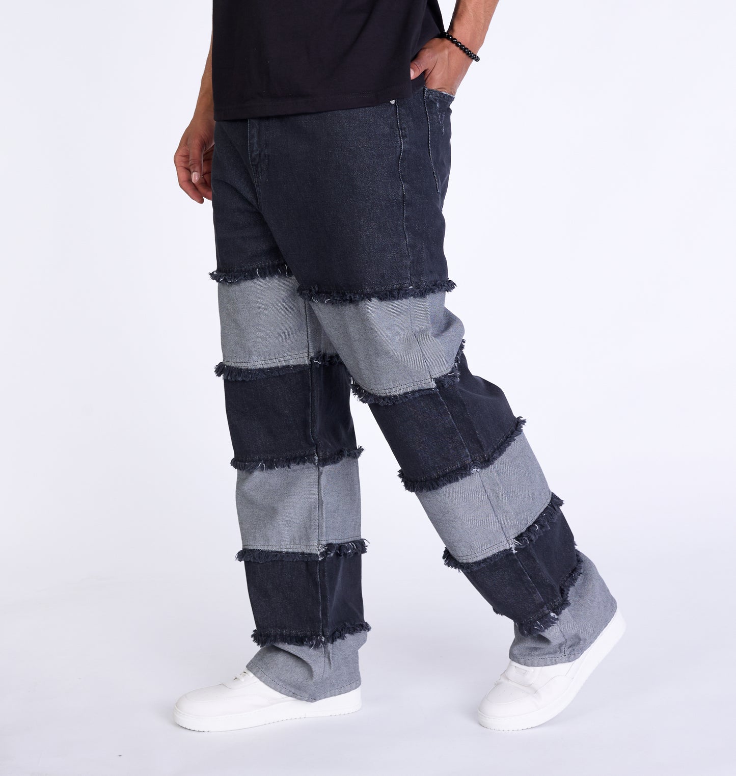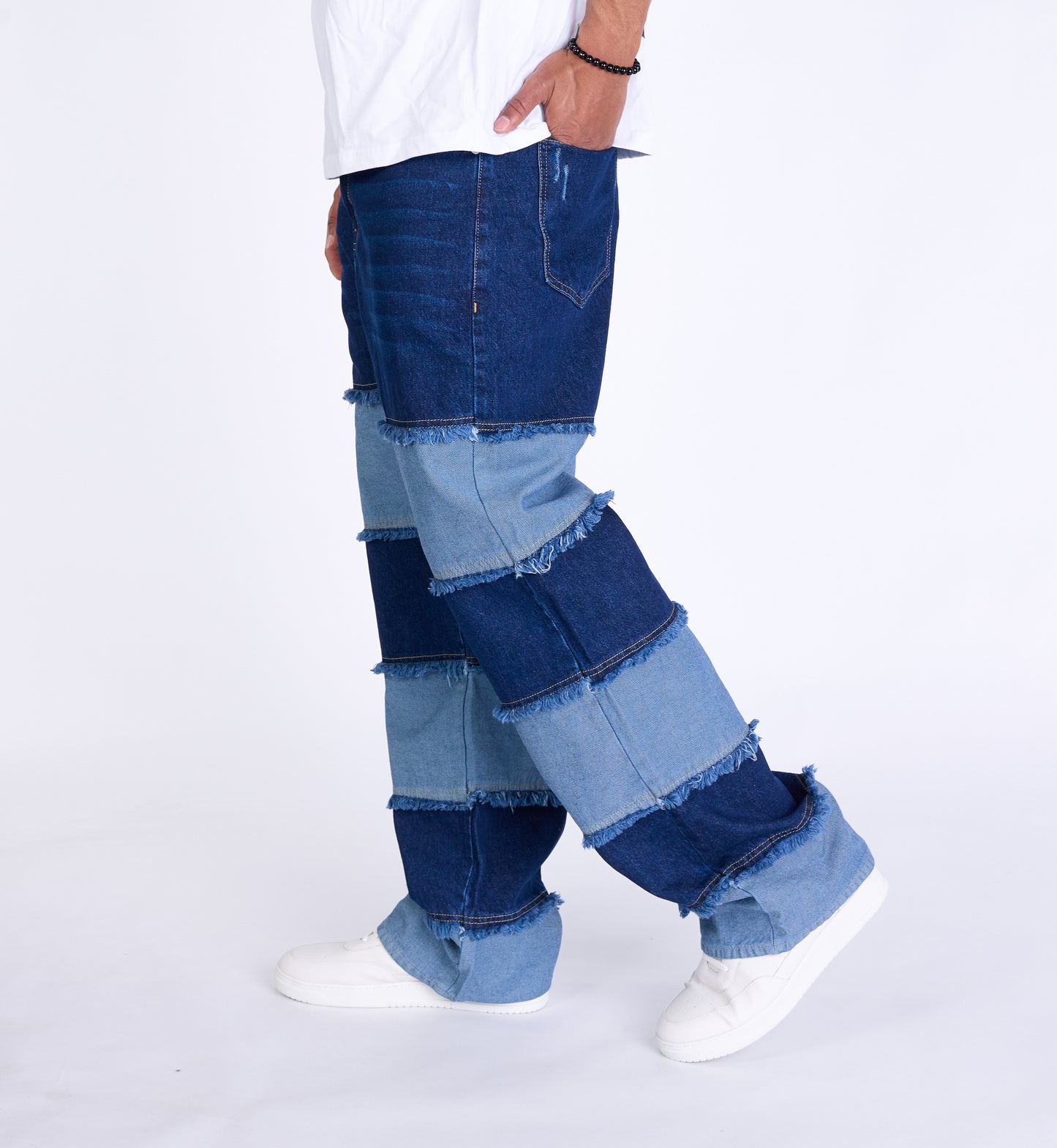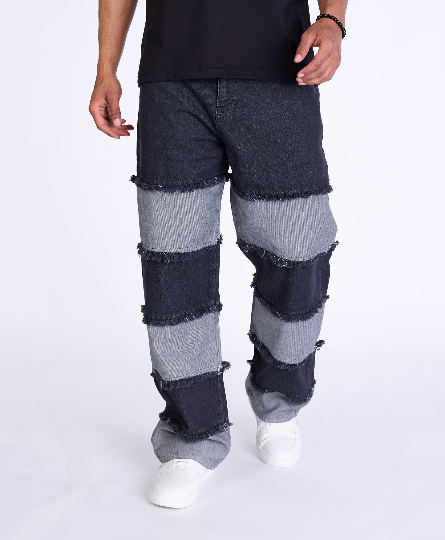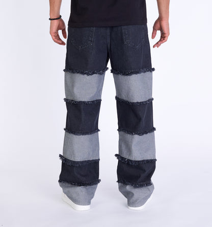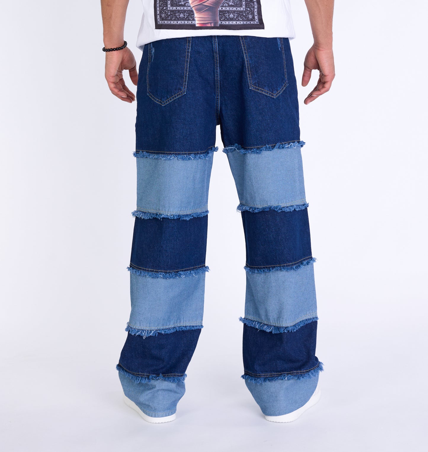 These casual baggy jeans combine comfort and style at the highest level. The striking striped look is created by alternating twisted denim that turns the inside out. The cool fringes on the seams are an additional eye-catcher.