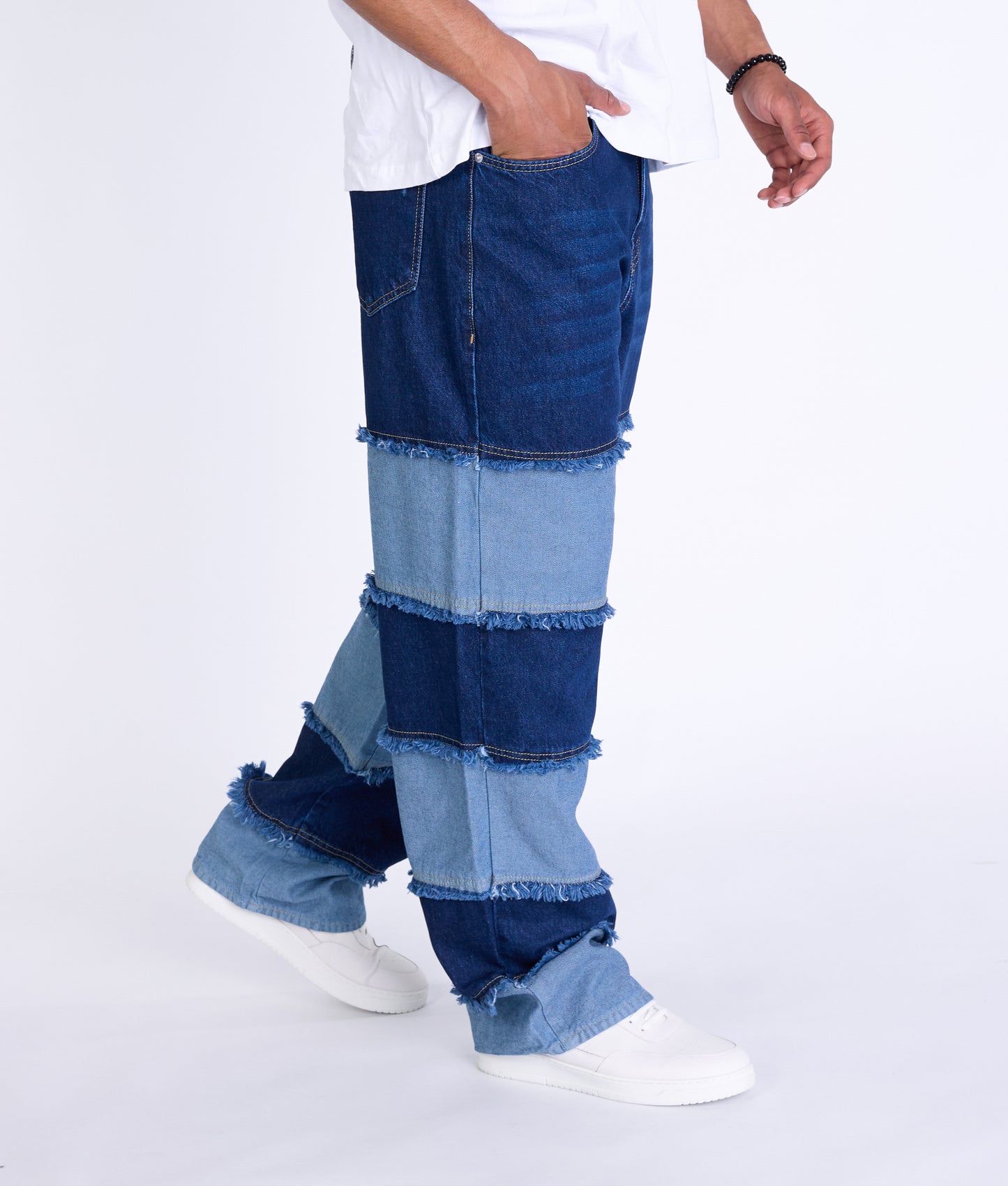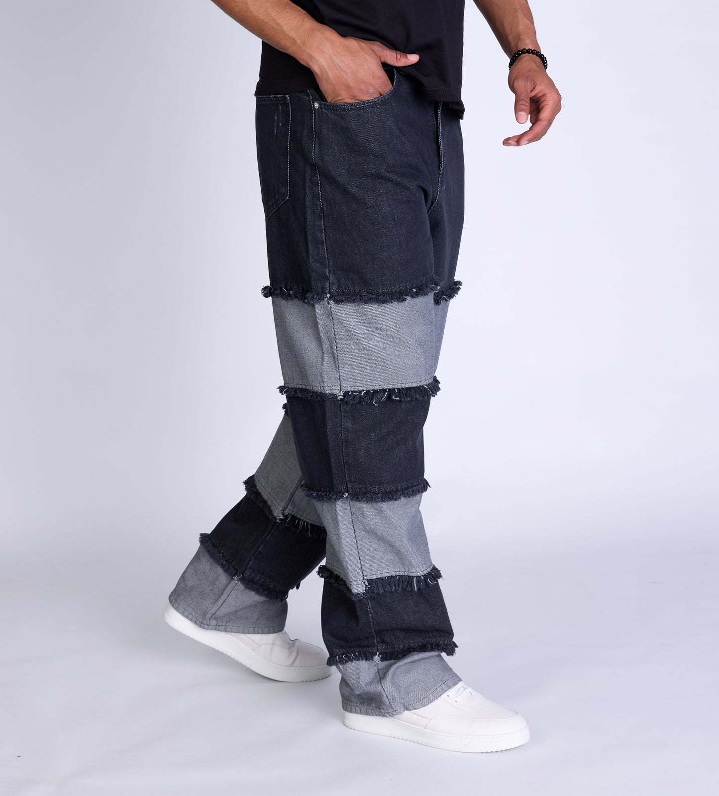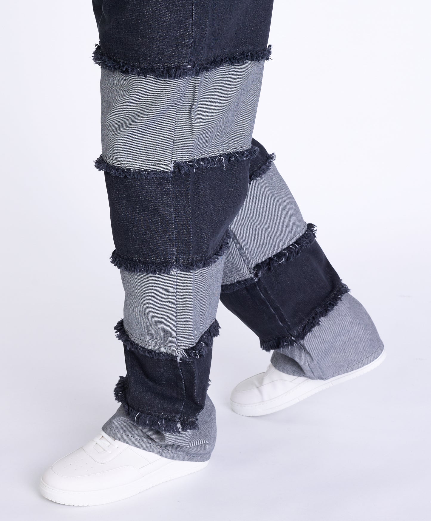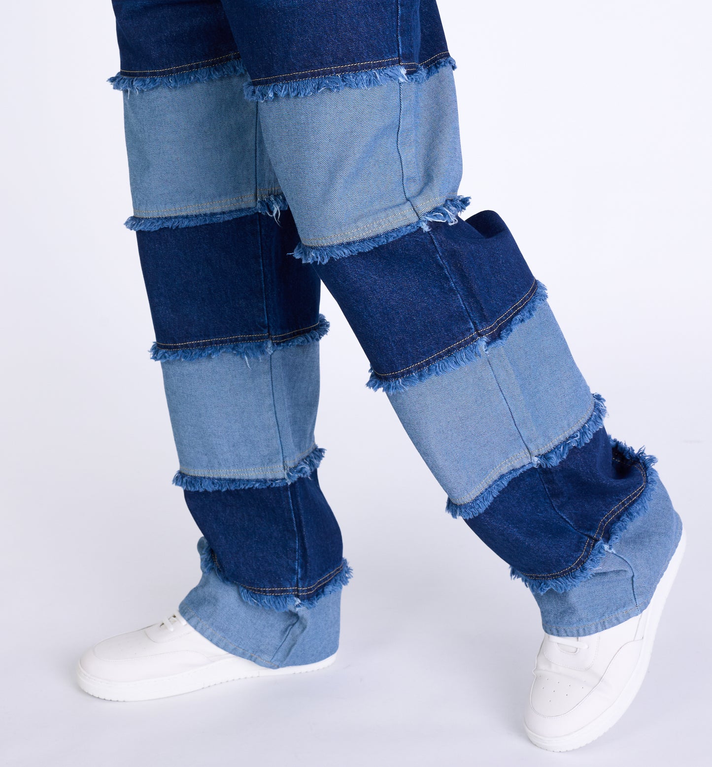 These casual baggy jeans combine comfort and style at the highest level. The striking striped look is created by alternating twisted denim that turns the inside out. The cool fringes on the seams are an additional eye-catcher.