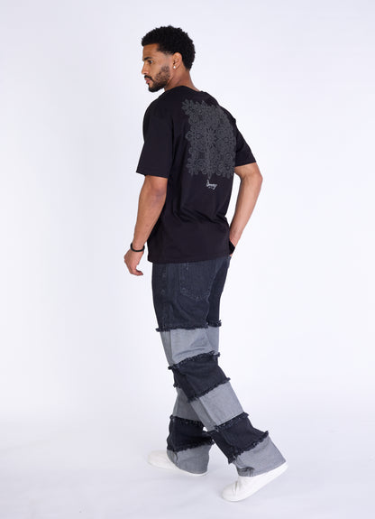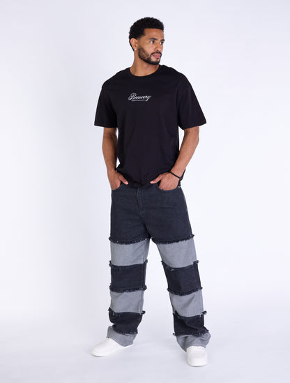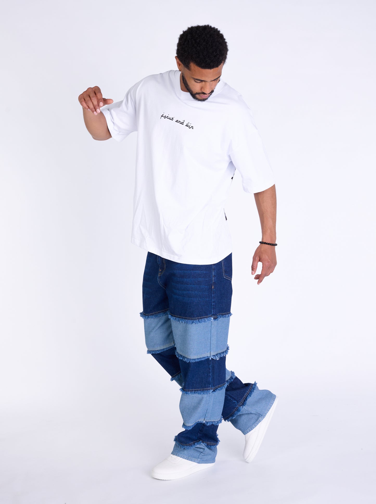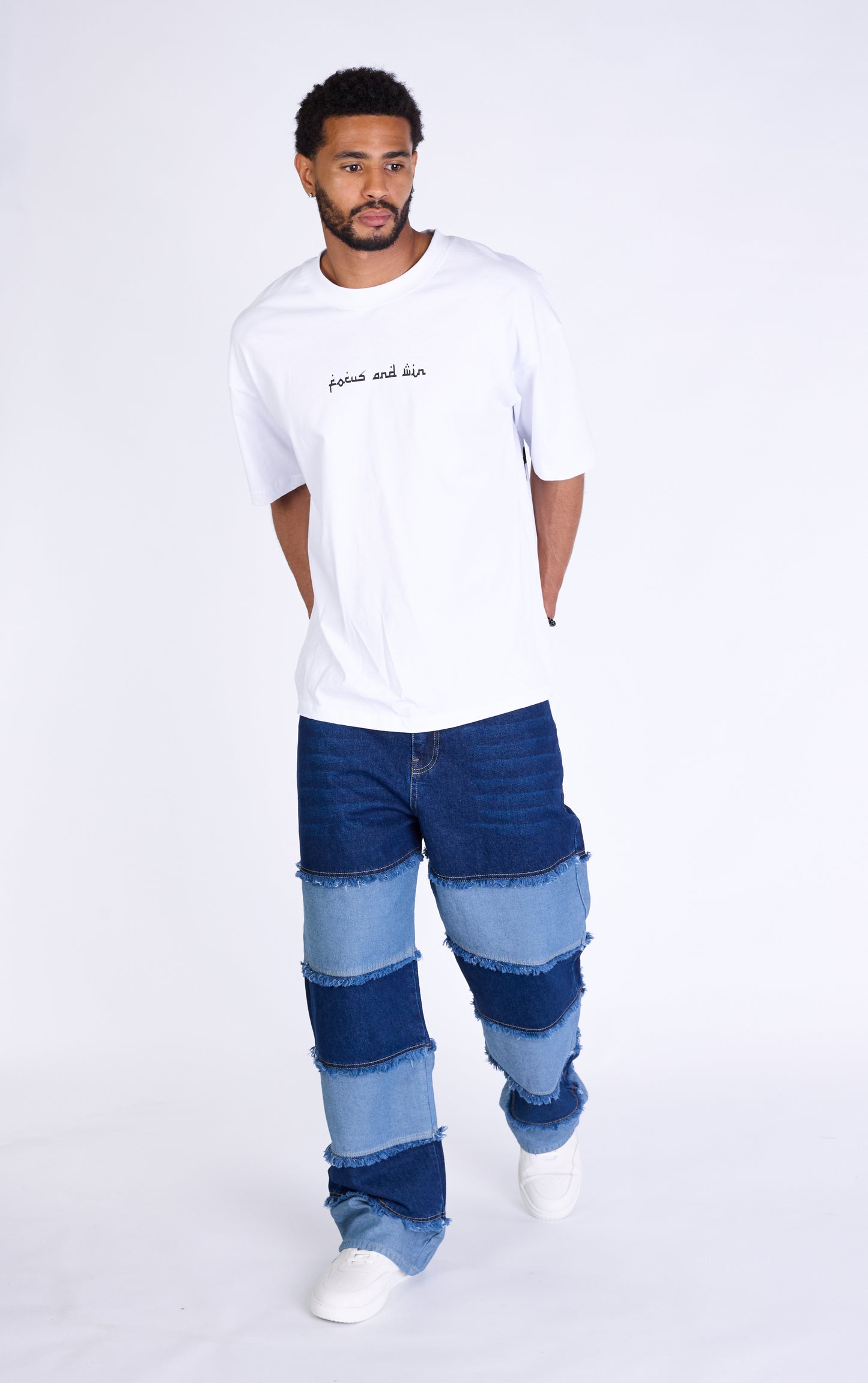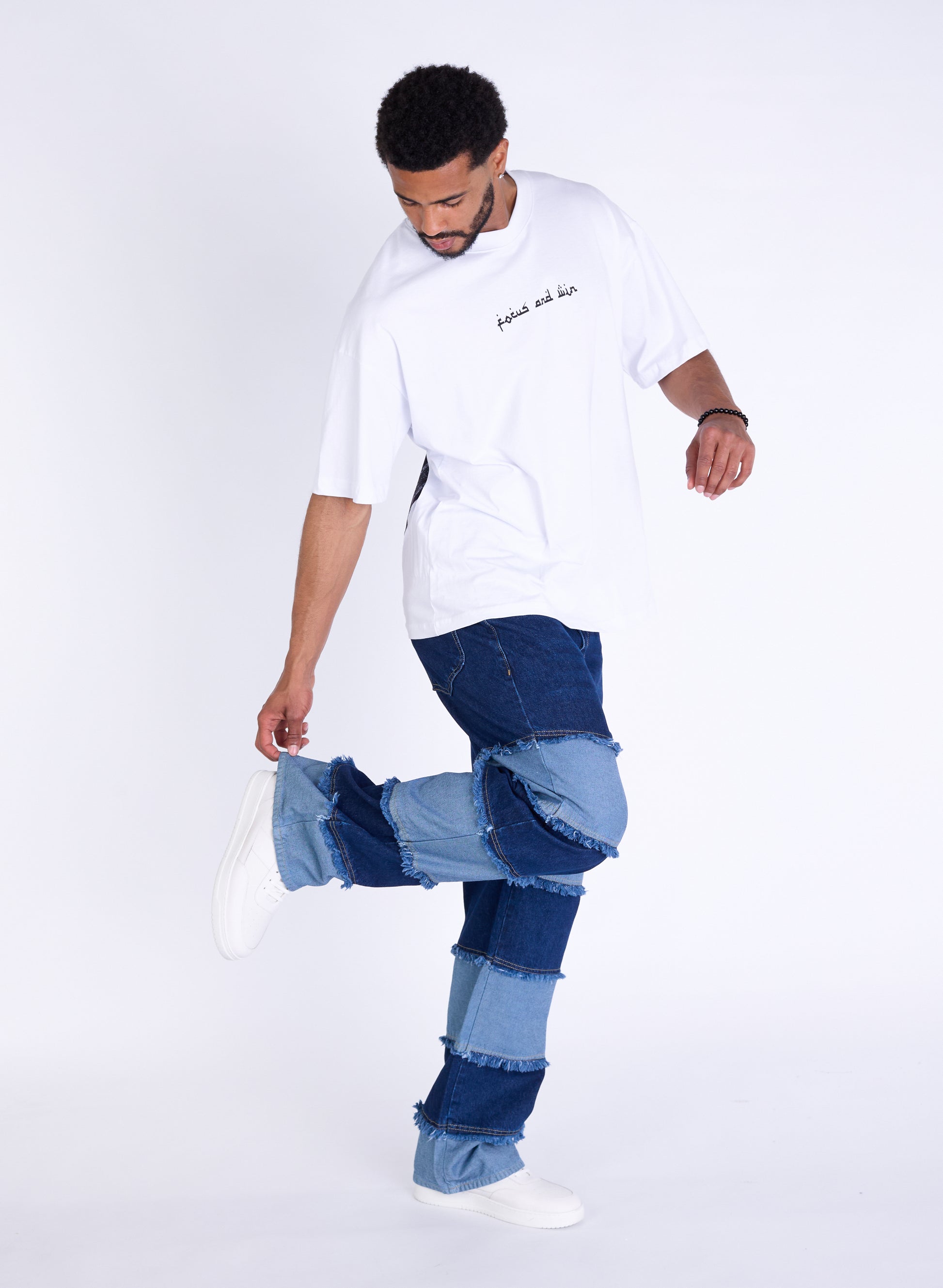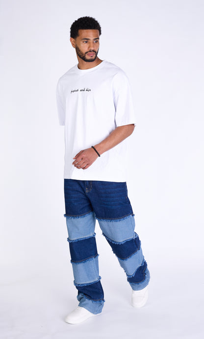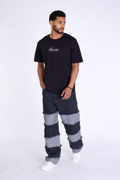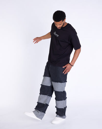 These casual baggy jeans combine comfort and style at the highest level. The striking striped look is created by alternating twisted denim that turns the inside out. The cool fringes on the seams are an additional eye-catcher.