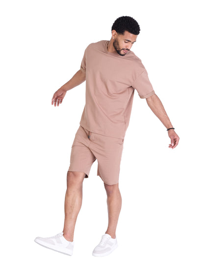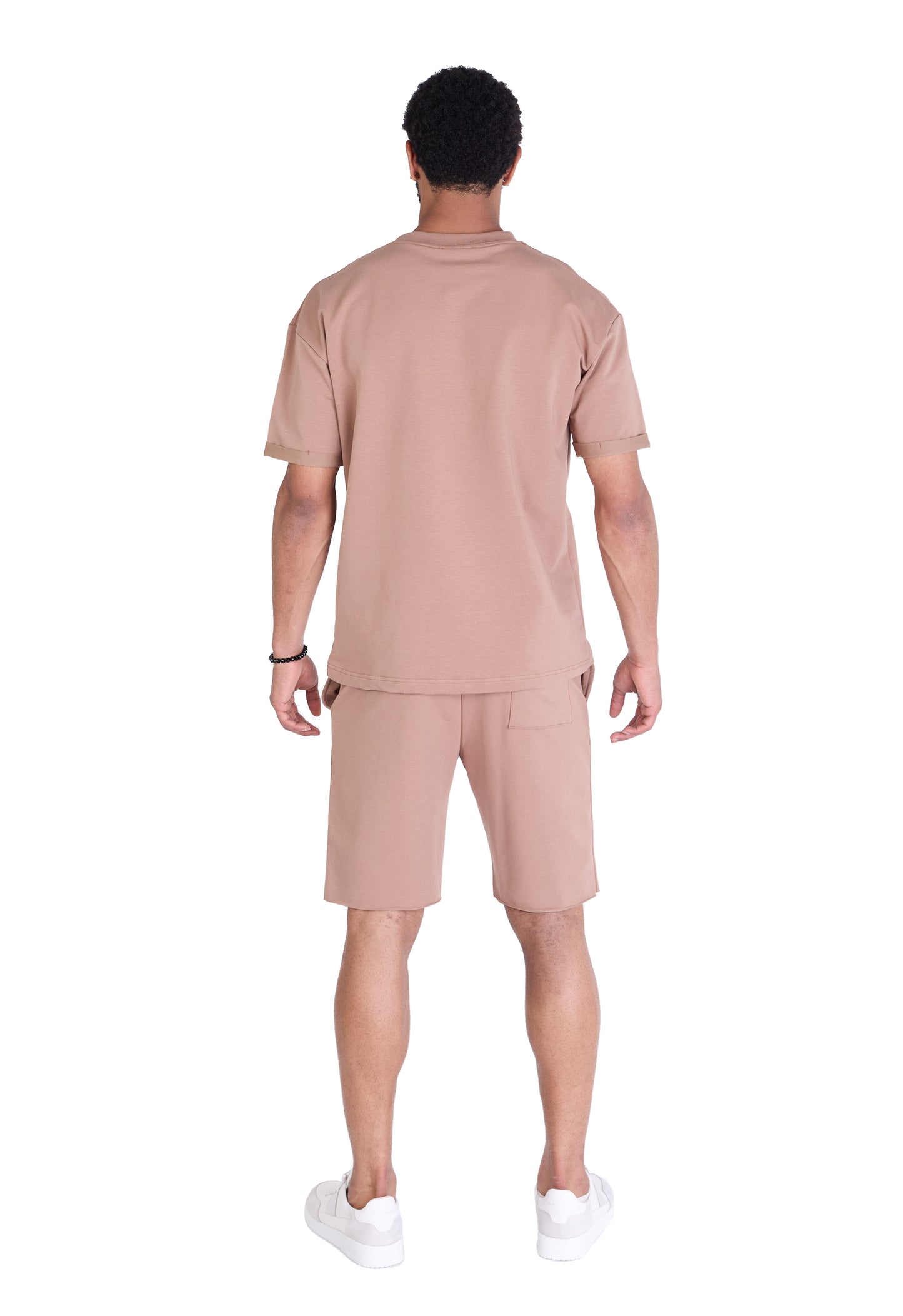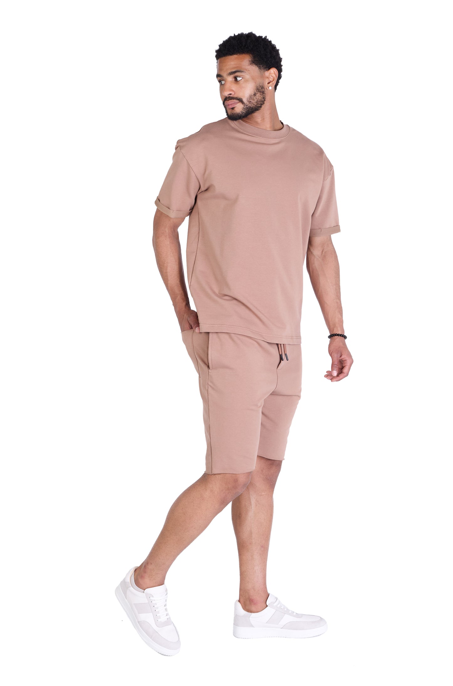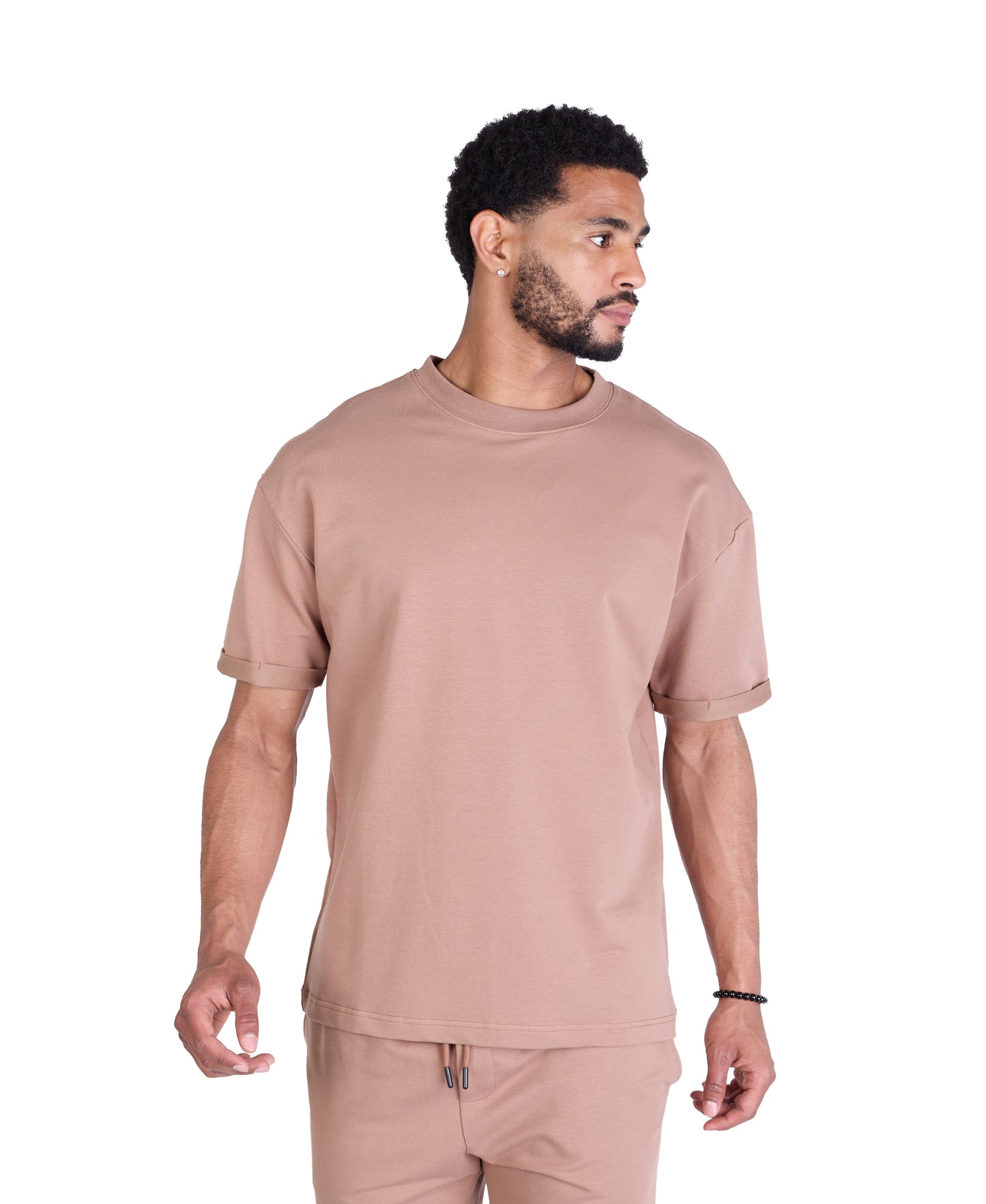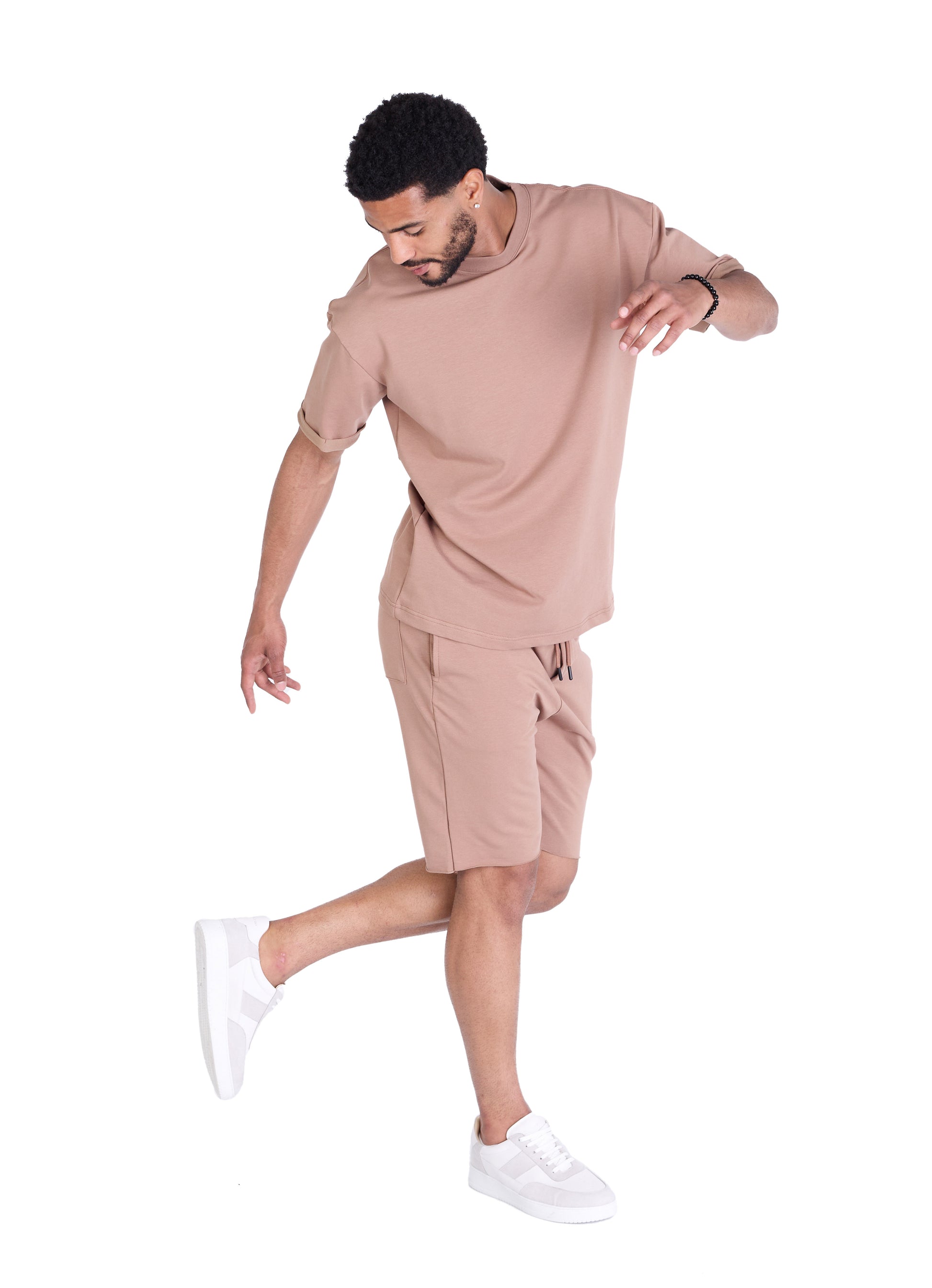 - Braun (T-Shirt mit gekrämpelten Ärmeln, Hose mit offenem Beinabschluss)