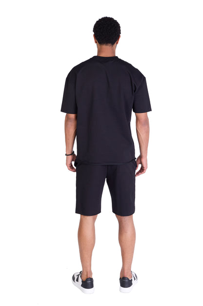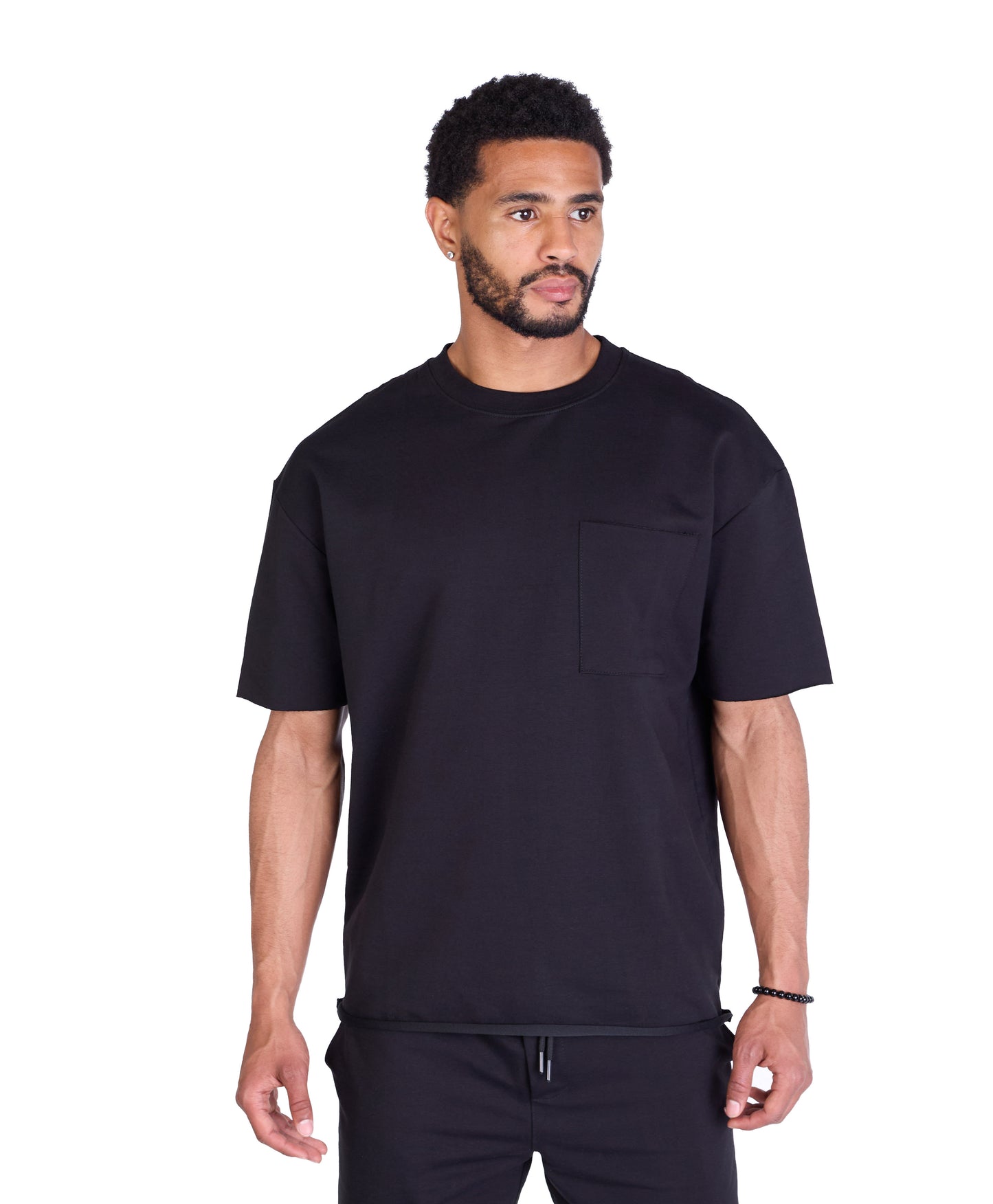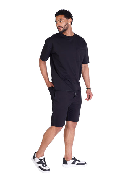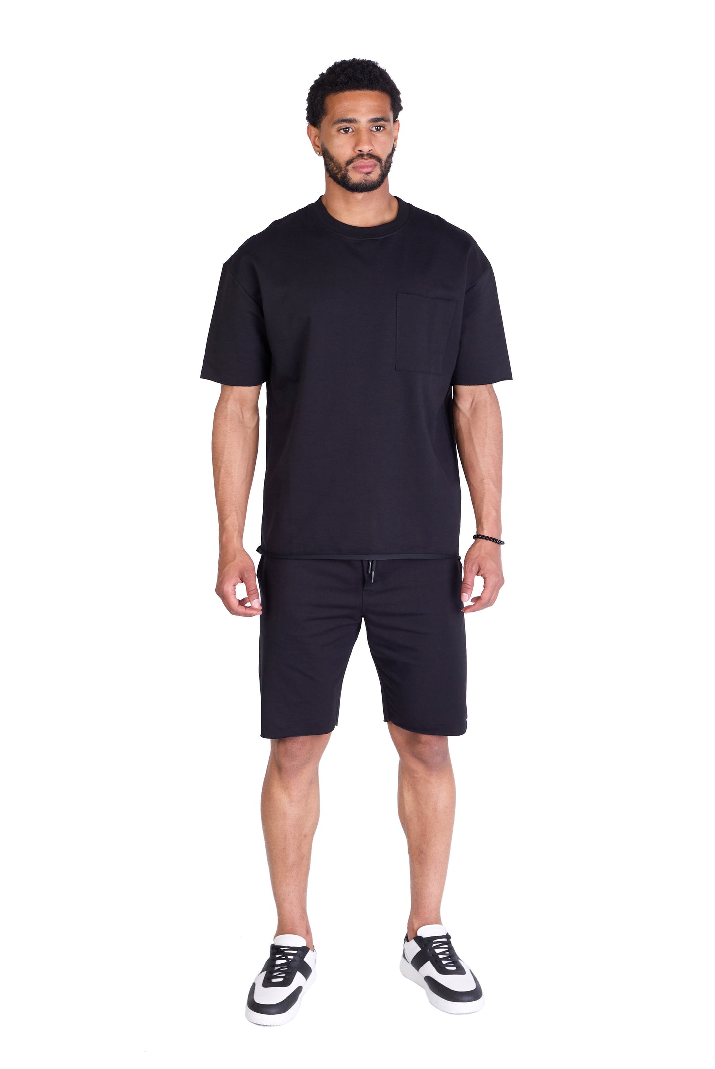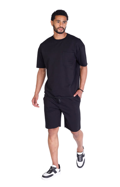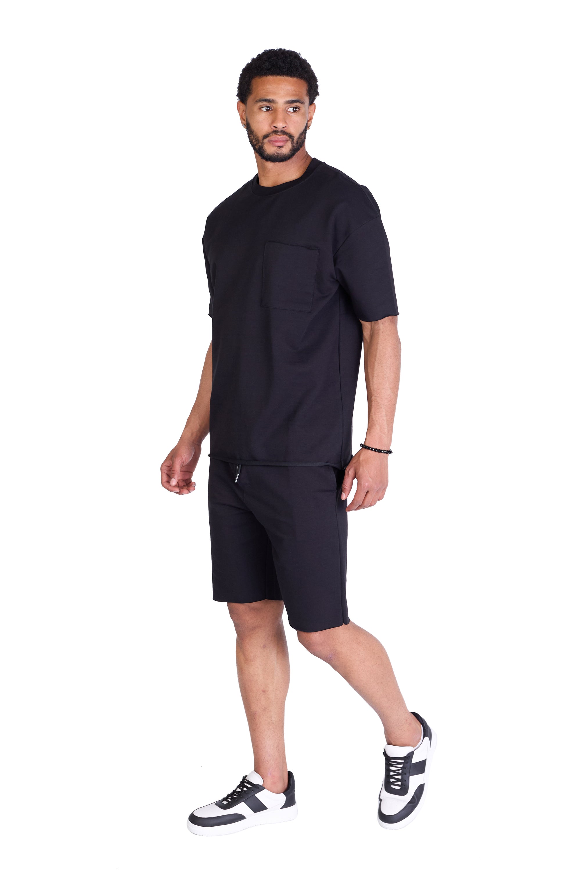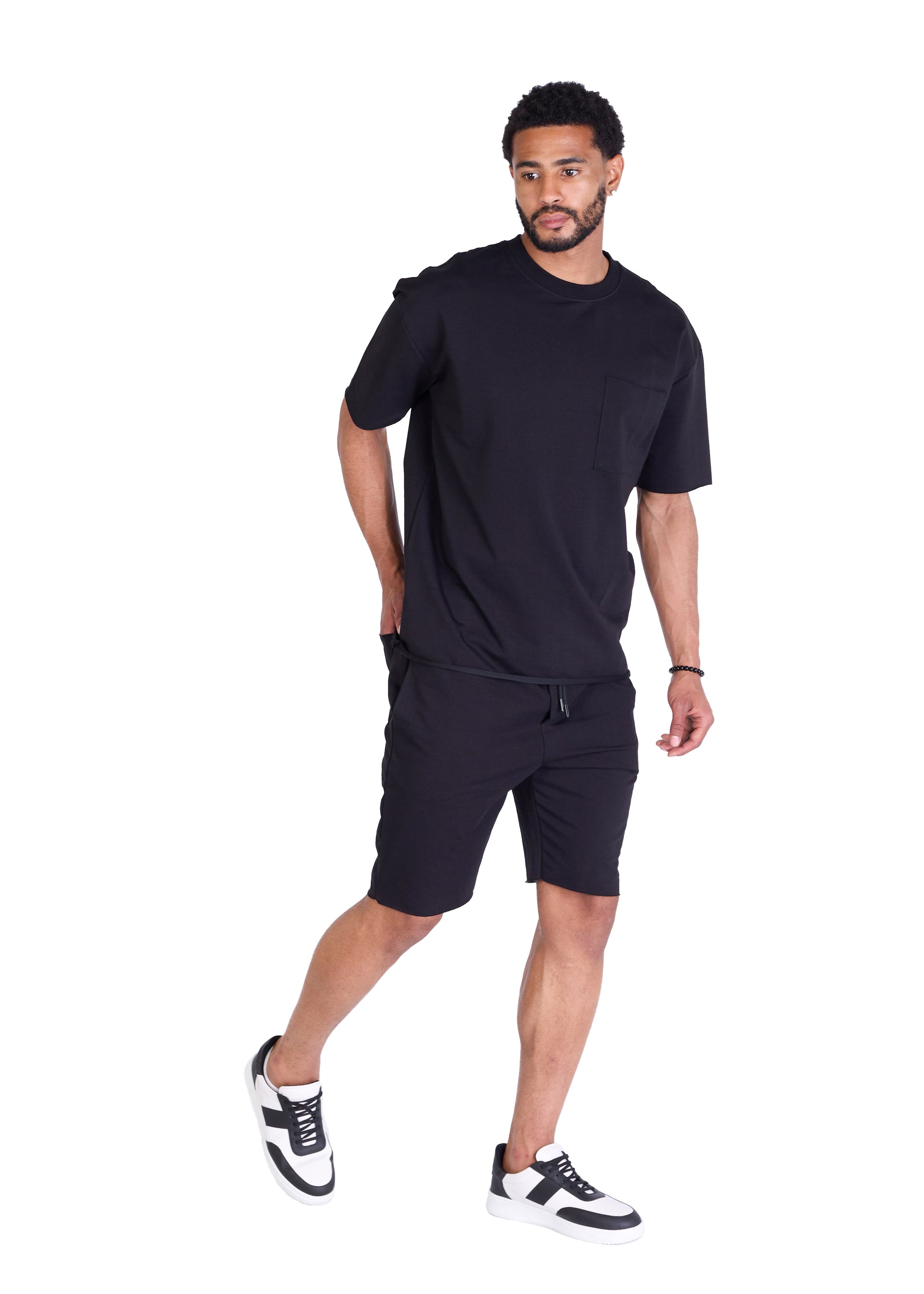 - Schwarz: Das T-Shirt ist mit einer praktischen Brusttasche und offenen Ärmelbündchen ausgestattet. Die Hose hat ebenfalls einen offenen Beinabschluss.
