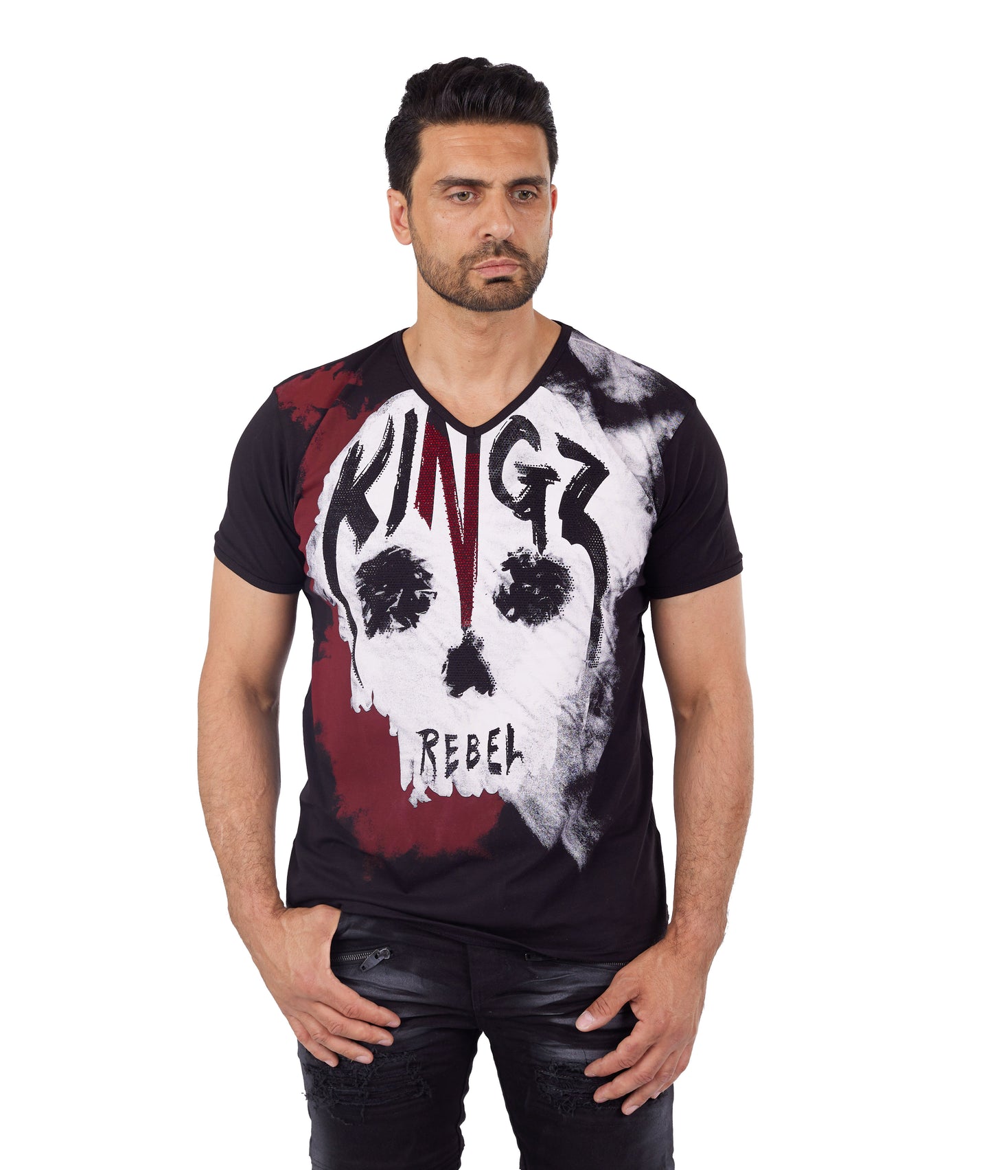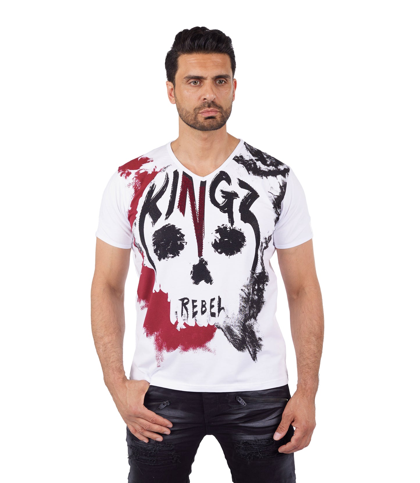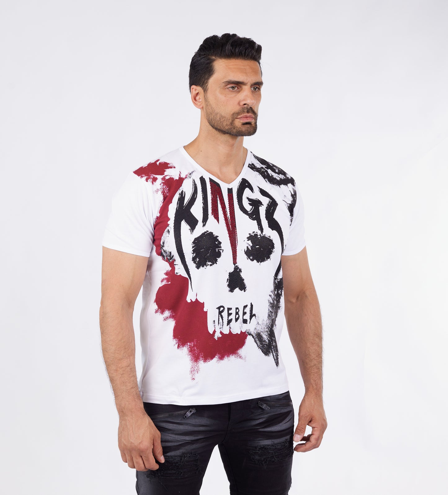 This stylish regular fit T-shirt is an absolute must-have for every fashion-conscious man. The V-neck ensures a casual look, while the KINGZ skull with the slogan REBEL and the KINGT rhinestone lettering print on the back are a real highlight. The T-shirt is available in two colors: white and black.
