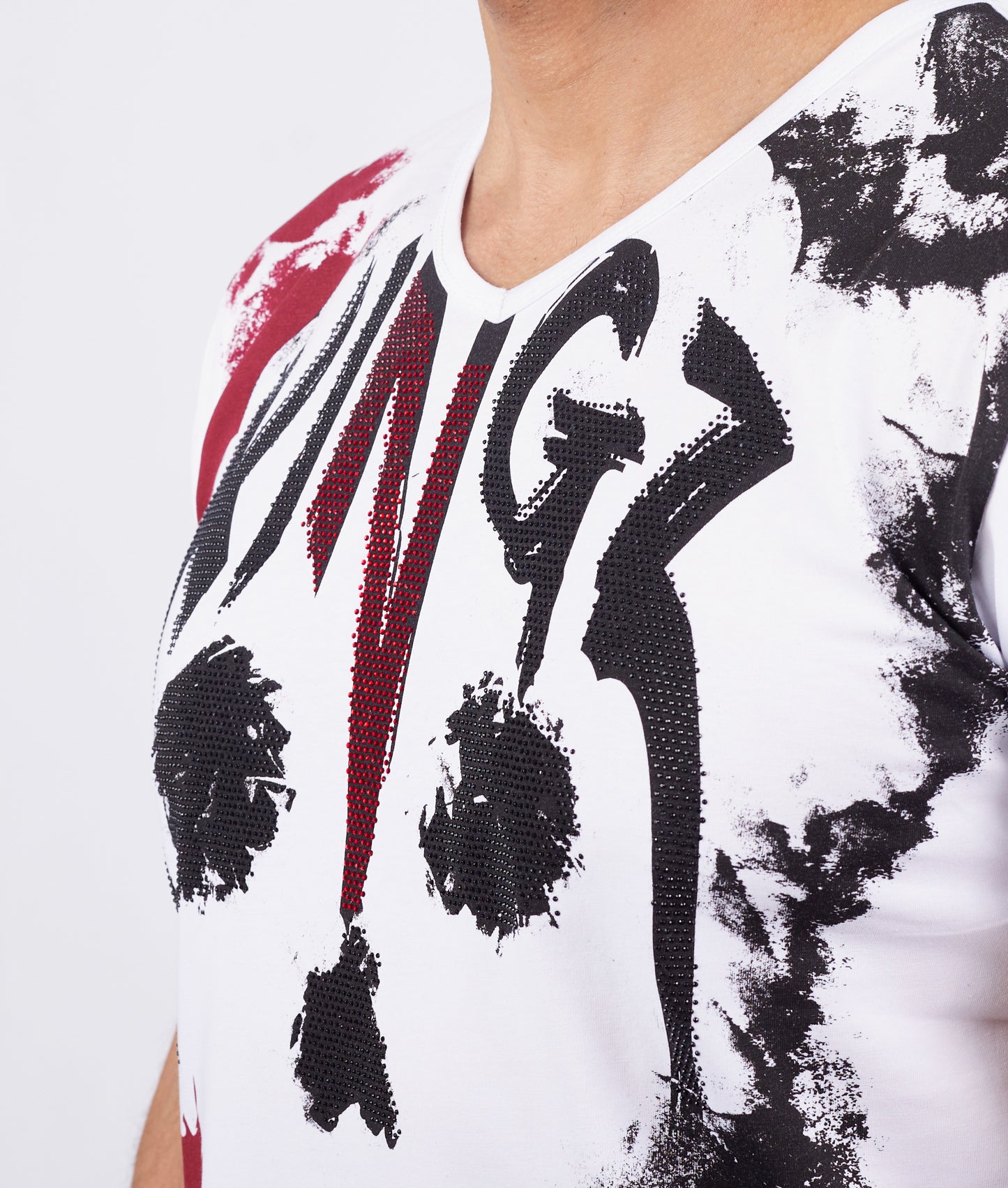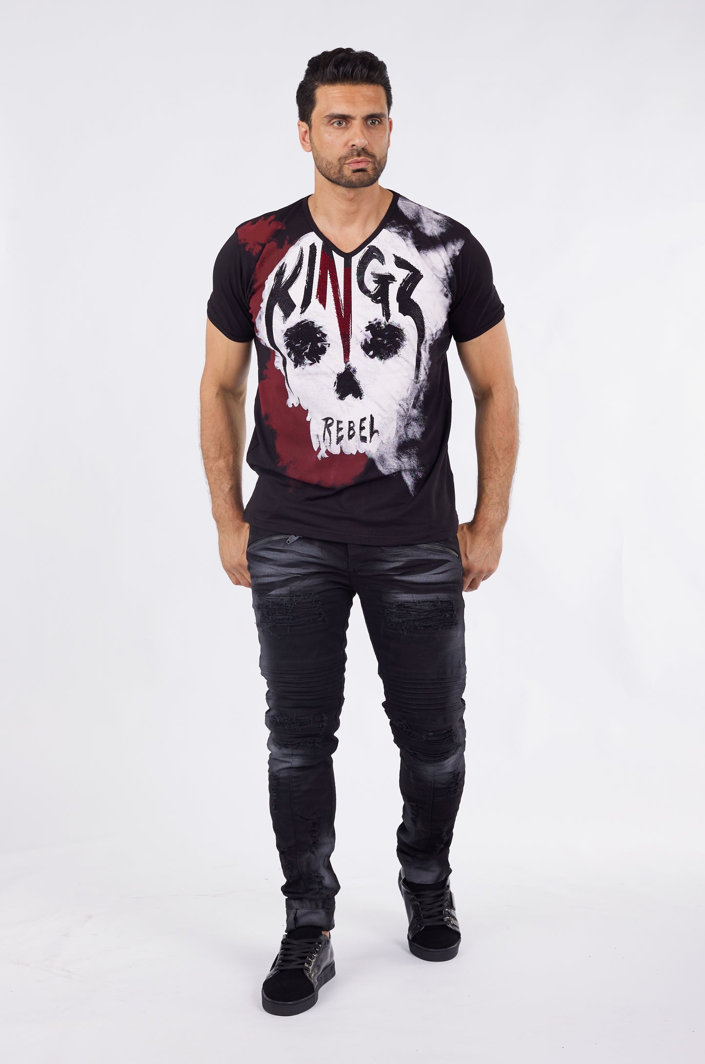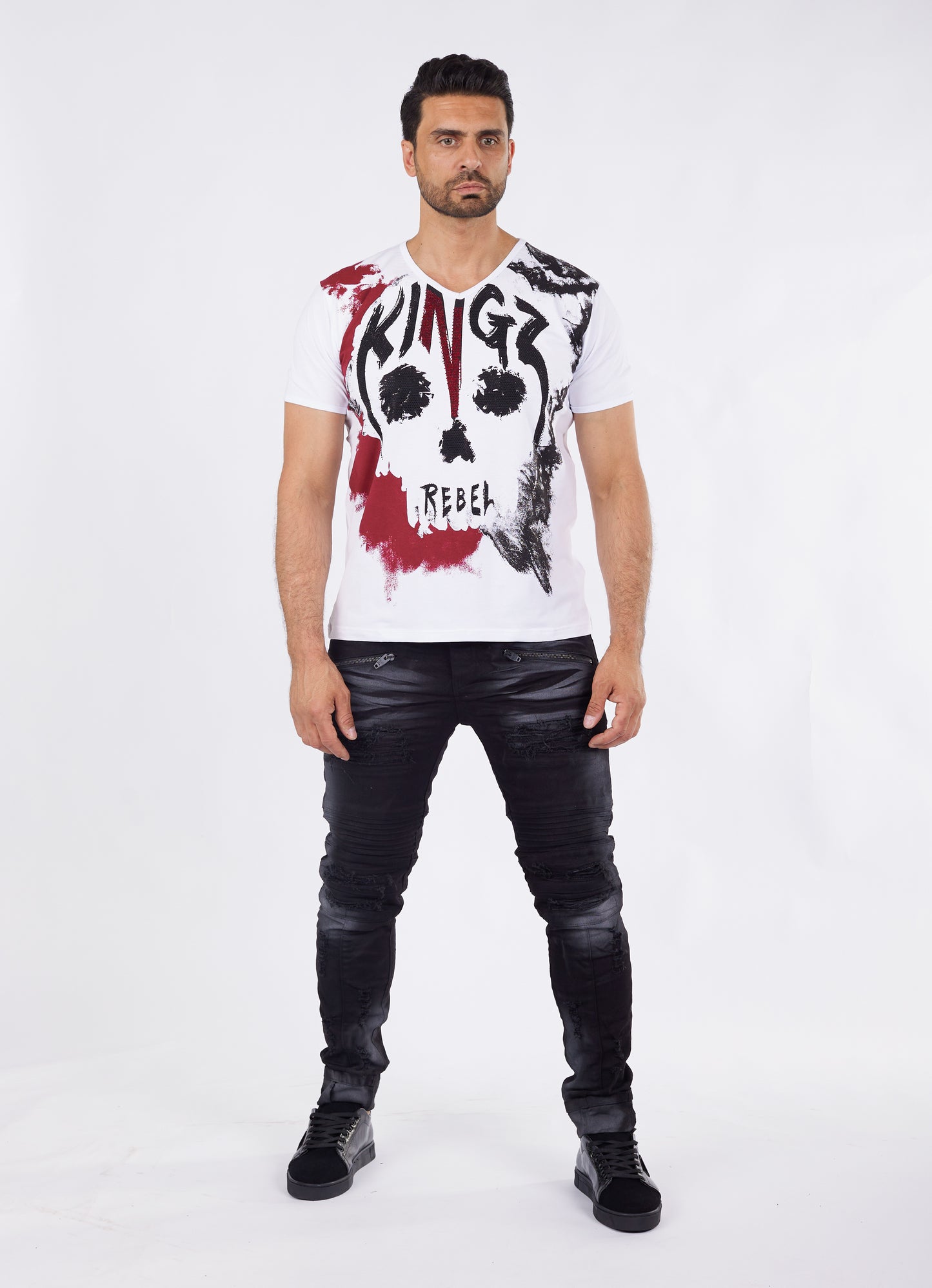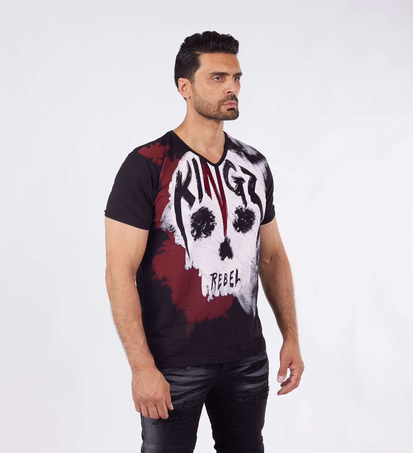 This stylish regular fit T-shirt is an absolute must-have for every fashion-conscious man. The V-neck ensures a casual look, while the KINGZ skull with the slogan REBEL and the KINGT rhinestone lettering print on the back are a real highlight. The T-shirt is available in two colors: white and black.