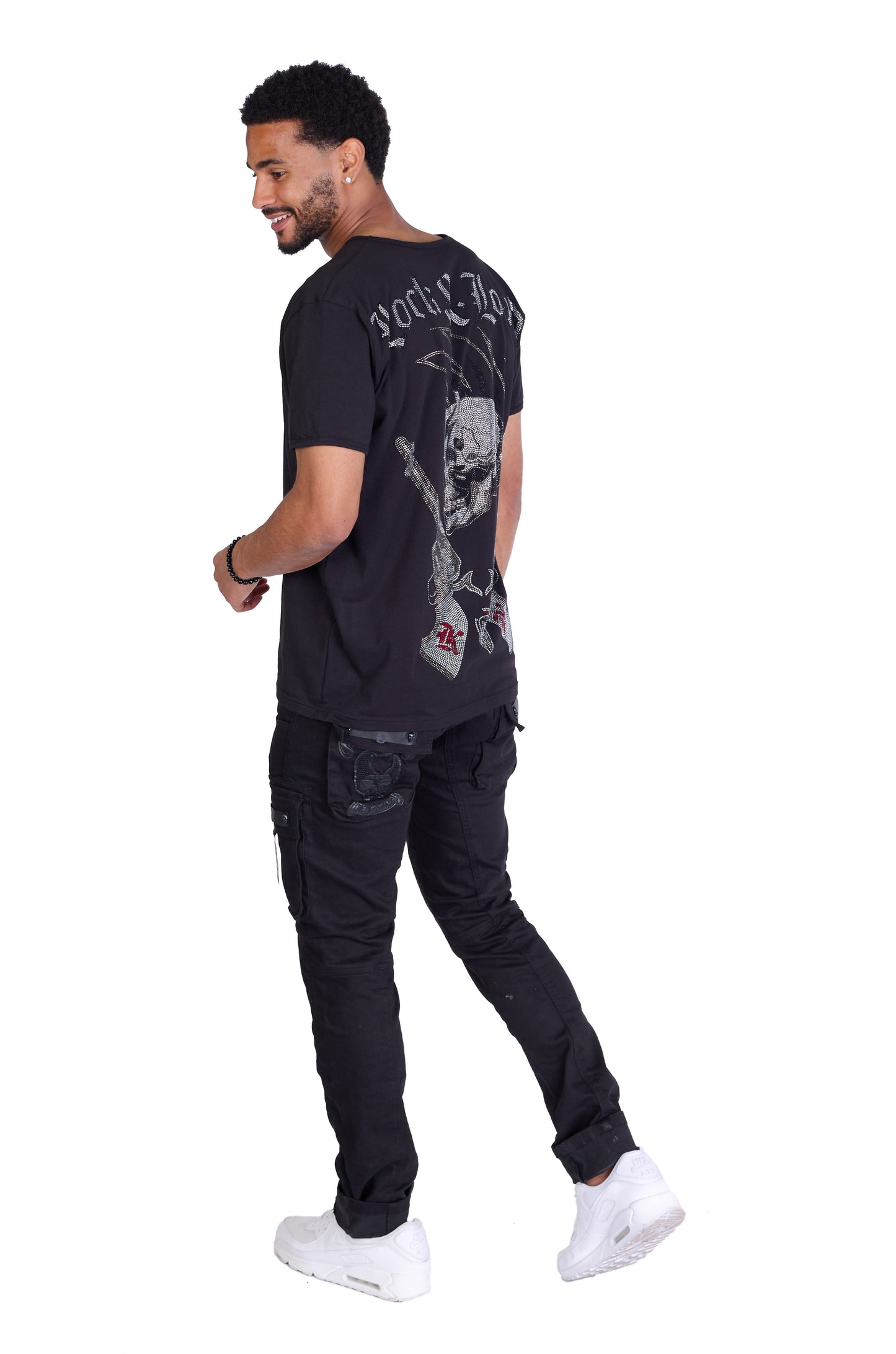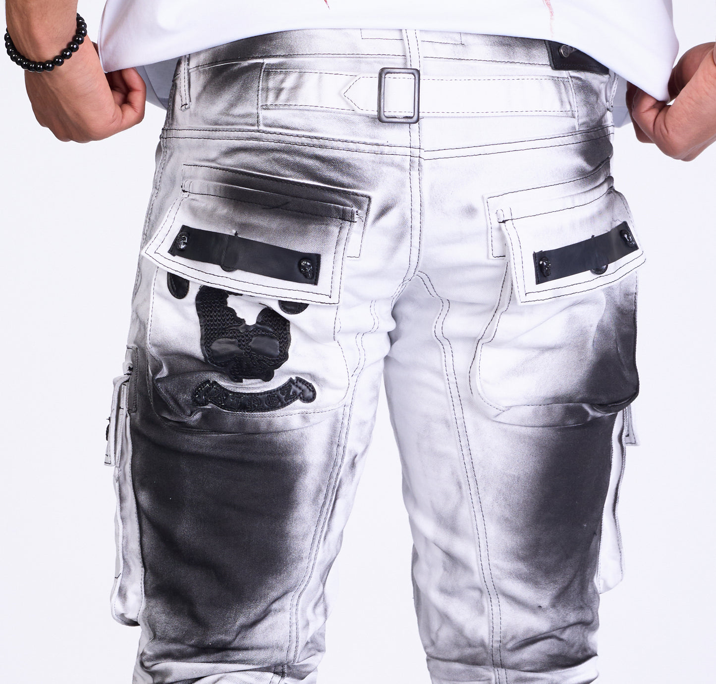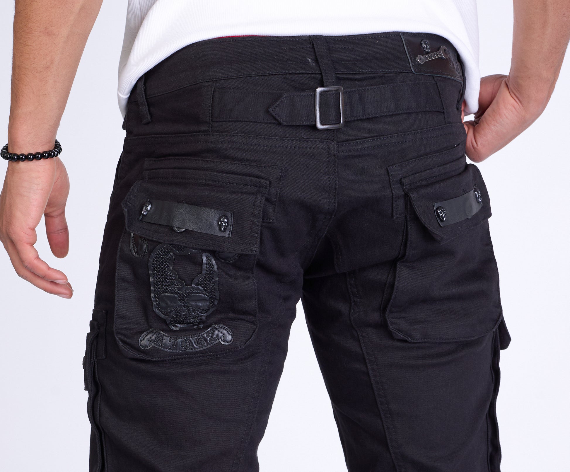 Studded trouser pockets: The trouser pockets are decorated with studs and provide a cool and rocky touch.