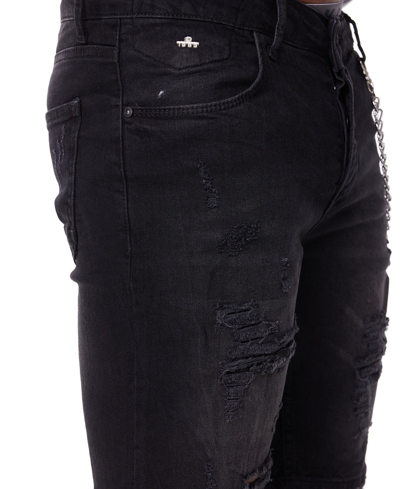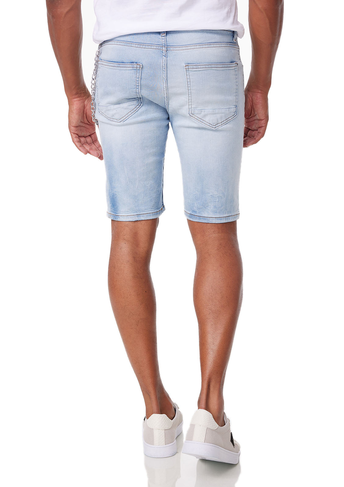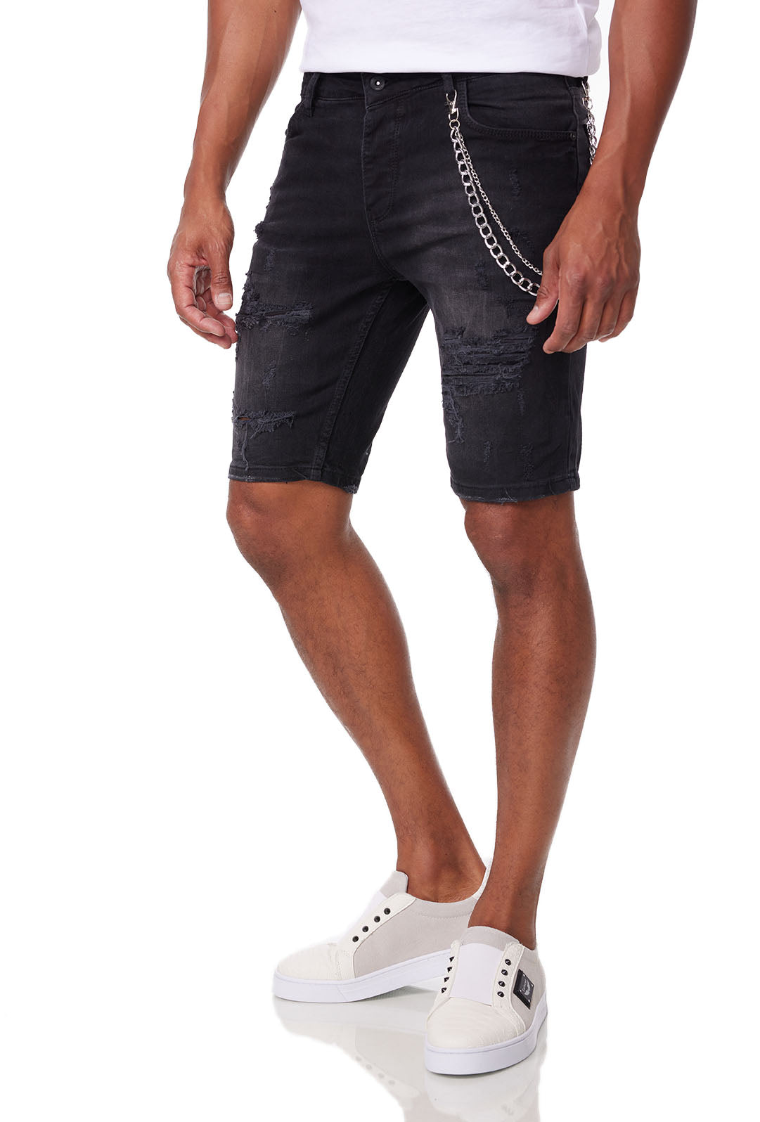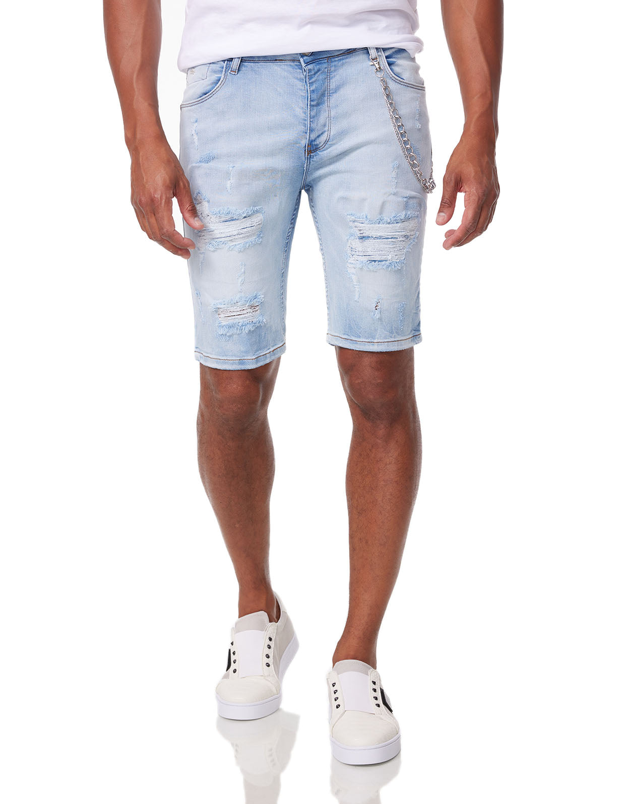 Men's SLIM-FIT denim shorts in a used look with fashionable trouser chains in a cool wash and concealed button placket. Great comfort thanks to the material mix of 98% cotton, 2% elastane. Ideal for combining with unusual summer styles. Your perfect companion through the summer. Available in light blue or black.