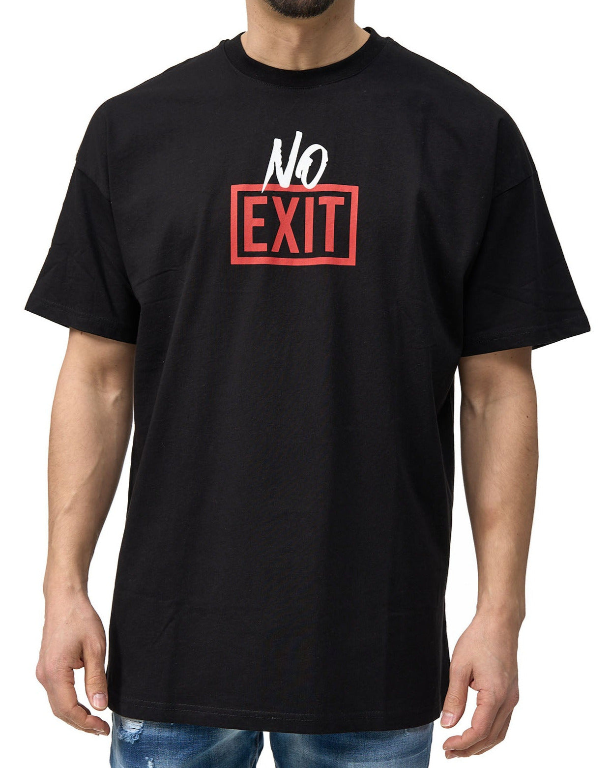 T-shirts for fashionable men with "NO EXIT" print on the front. In the oversize look with dropped shoulders , which means that the shoulder seam is a little lower than usual. This makes it look very casual. The wide shoulders make your look super tough and strong. Made of high quality cotton material, the men's t-shirt is durable for your daily wear. T-shirt is ideal to combine with jeans outfits or sporty looks, it is timeless, modern and stylish at the same time. Available in two colors: white or black.
