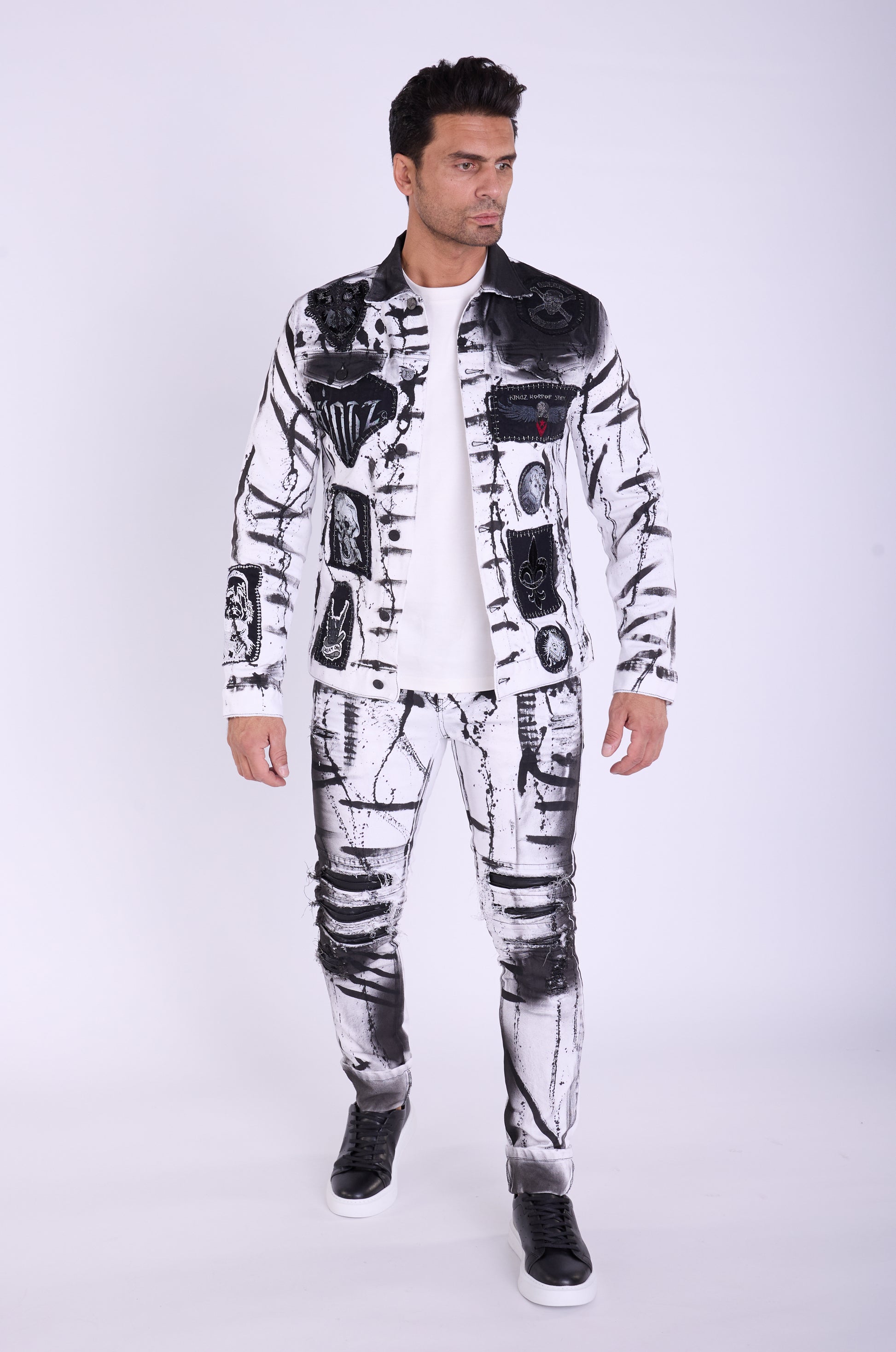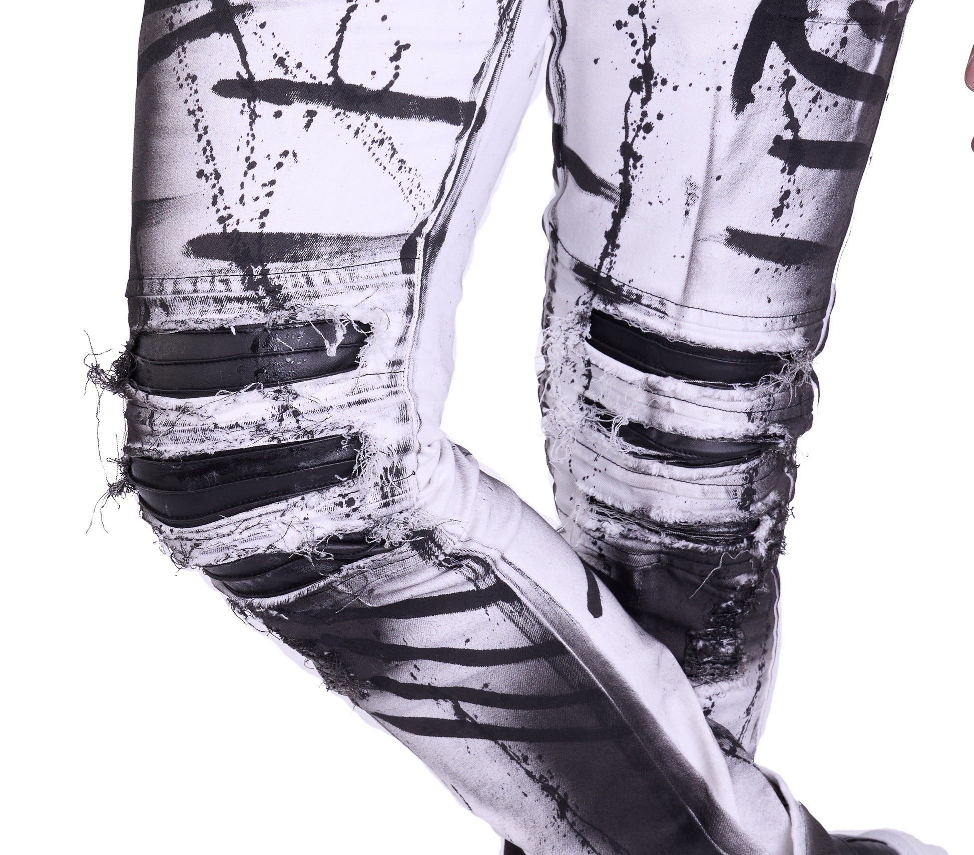 KINGZ Herren Designer Biker Jeans, Slim Fit, Modell 1505-2, White/Black