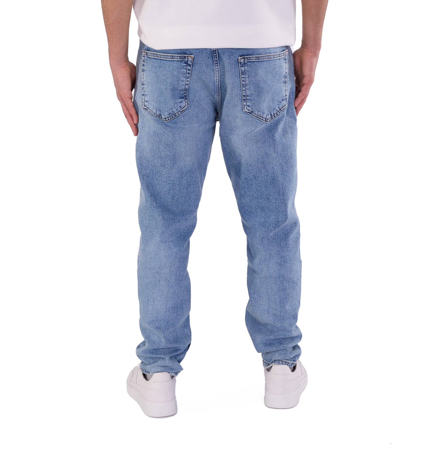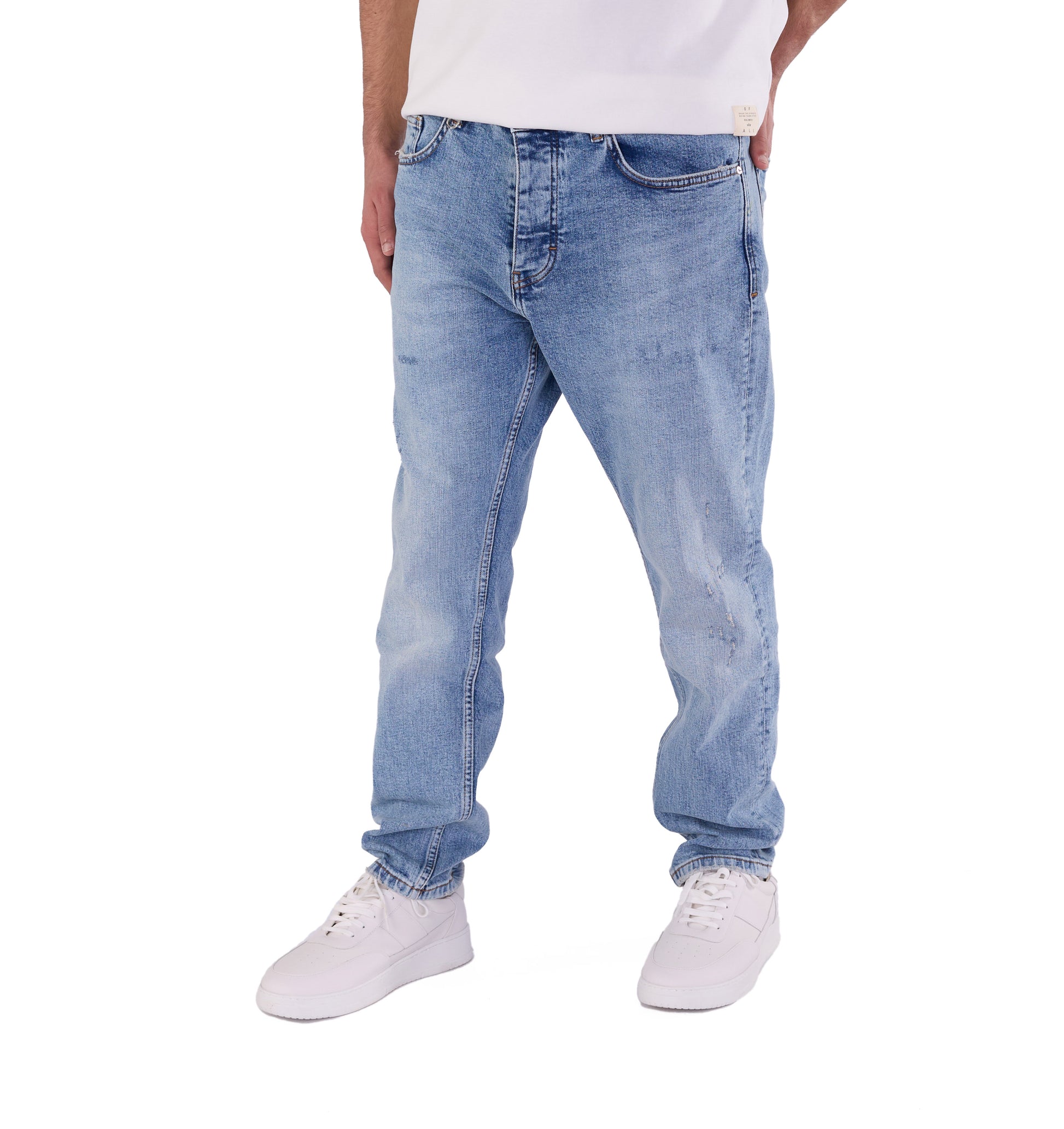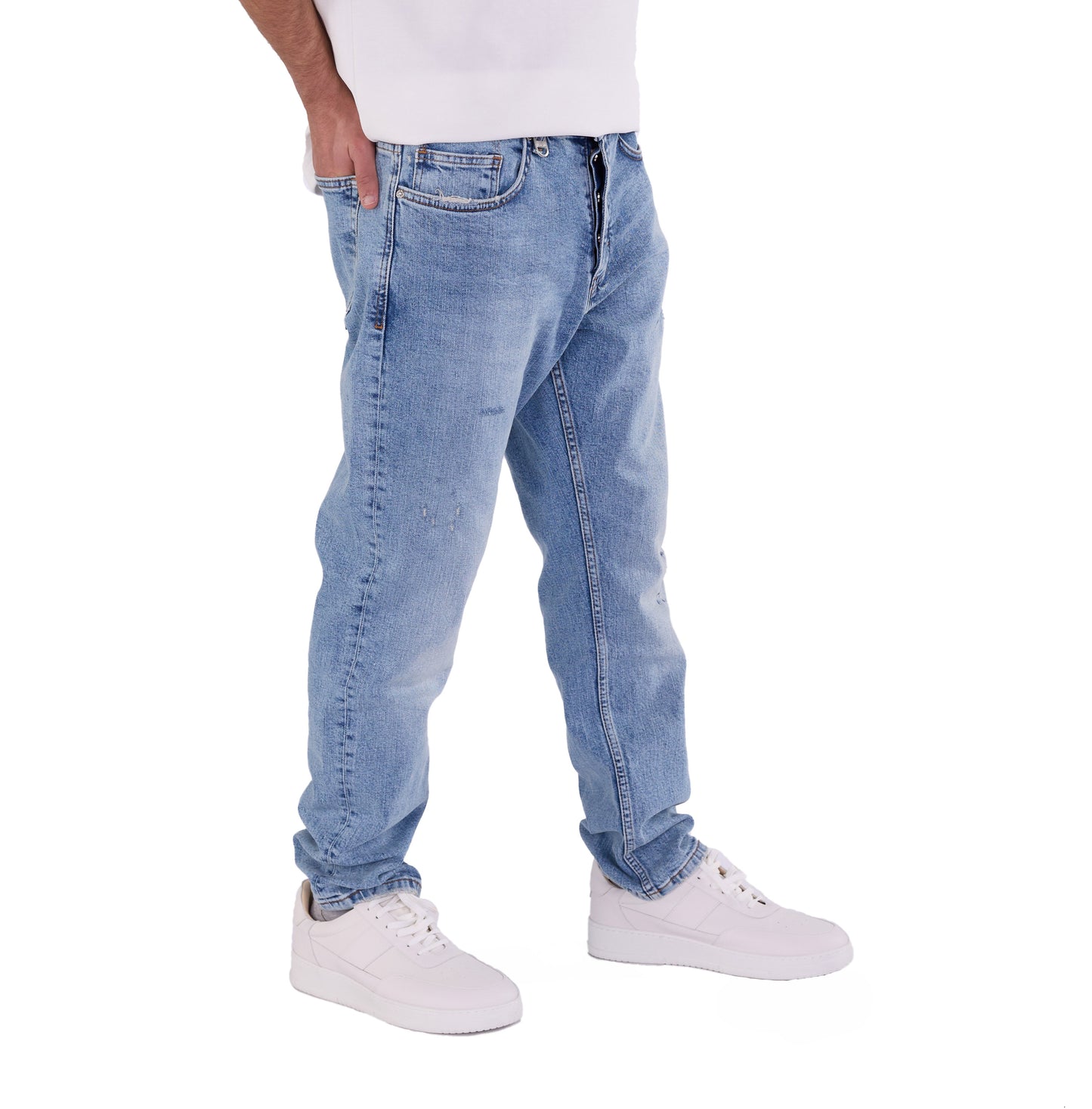 Die Herren-Boyfriend-Jeans ist in den Farben Sky Blue, Light Blue, Blue, Dark Blue und Schwarz erhältlich. Sie können aus den Größen 30, 31, 32, 33, 34 und 36 wählen. Unser Modell ist 1,85 m groß und wiegt 85 kg. Es trägt Größe W33/L32, was Ihnen als Größenhinweis dienen kann.