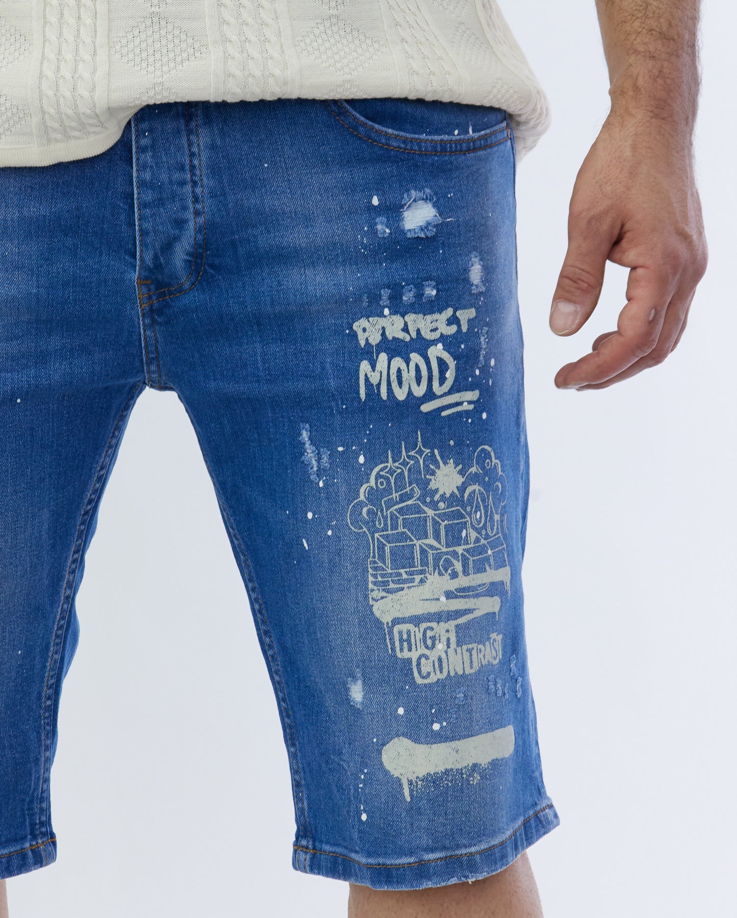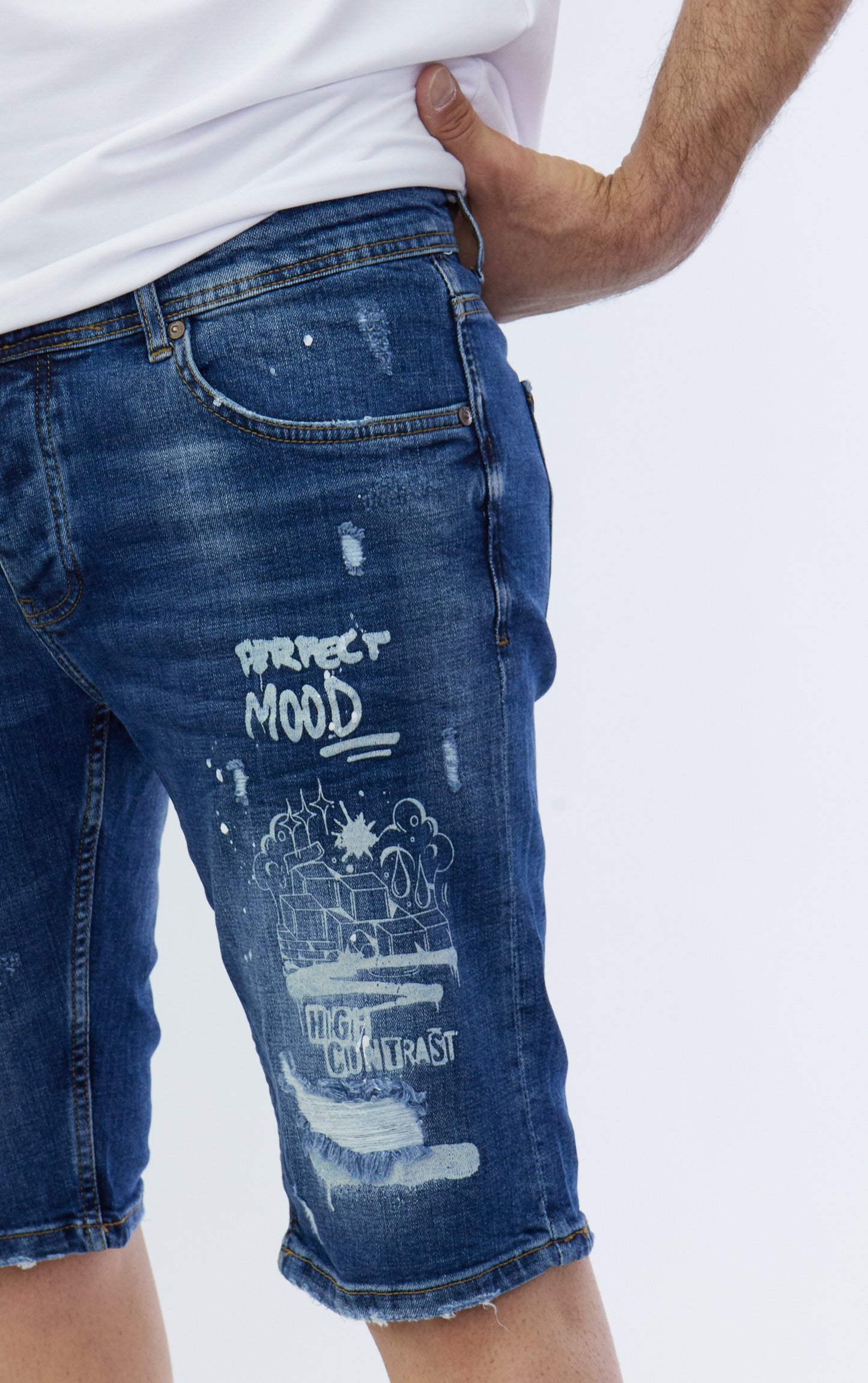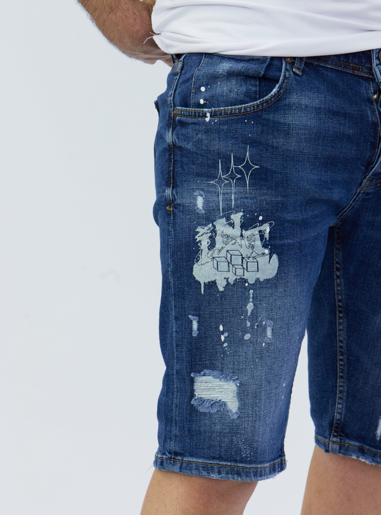 Herren Jeans Shorts in Blau - Destroyed Effekt & Used Look mit Print