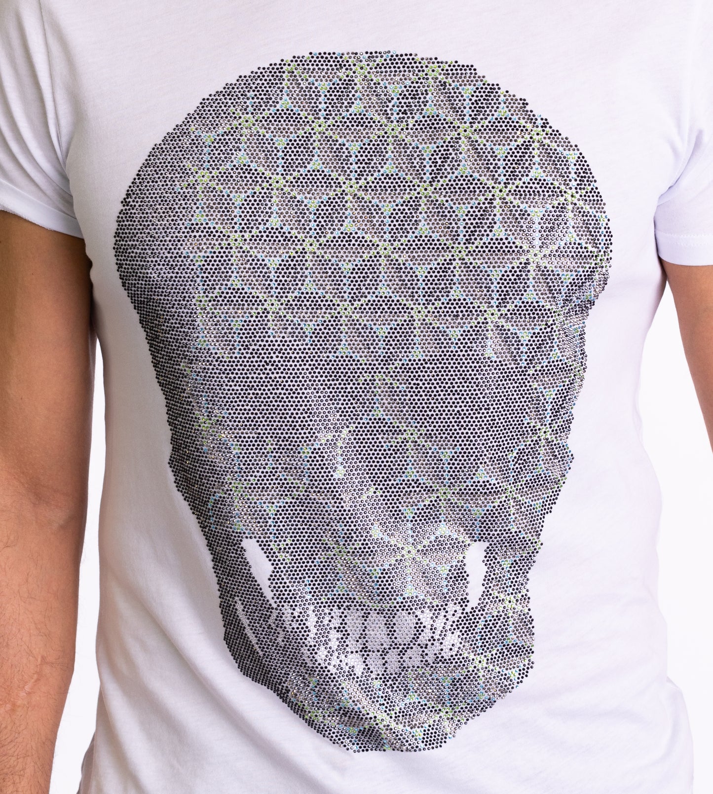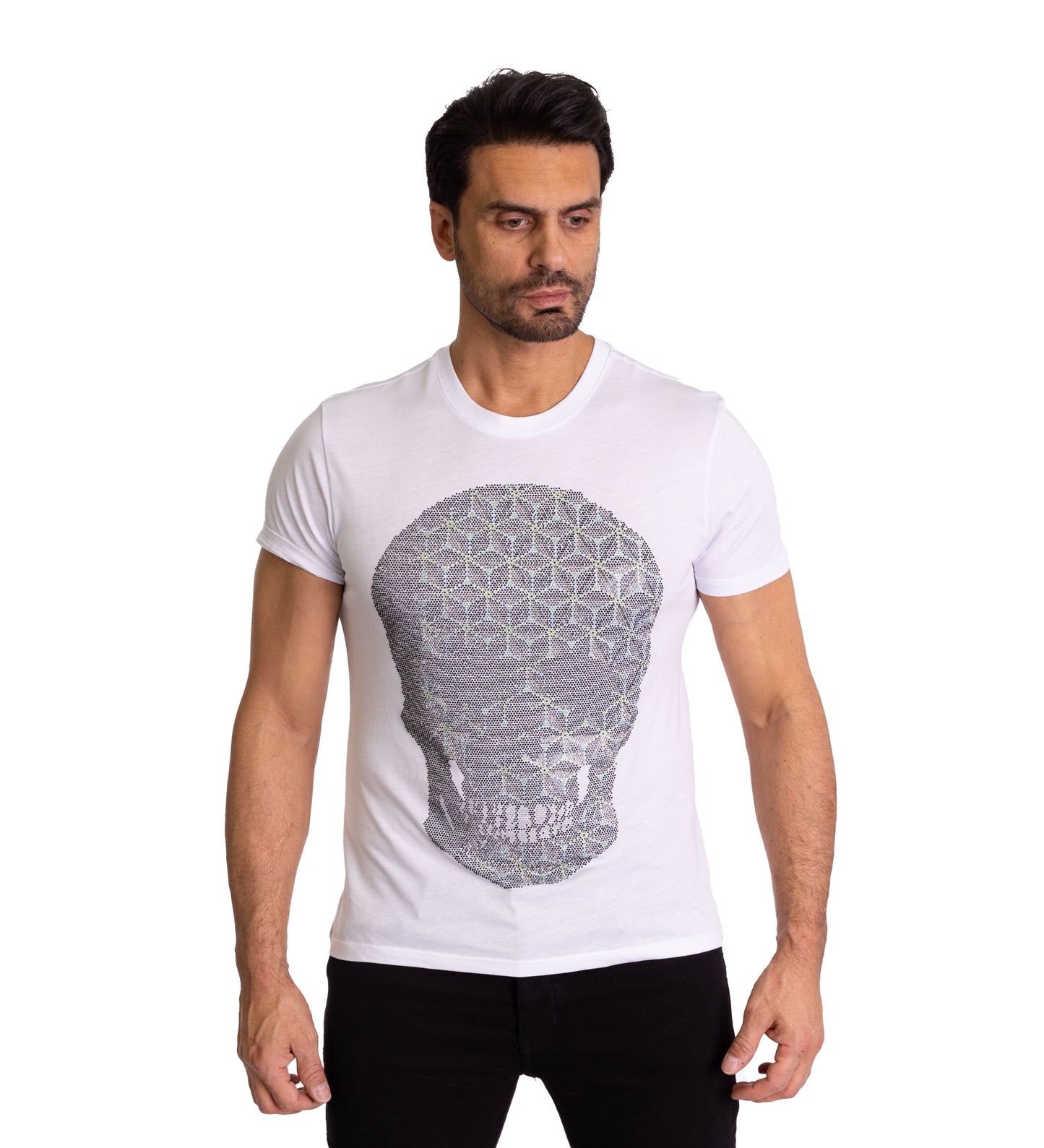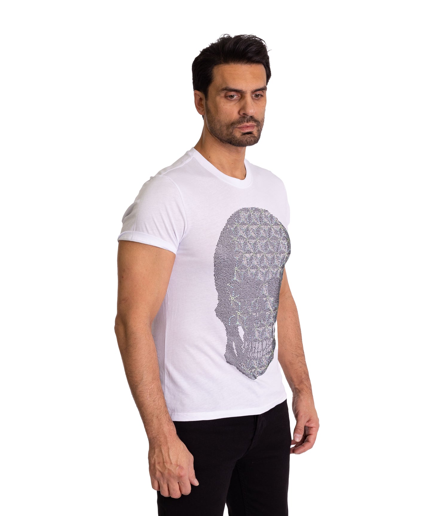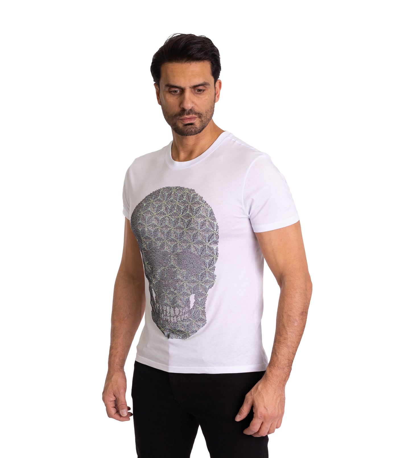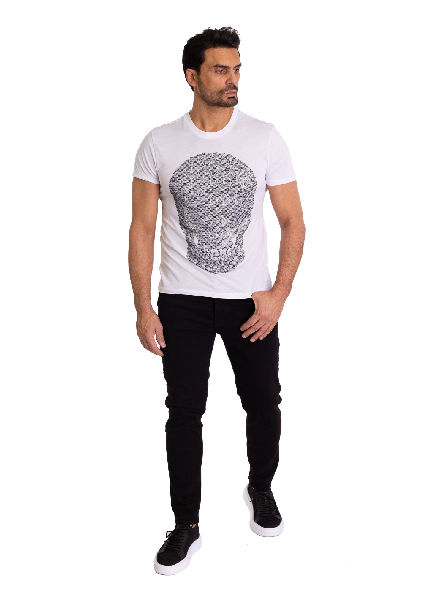Dieses weiße Herren-T-Shirt ist mehr als nur ein Kleidungsstück – es ist ein Ausdruck deiner Persönlichkeit. Der große Totenkopf, verziert mit einem aufwendigen geometrischen Muster aus funkelnden Strasssteinen, ist ein Meisterwerk der Handwerkskunst. Die hochwertigen Materialien und die präzise Verarbeitung machen dieses T-Shirt zu einem besonderen Begleiter. Der körperbetonte Schnitt aus 100% Baumwolle sorgt für eine perfekte Passform. Vervollständige deinen rockigen Look mit einer lässigen Jeans oder einer edlen Lederjacke.