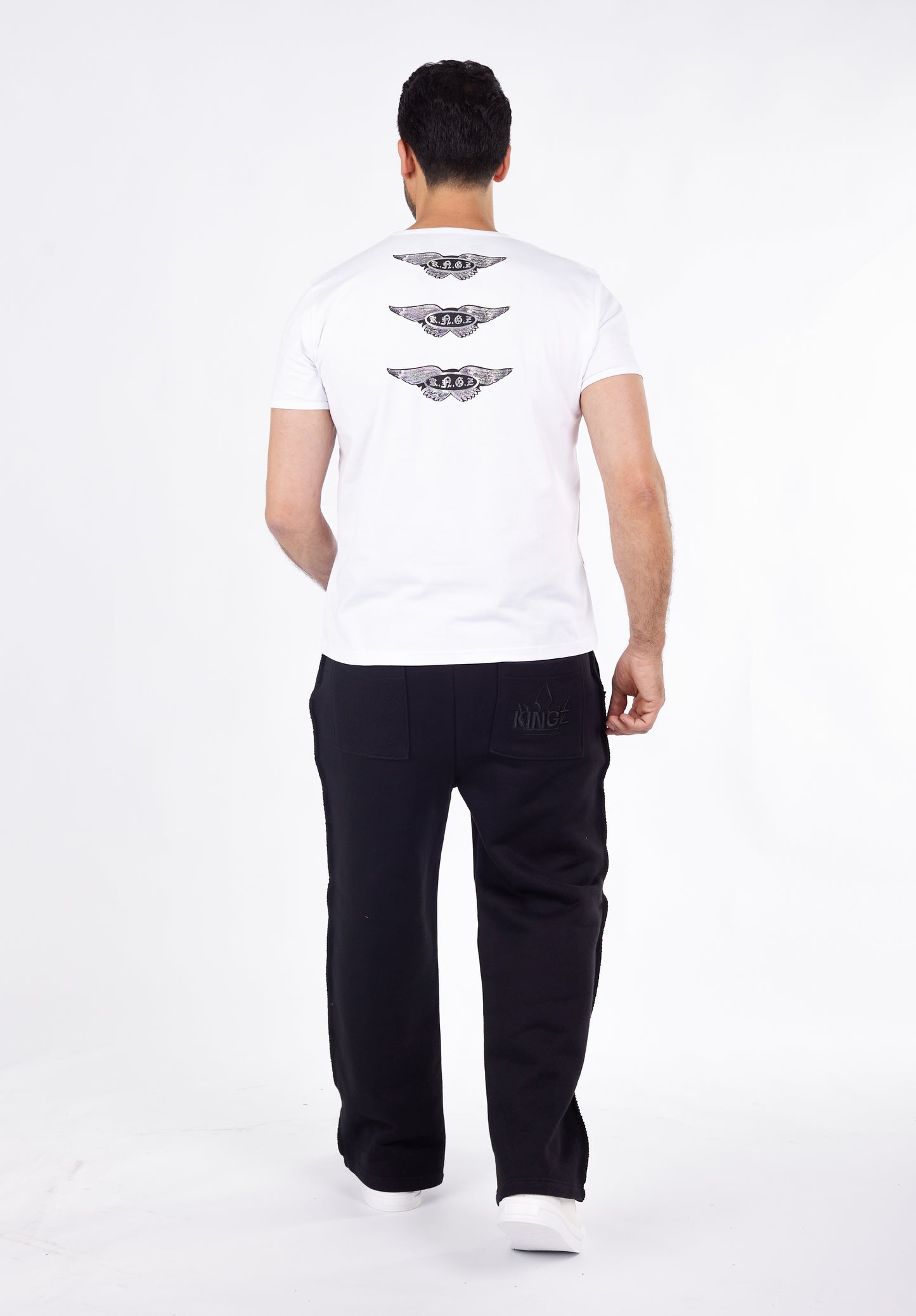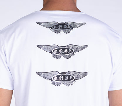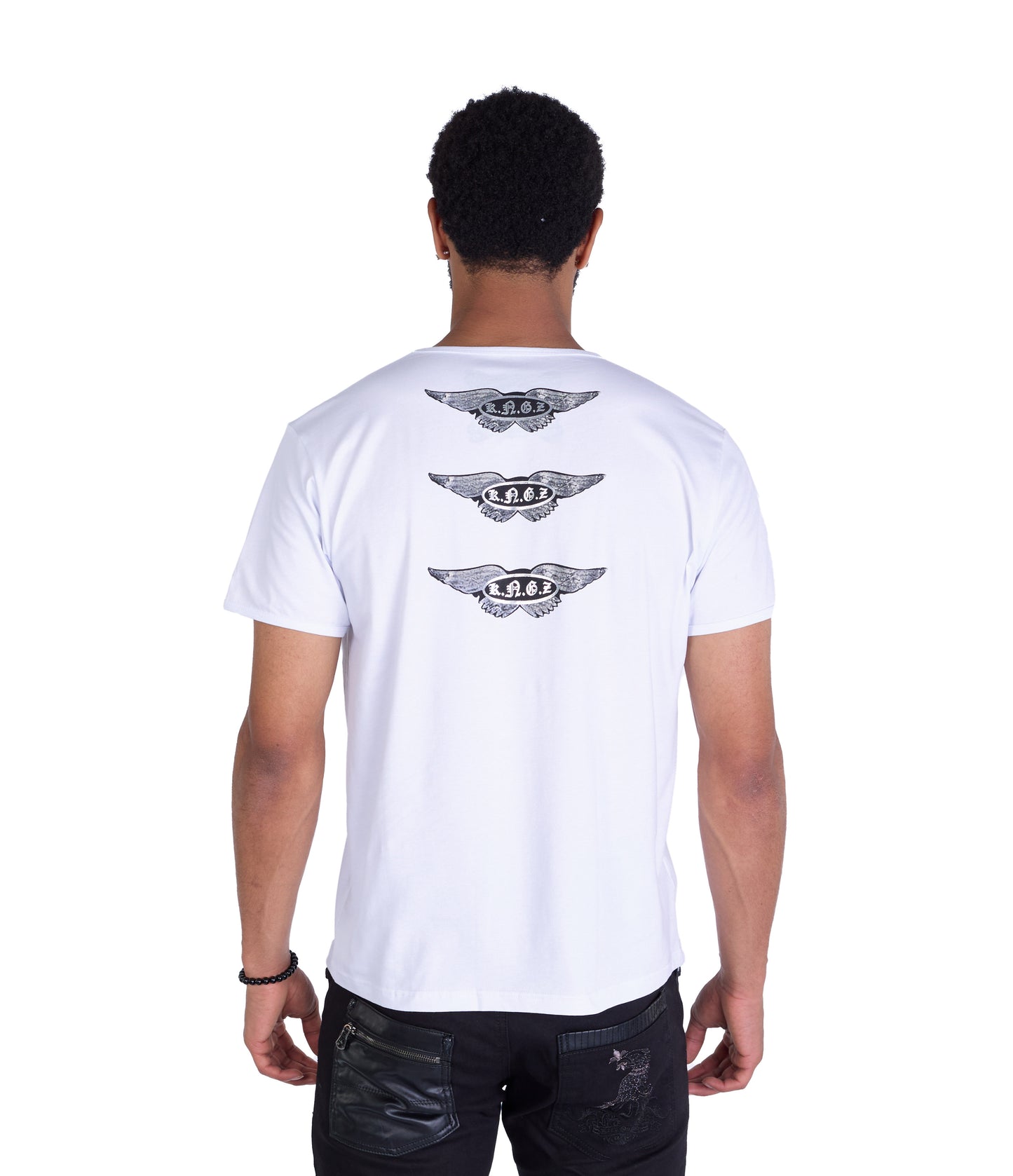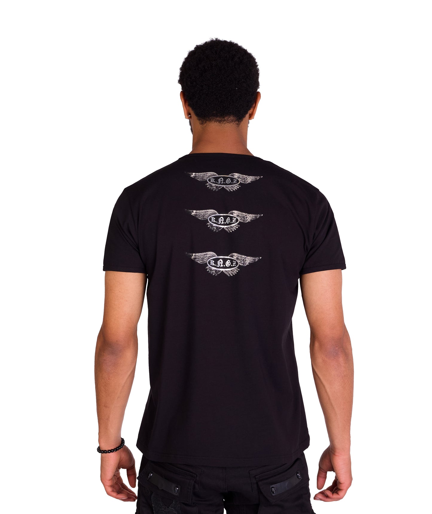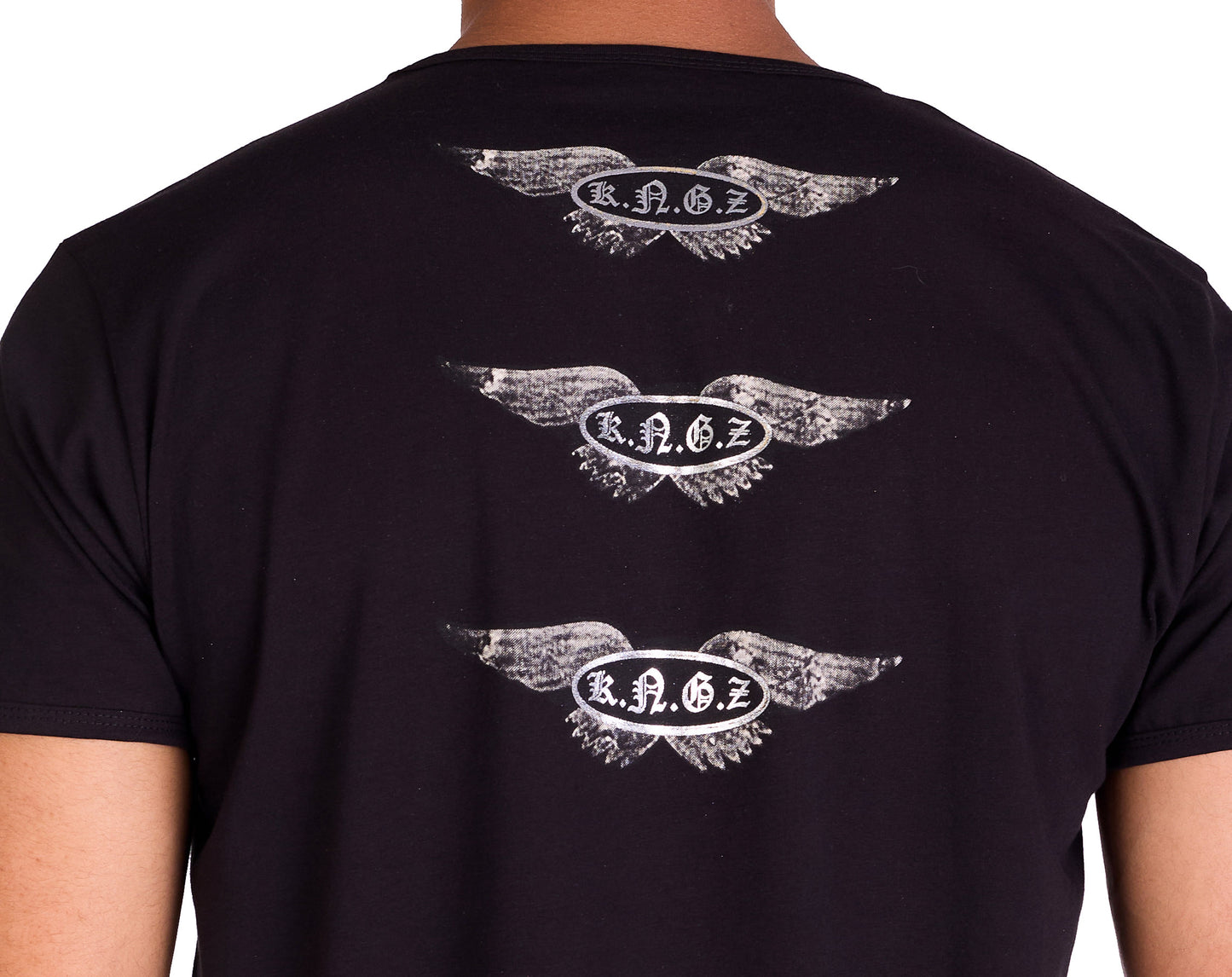 - Detailreicher Rückenprint: Die Rückseite zieren drei stilisierte Doppelflügel untereinander, die dem Shirt eine besondere Note verleihen.