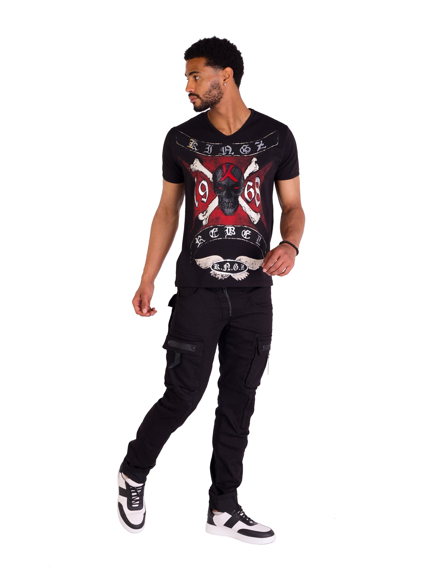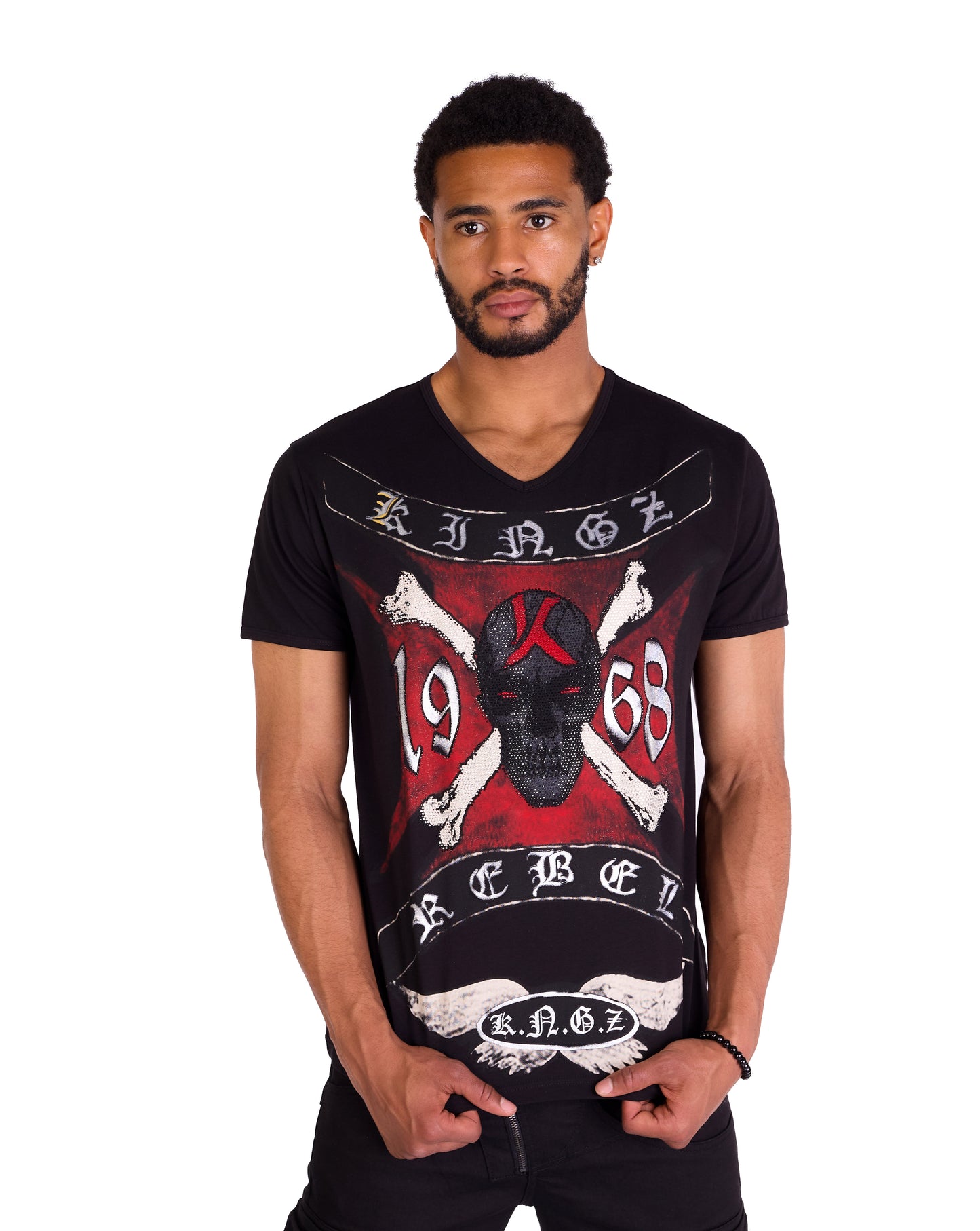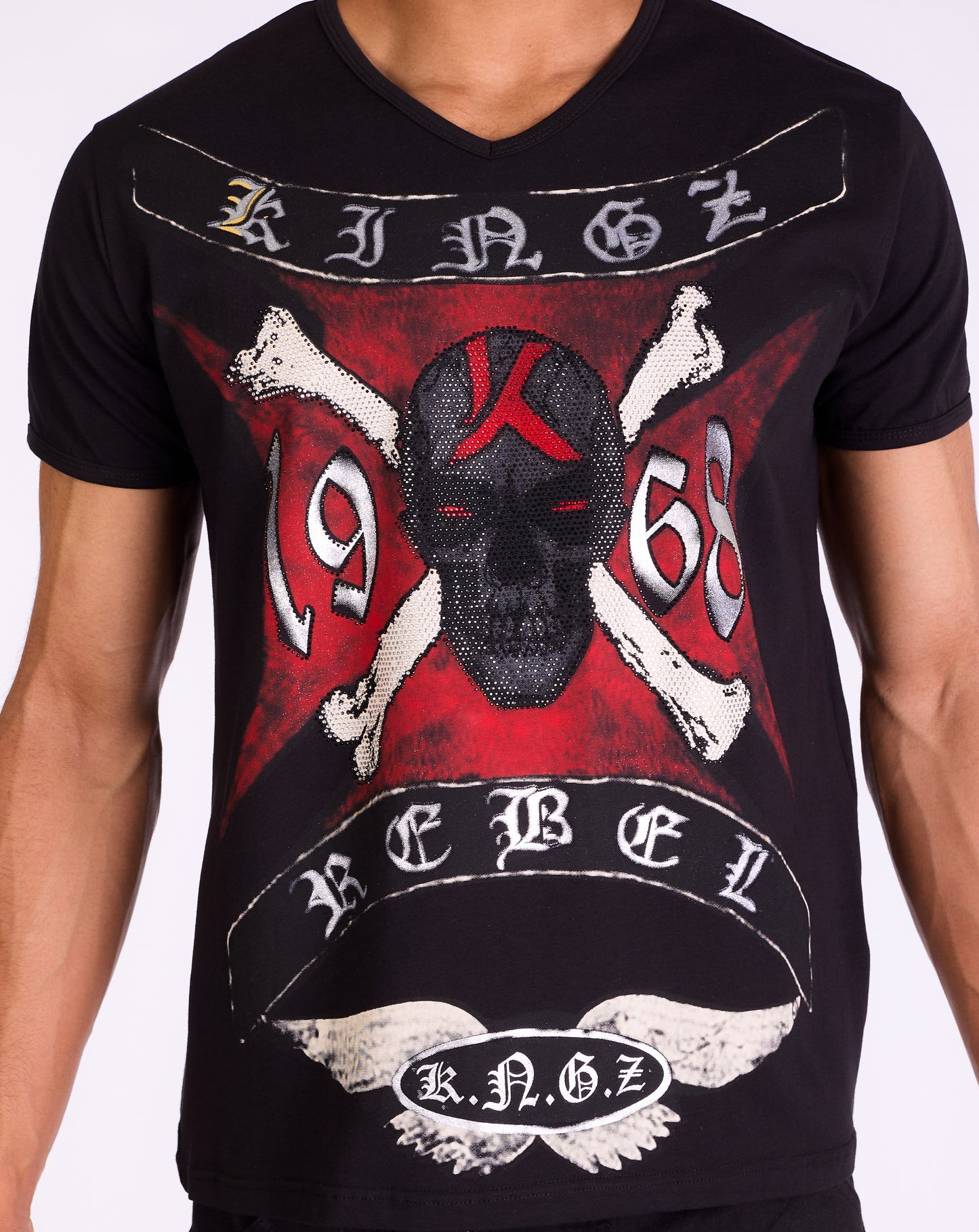 - Eyecatcher Totenkopf-Design: Ein lässiger Totenkopf, kunstvoll mit Strasssteinen besetzt, thront auf der Vorderseite und wird von den Schriftzügen "KINGZ" und "Rebel" umrahmt.