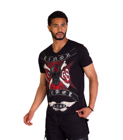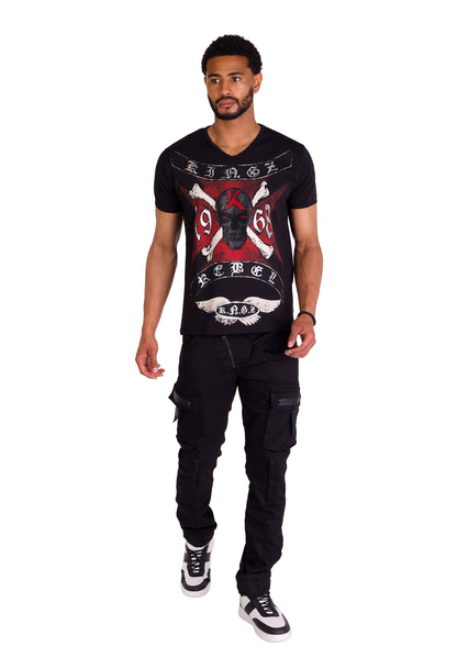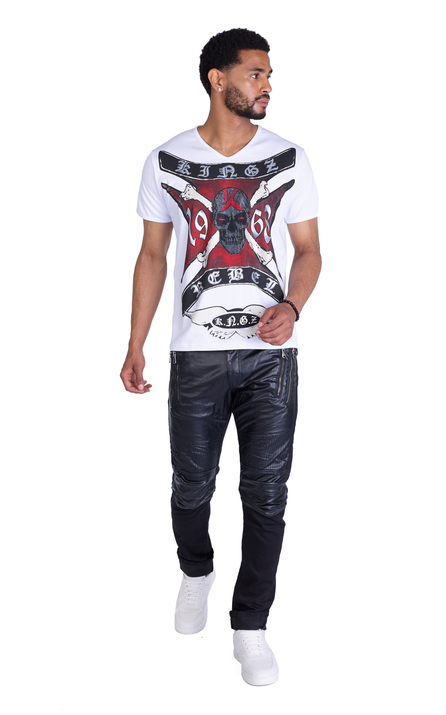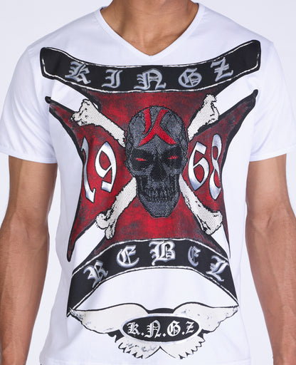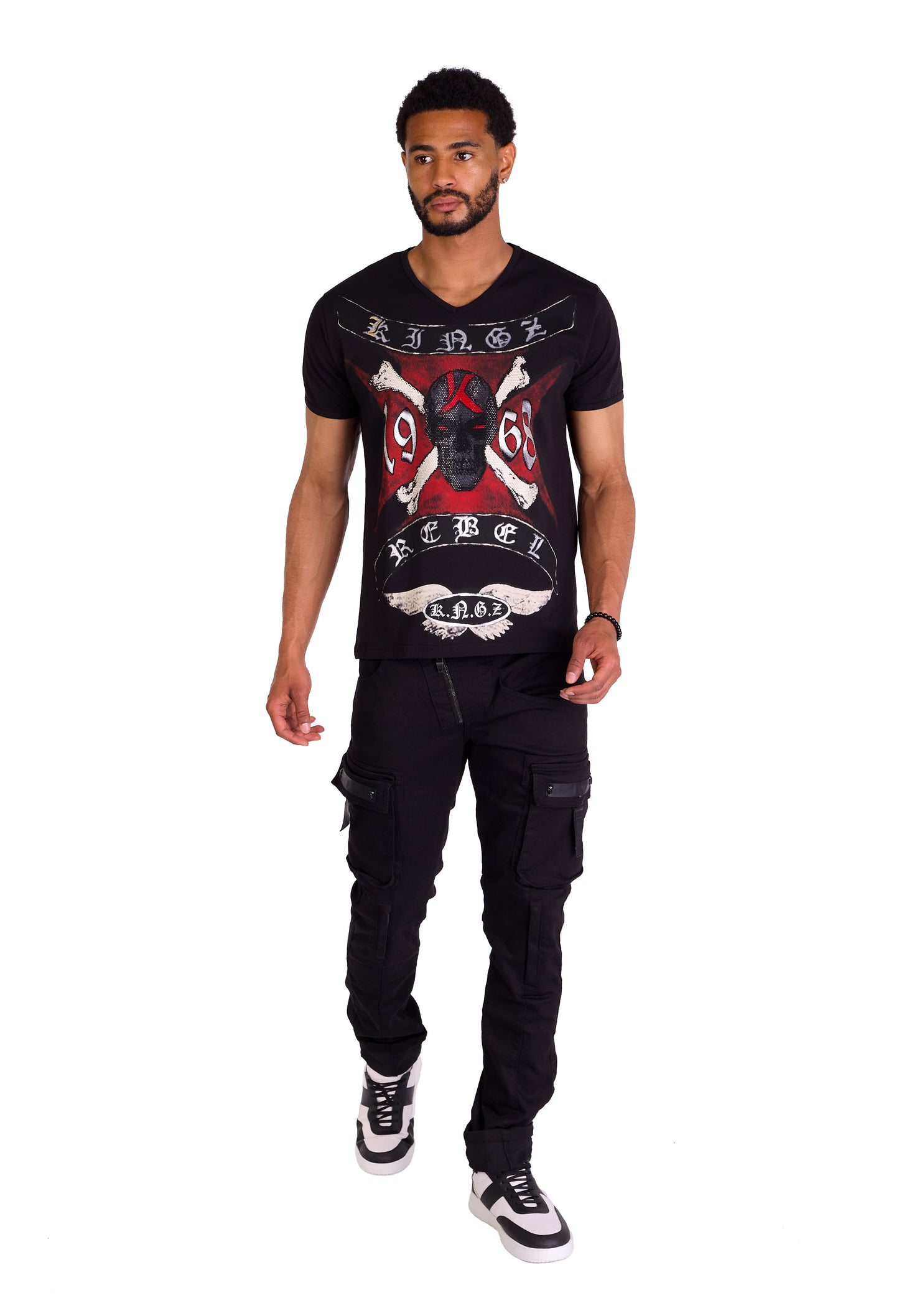 - Eyecatcher Totenkopf-Design: Ein lässiger Totenkopf, kunstvoll mit Strasssteinen besetzt, thront auf der Vorderseite und wird von den Schriftzügen "KINGZ" und "Rebel" umrahmt.