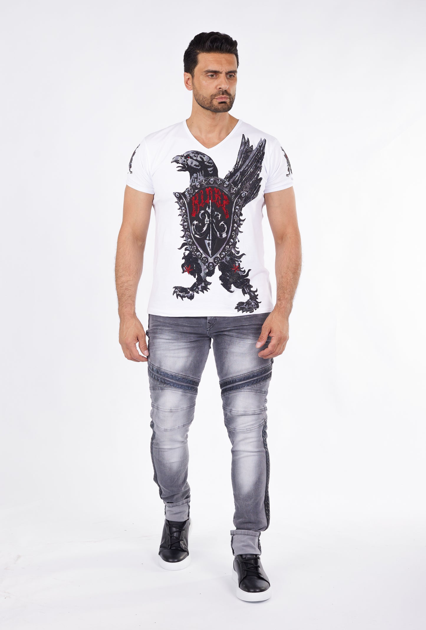 Setze ein starkes Statement mit diesem exklusiven Slim Fit T-Shirt von KINGZ. Das markante Adler- und Wappen-Design, veredelt mit funkelnden Strasssteinen, verleiht deinem Look eine einzigartige Mischung aus Stärke und Eleganz.