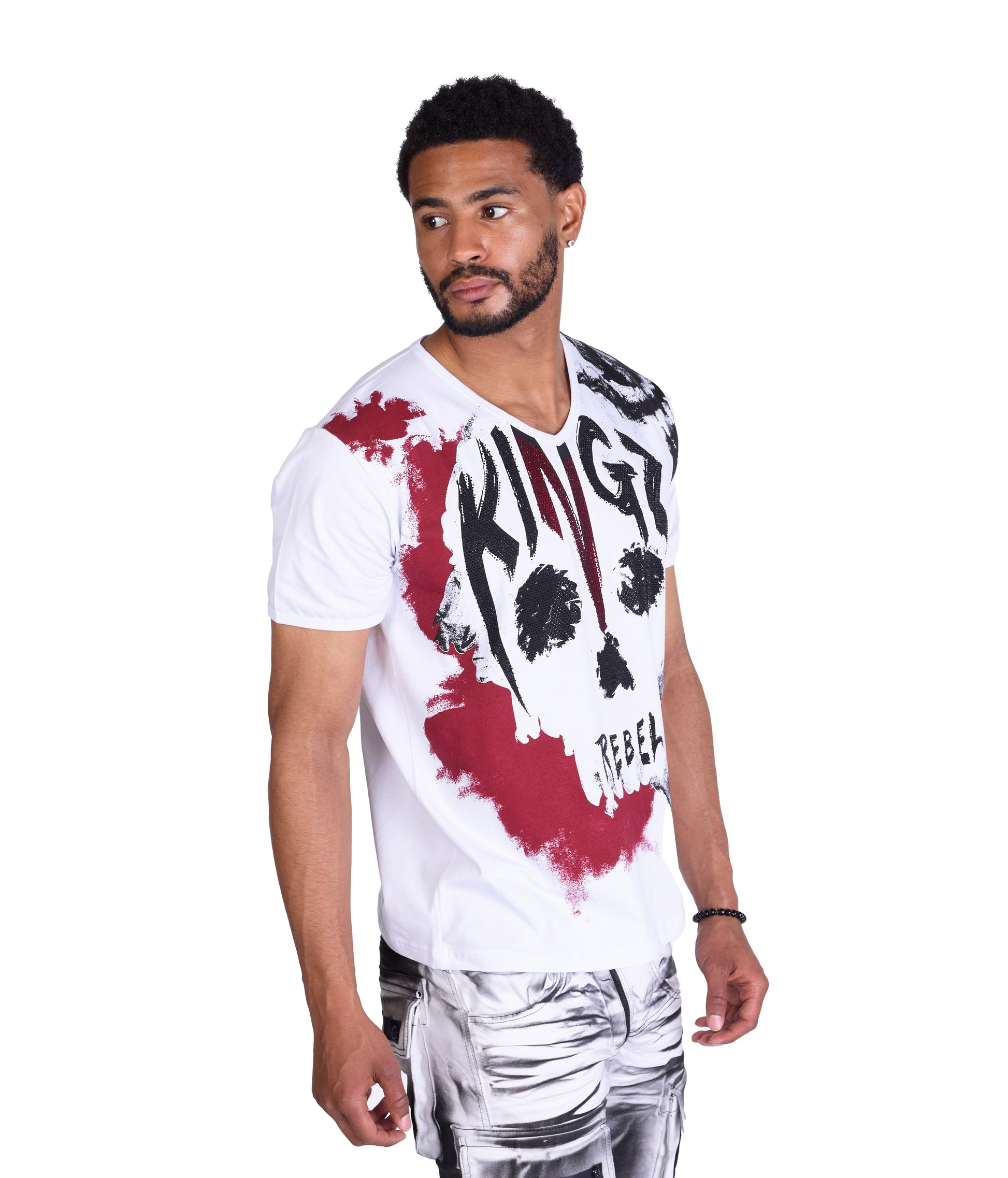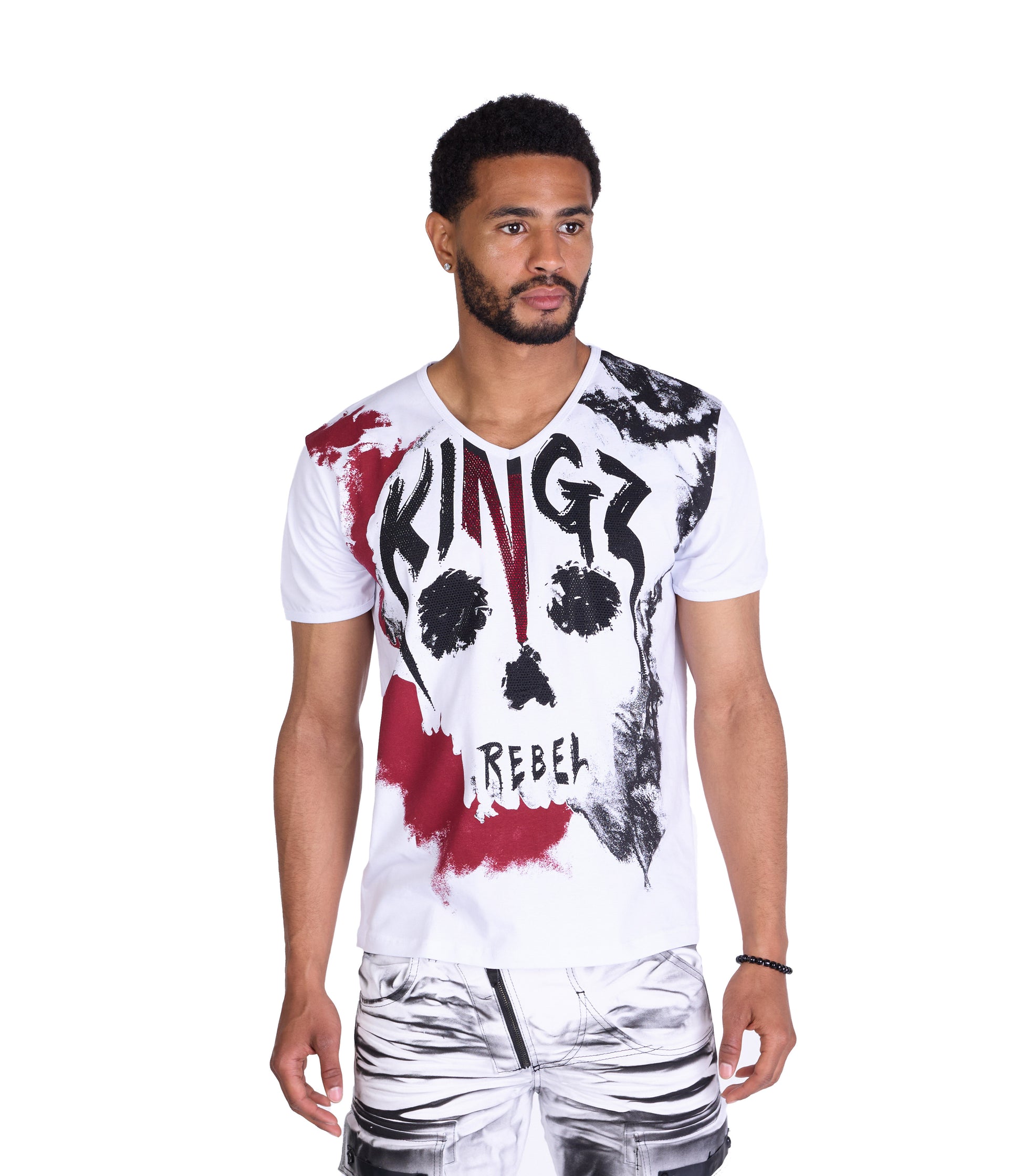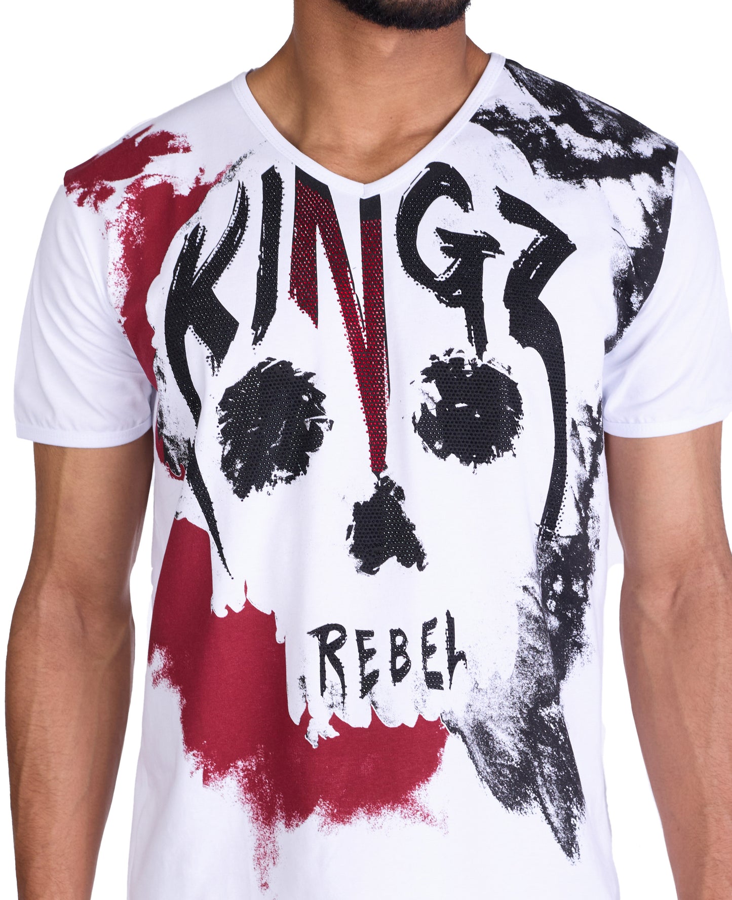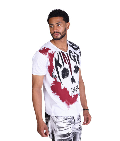 Highlight: Lässiger Totenkopfdruck mit verlaufenem Druck mit KINGZ und Rebel auf der Vorderseite und 3 roten verlaufenen KINGZ Logos untereinander auf der Rückenpartie.
