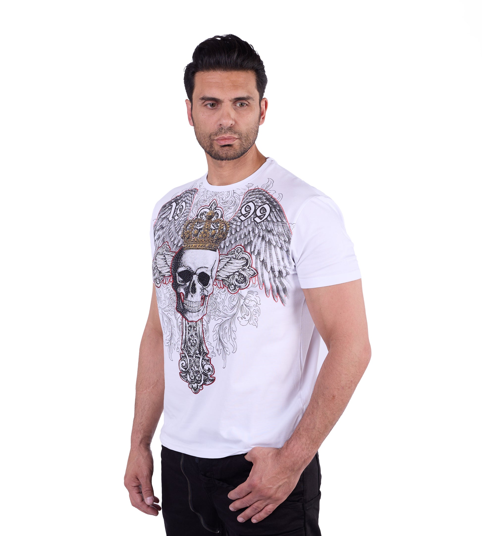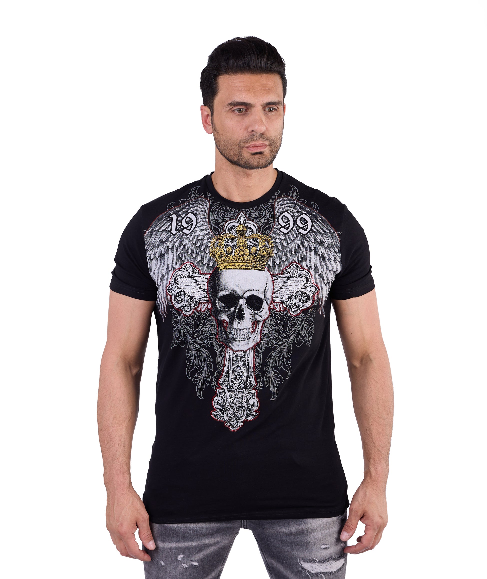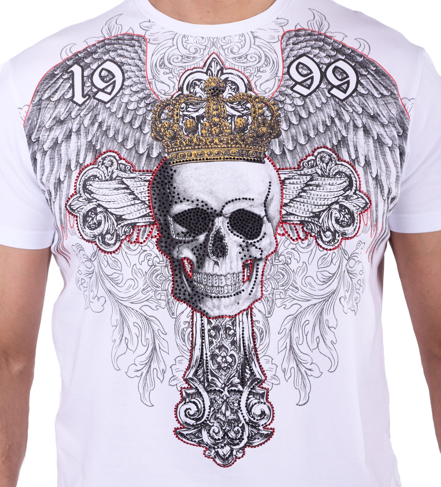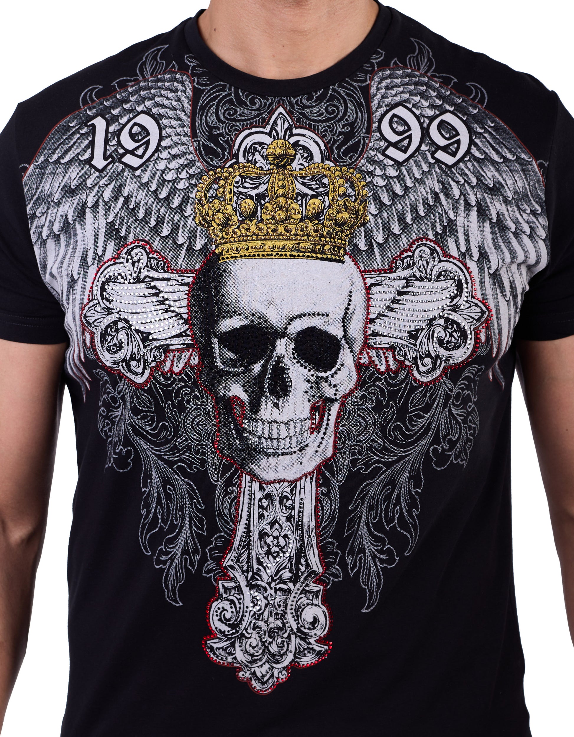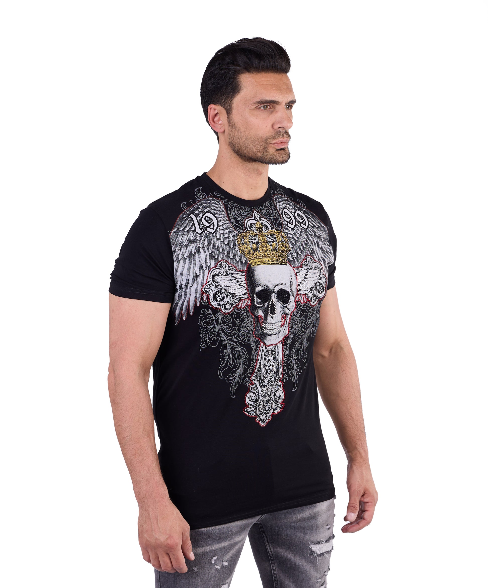 Extravagantes Totenkopf-Design: Das Herzstück dieses Shirts ist der auffällige Totenkopf-Print, der von einem großen Kreuz und detailreichen Adlerflügeln kunstvoll umrahmt wird. Funkelnde Strass-Applikationen verleihen dem Motiv einen luxuriösen Glanz und machen es zu einem echten Blickfang.