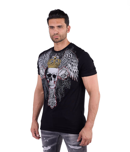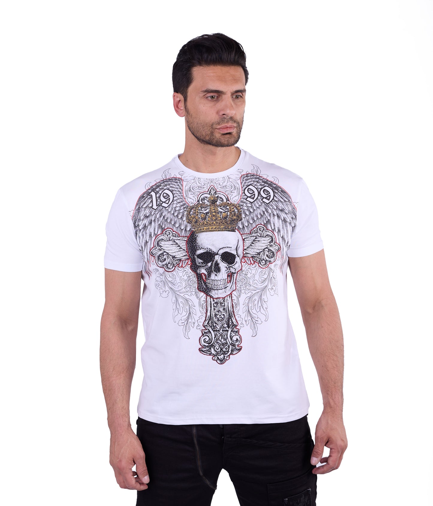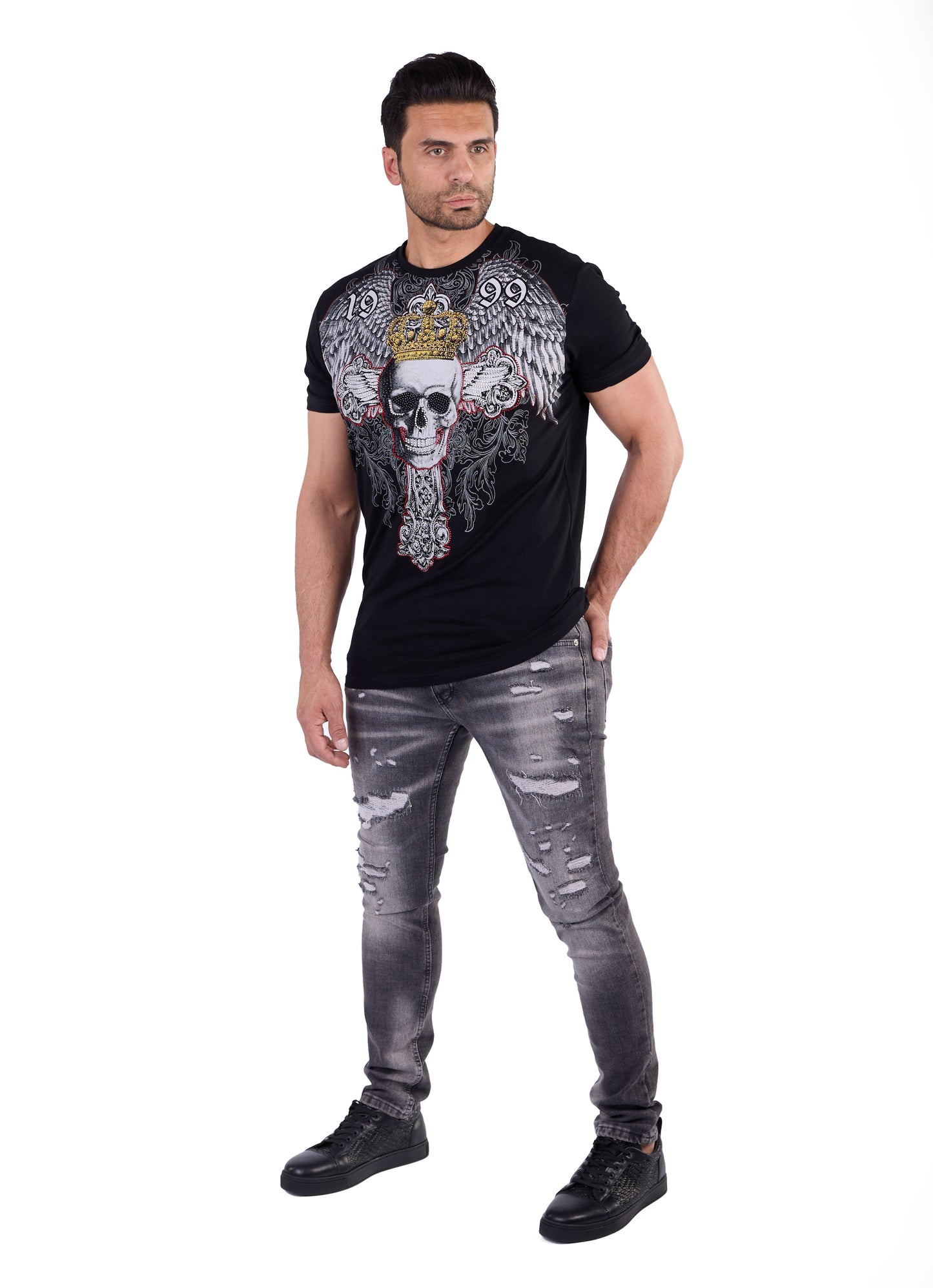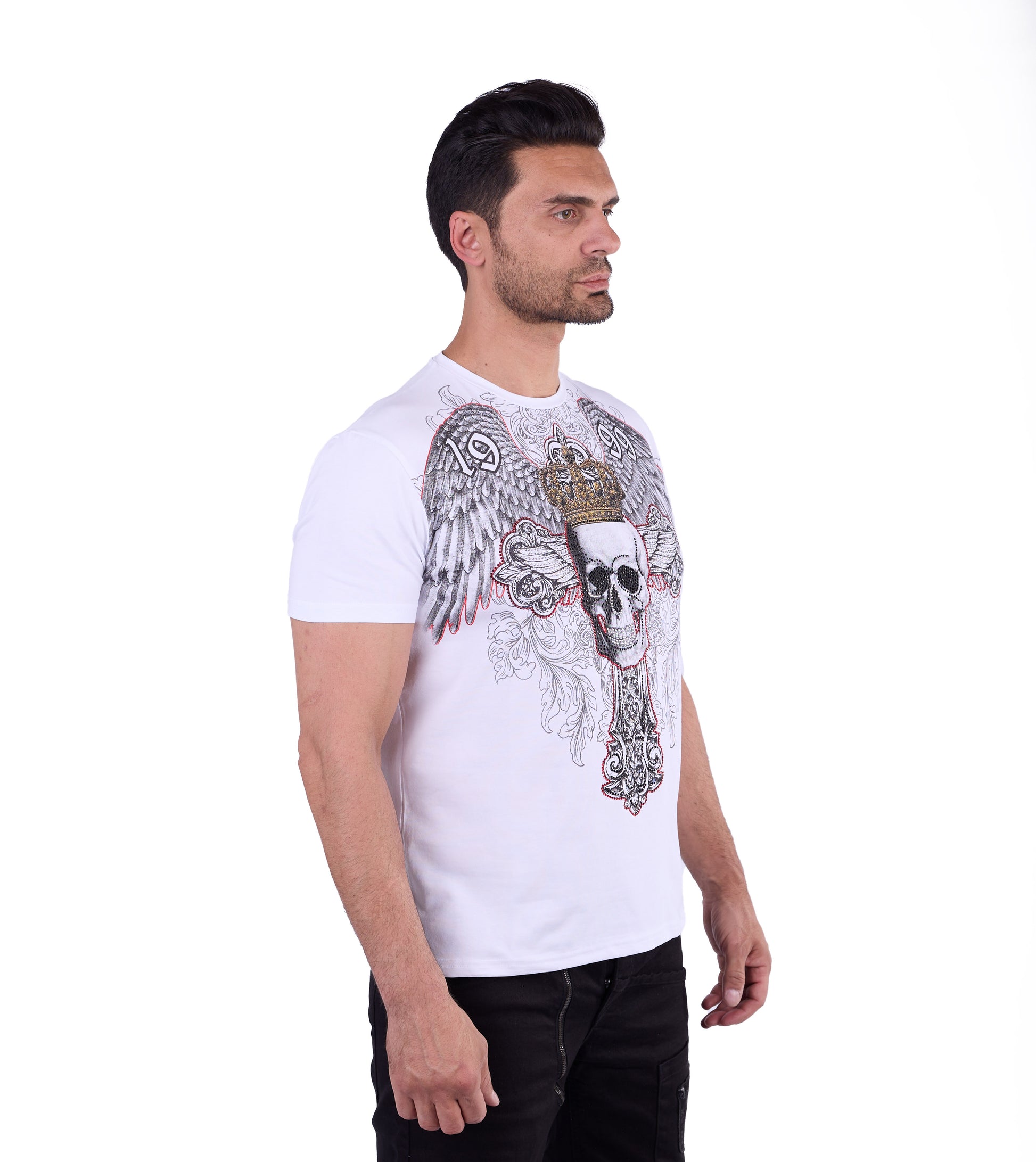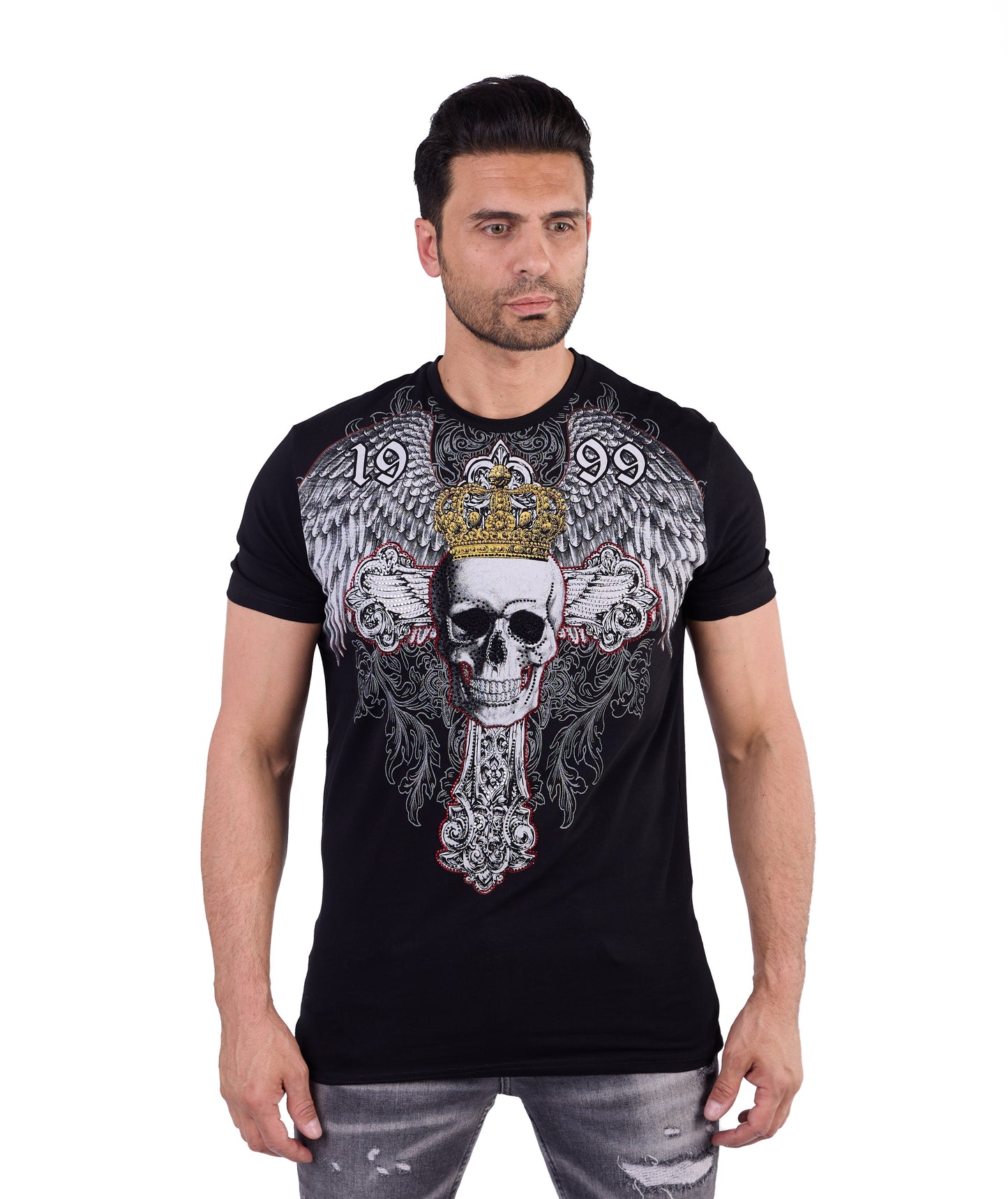 Extravagantes Totenkopf-Design: Das Herzstück dieses Shirts ist der auffällige Totenkopf-Print, der von einem großen Kreuz und detailreichen Adlerflügeln kunstvoll umrahmt wird. Funkelnde Strass-Applikationen verleihen dem Motiv einen luxuriösen Glanz und machen es zu einem echten Blickfang.