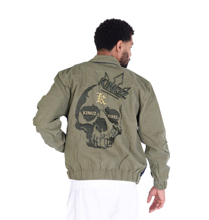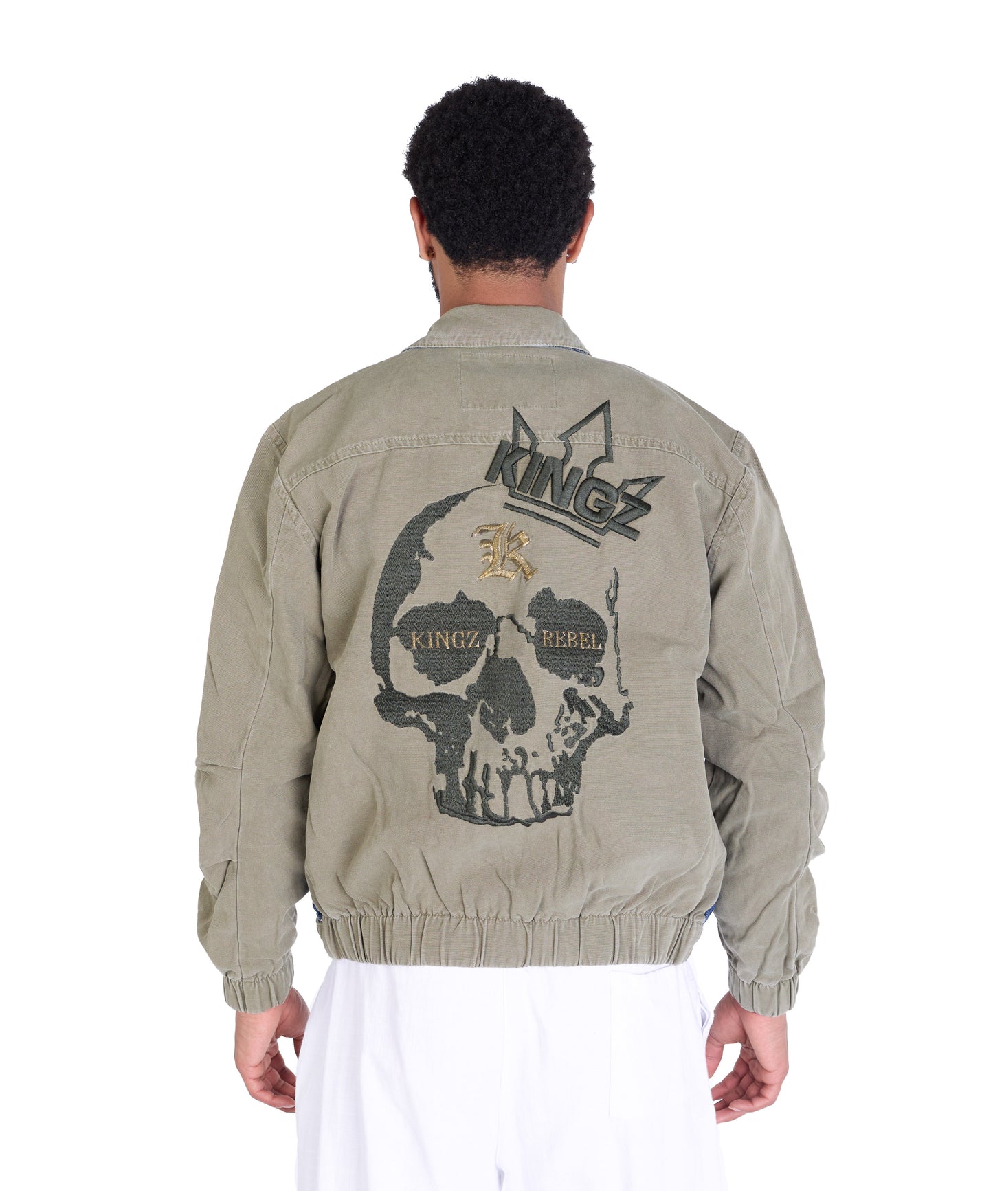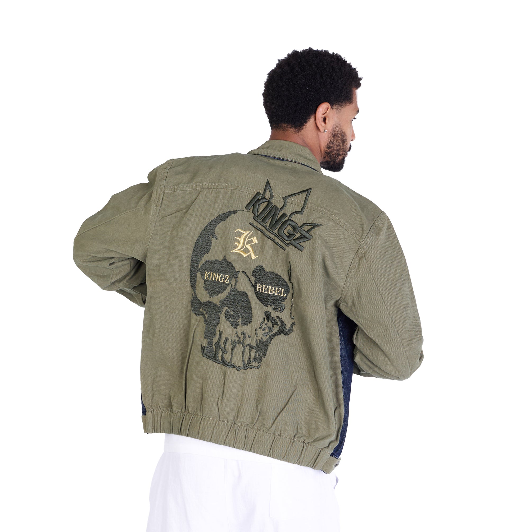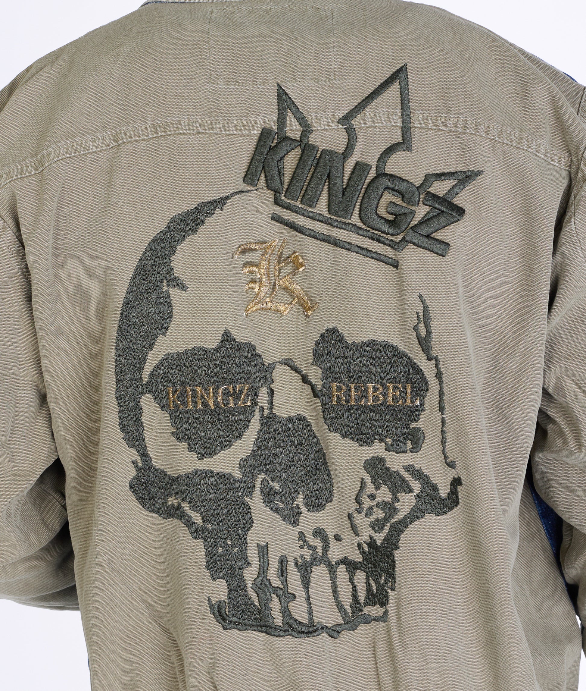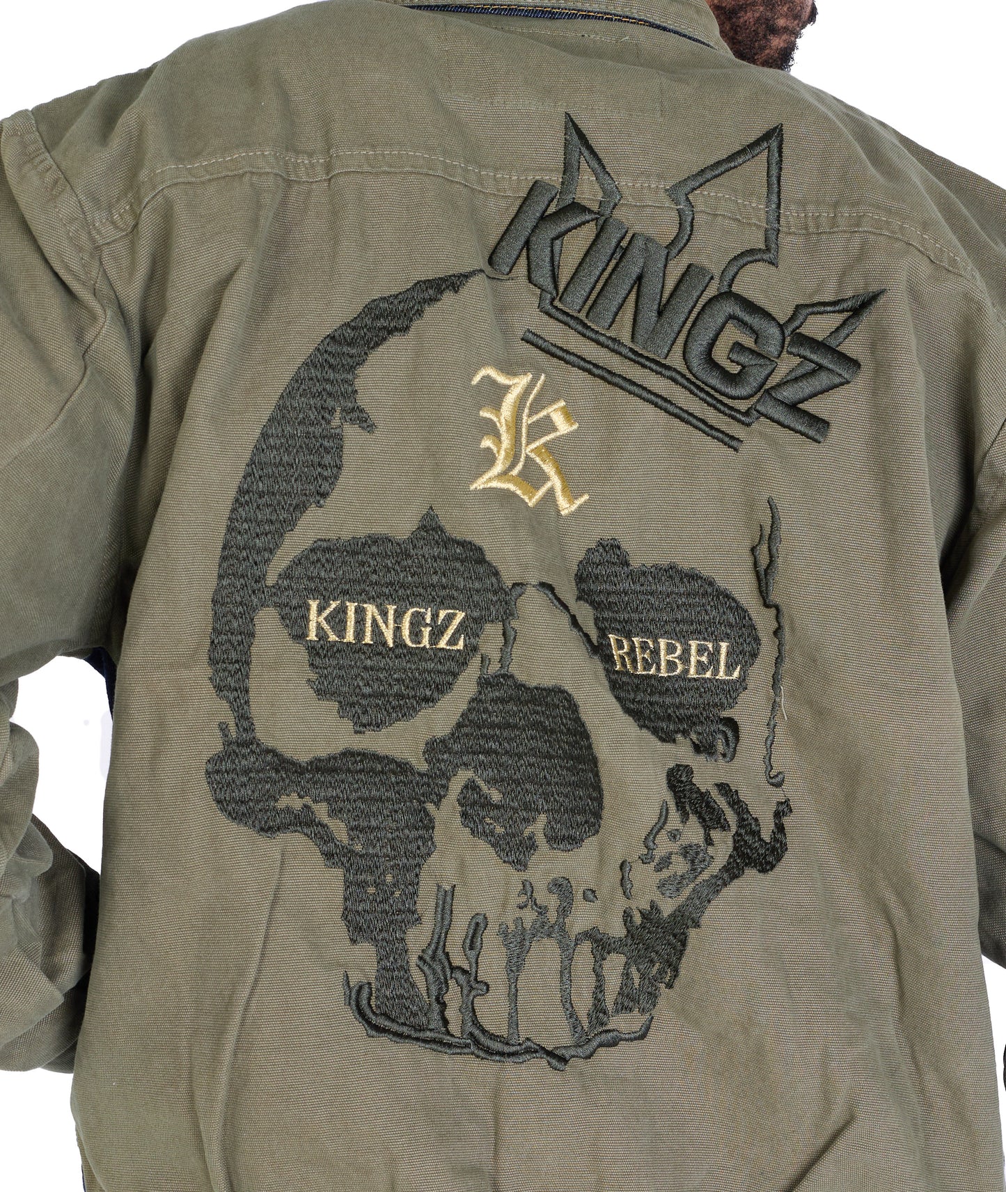 KINGZ Rebell-Stickerei: Auf dem Rücken prangt die KINGZ Rebell-Stickerei in Grün, die ein Totenkopf mit Krone zeigt - ein Statement für Individualität und rebellischen Geist.