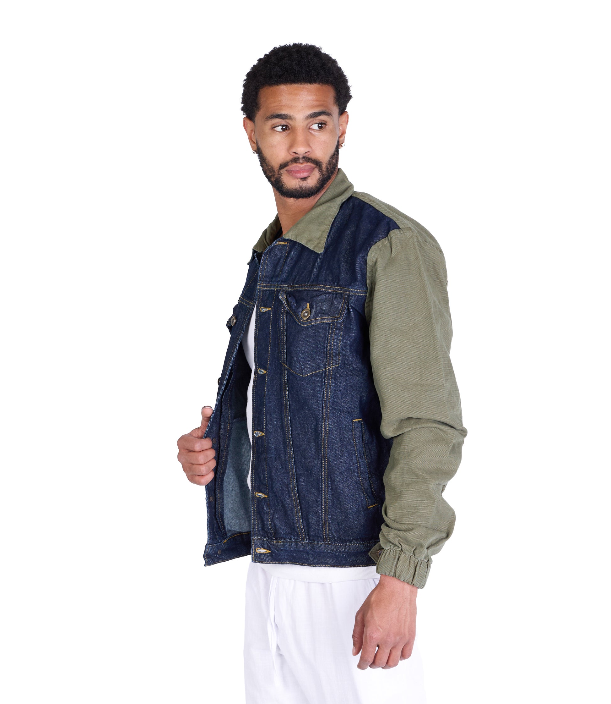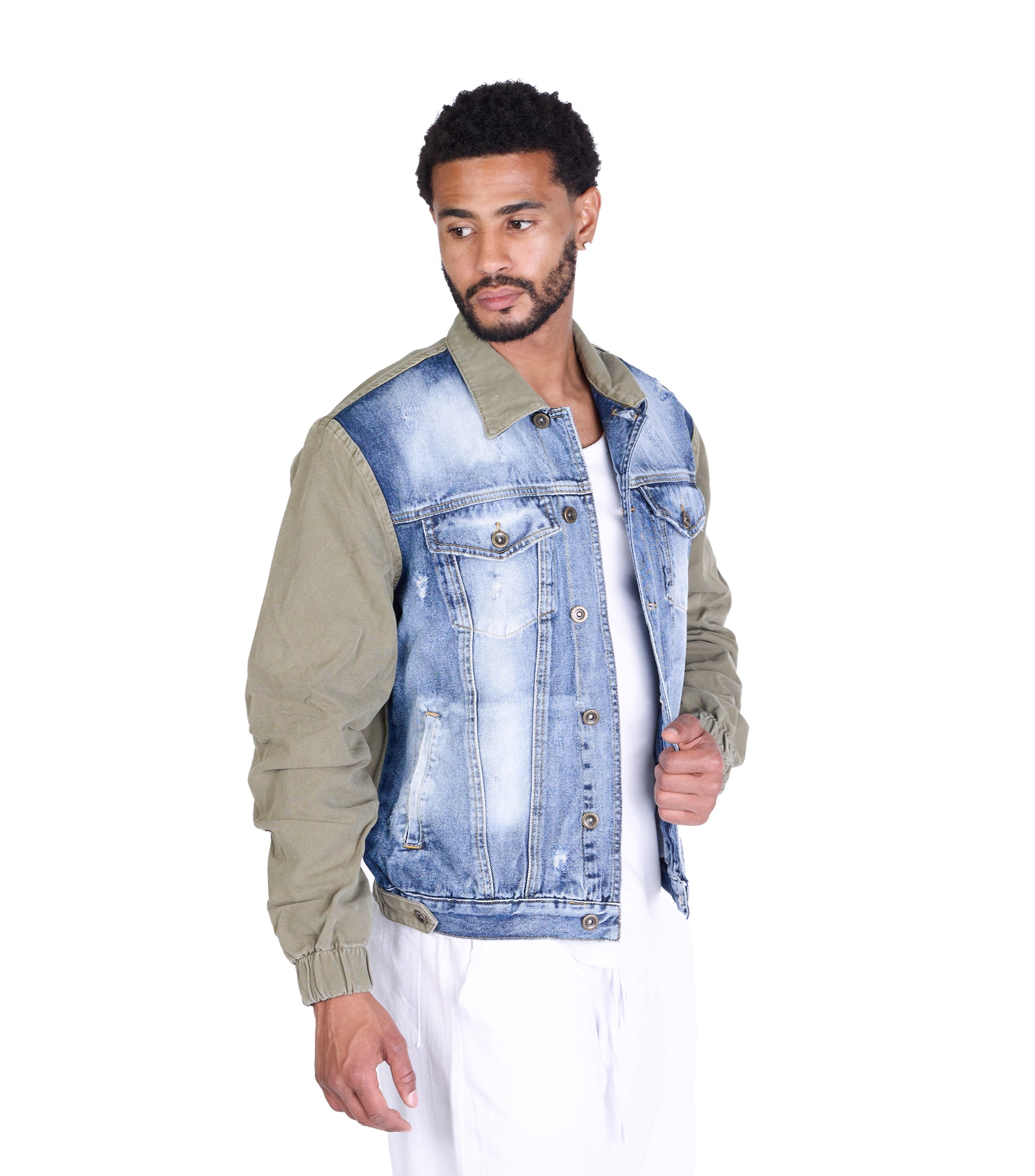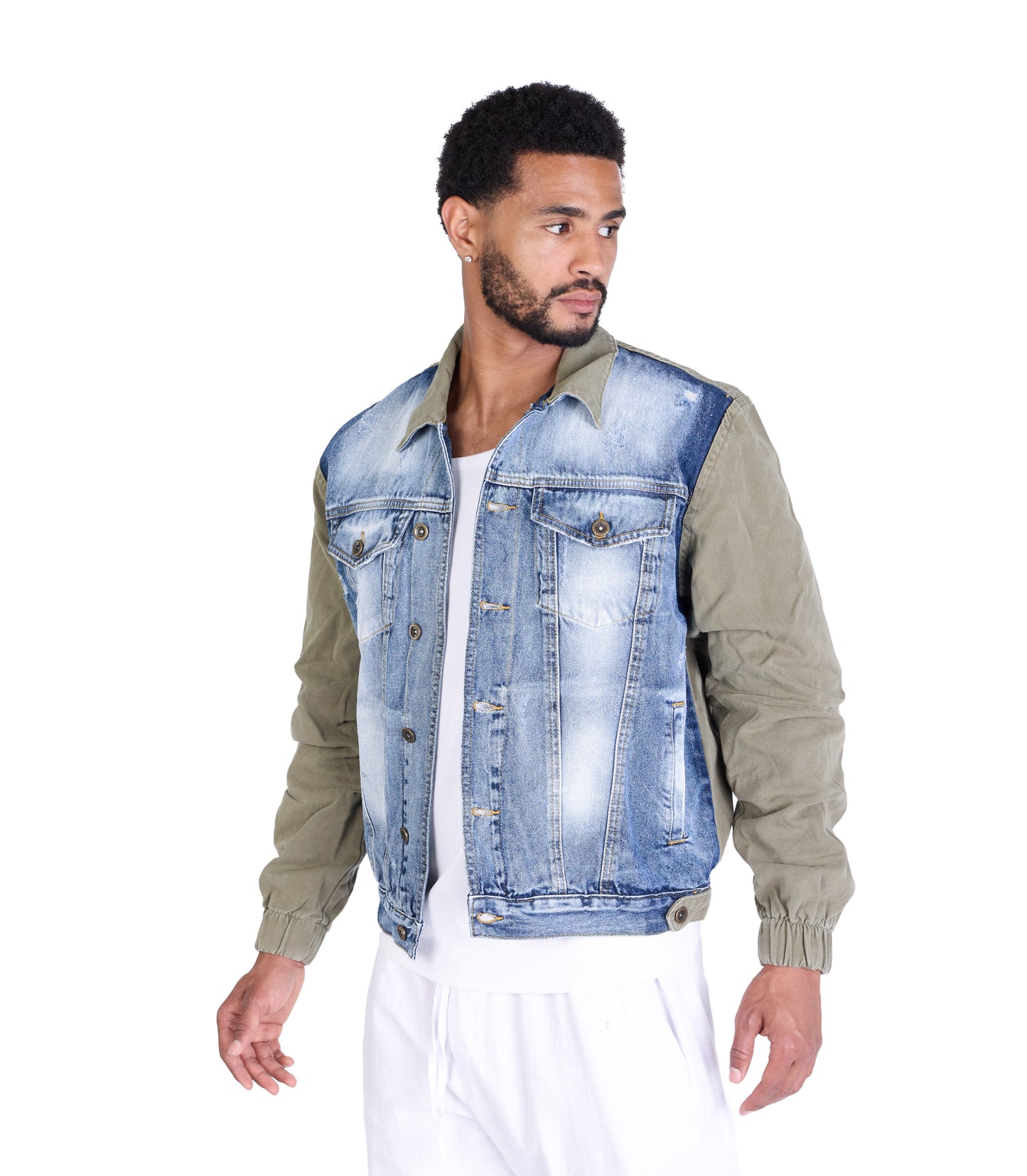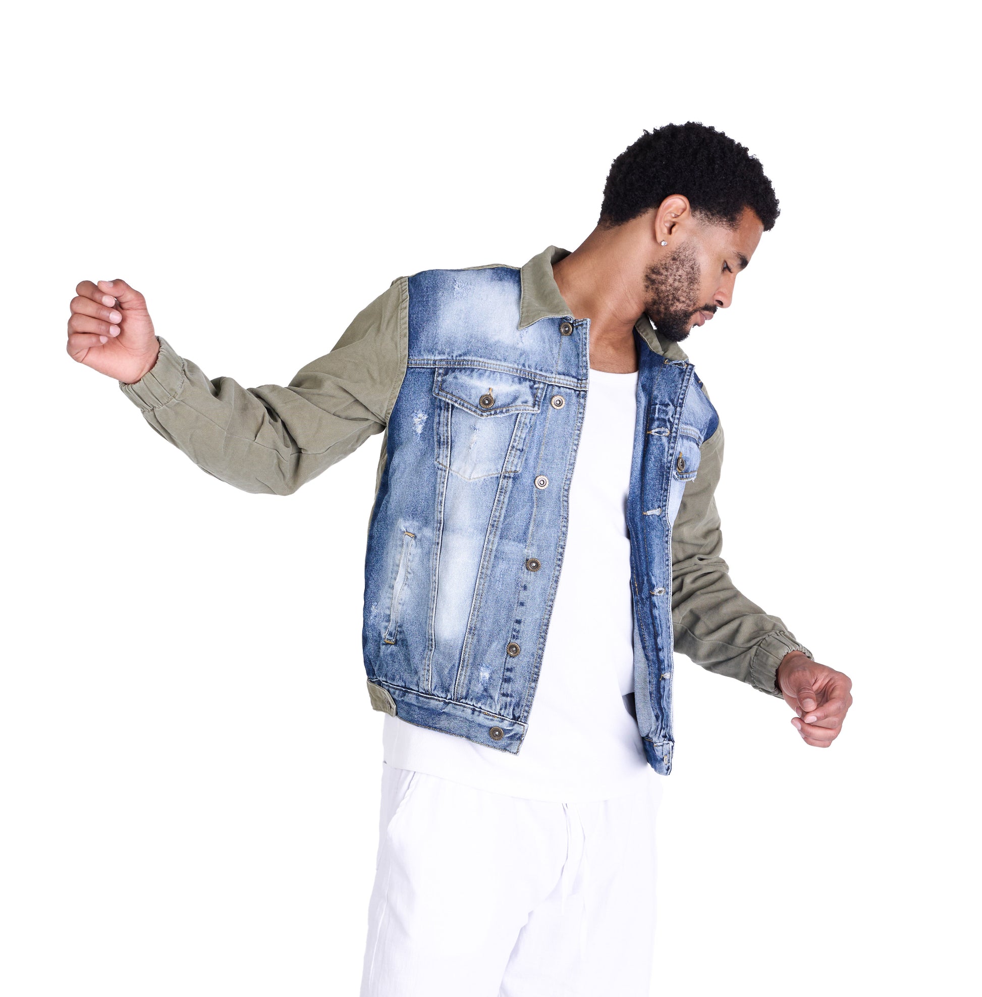 Diese einzigartige Jeansjacke von Kingz vereint zwei Denim-Looks in einem atemberaubenden Design. Die Ärmel und der Rückenpartie sind aus grünem Denim gefertigt, während die Vorderseite in klassischem Blau oder ausgewaschenem Hellblau im Destroyed Look gehalten ist.