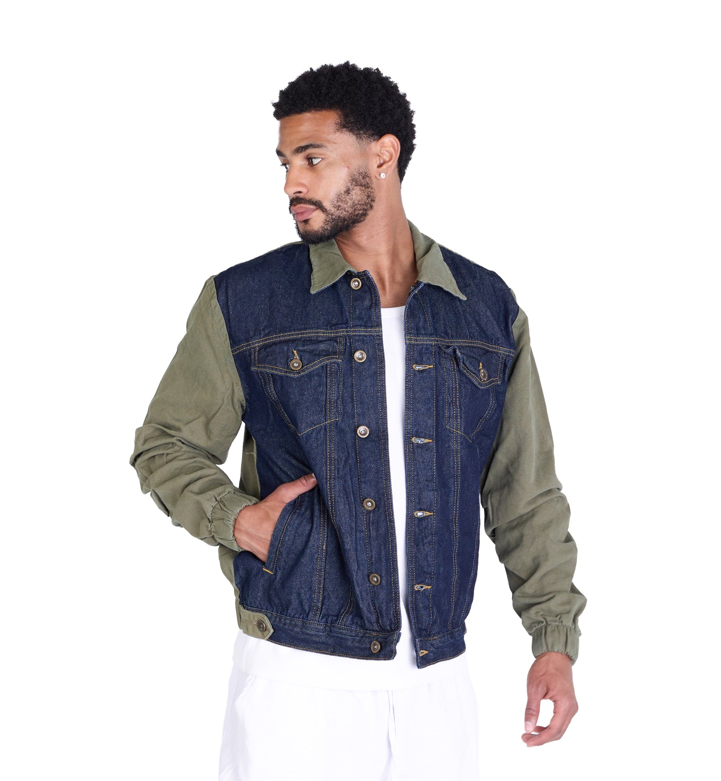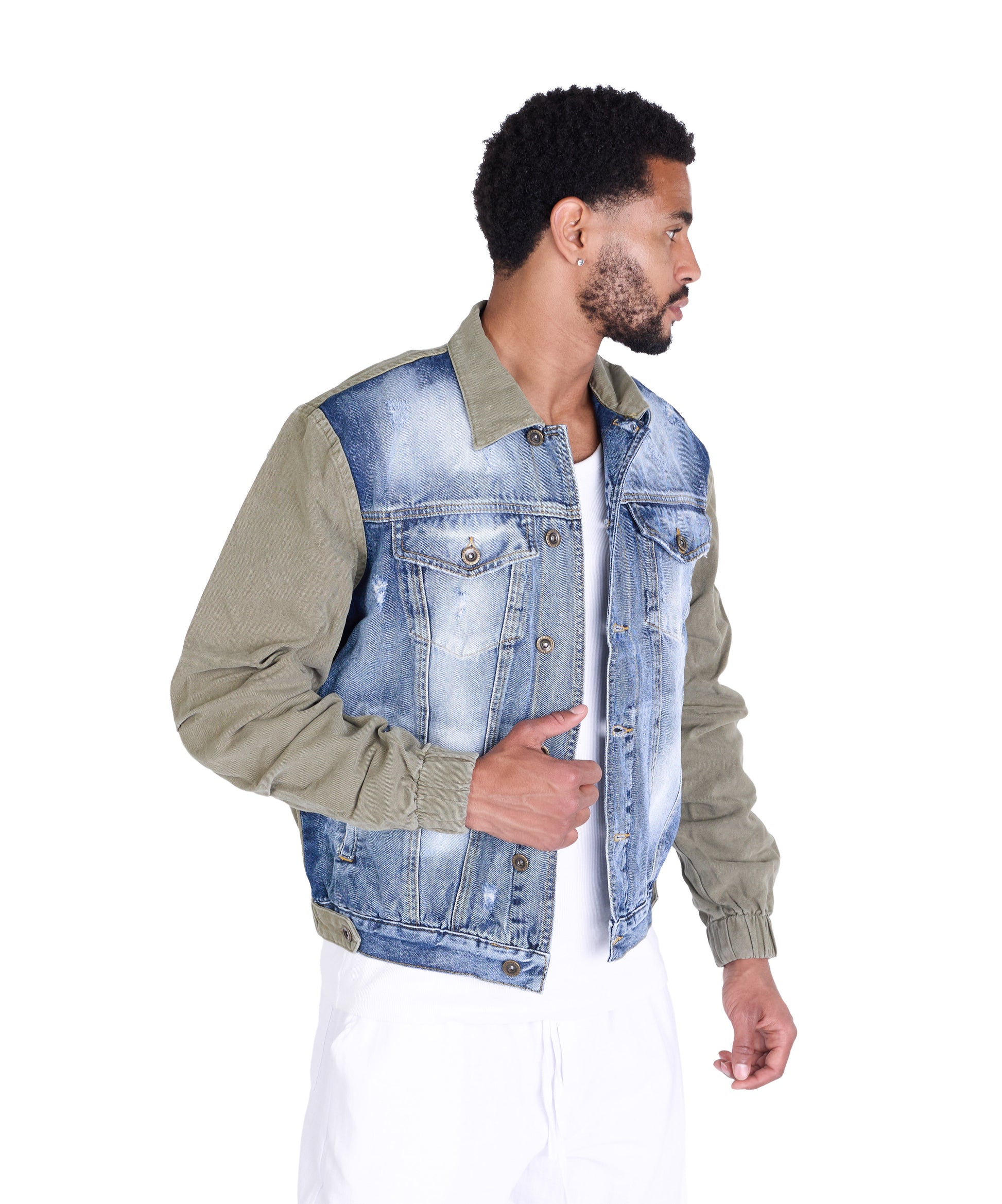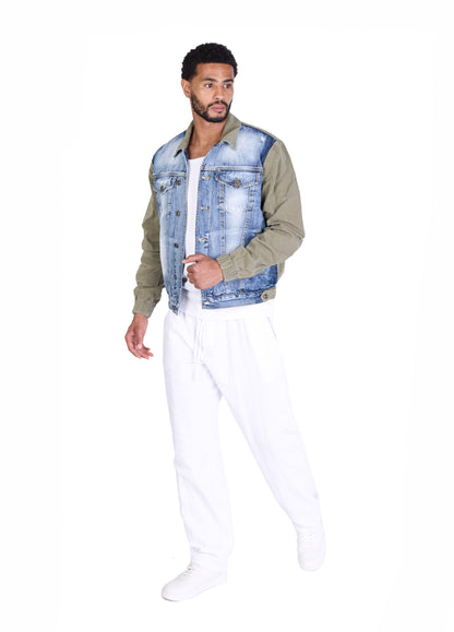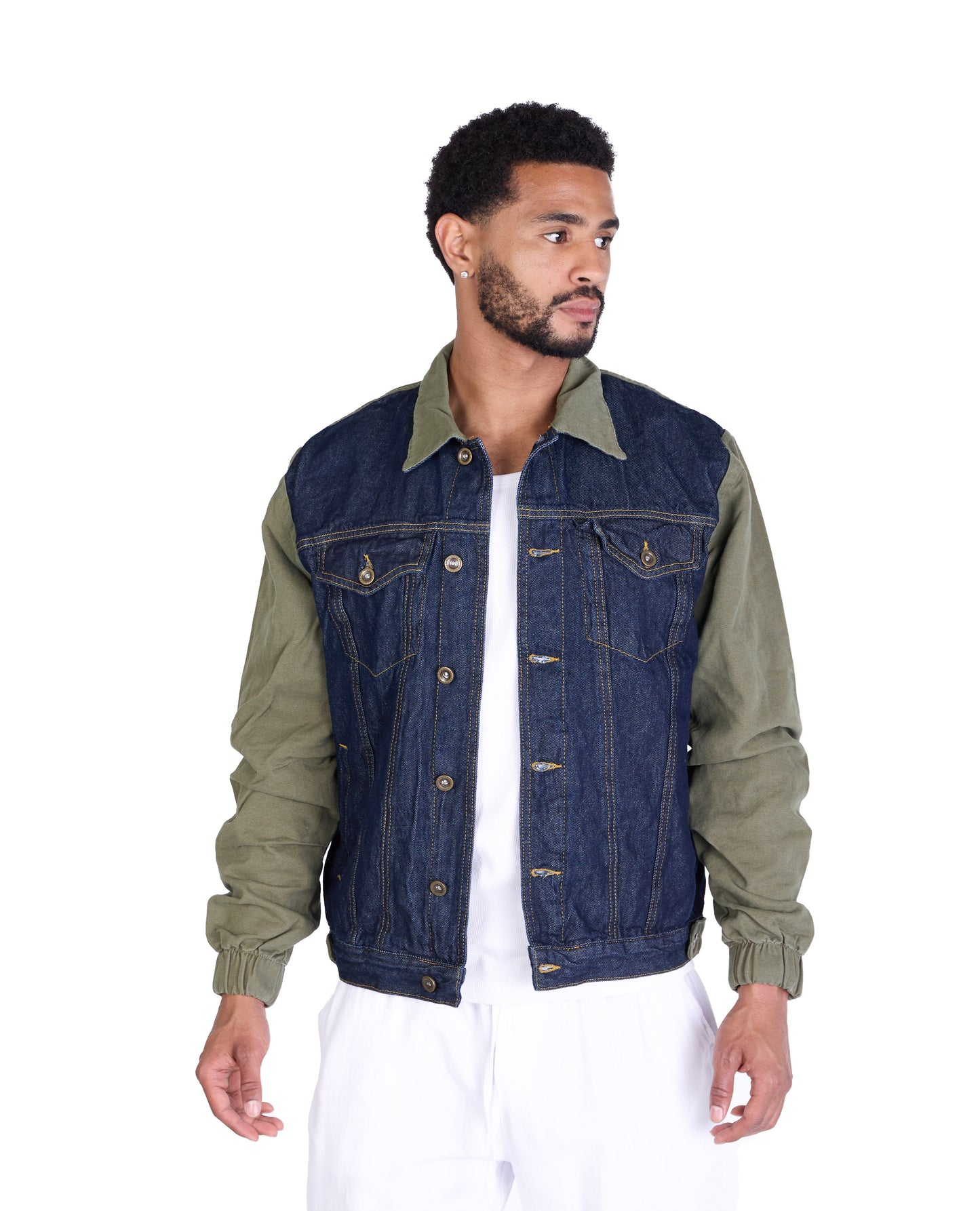 Diese einzigartige Jeansjacke von Kingz vereint zwei Denim-Looks in einem atemberaubenden Design. Die Ärmel und der Rückenpartie sind aus grünem Denim gefertigt, während die Vorderseite in klassischem Blau oder ausgewaschenem Hellblau im Destroyed Look gehalten ist.