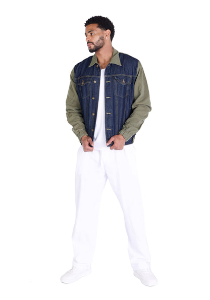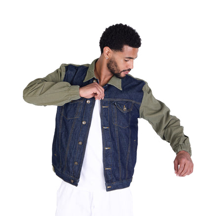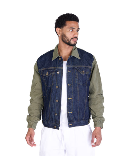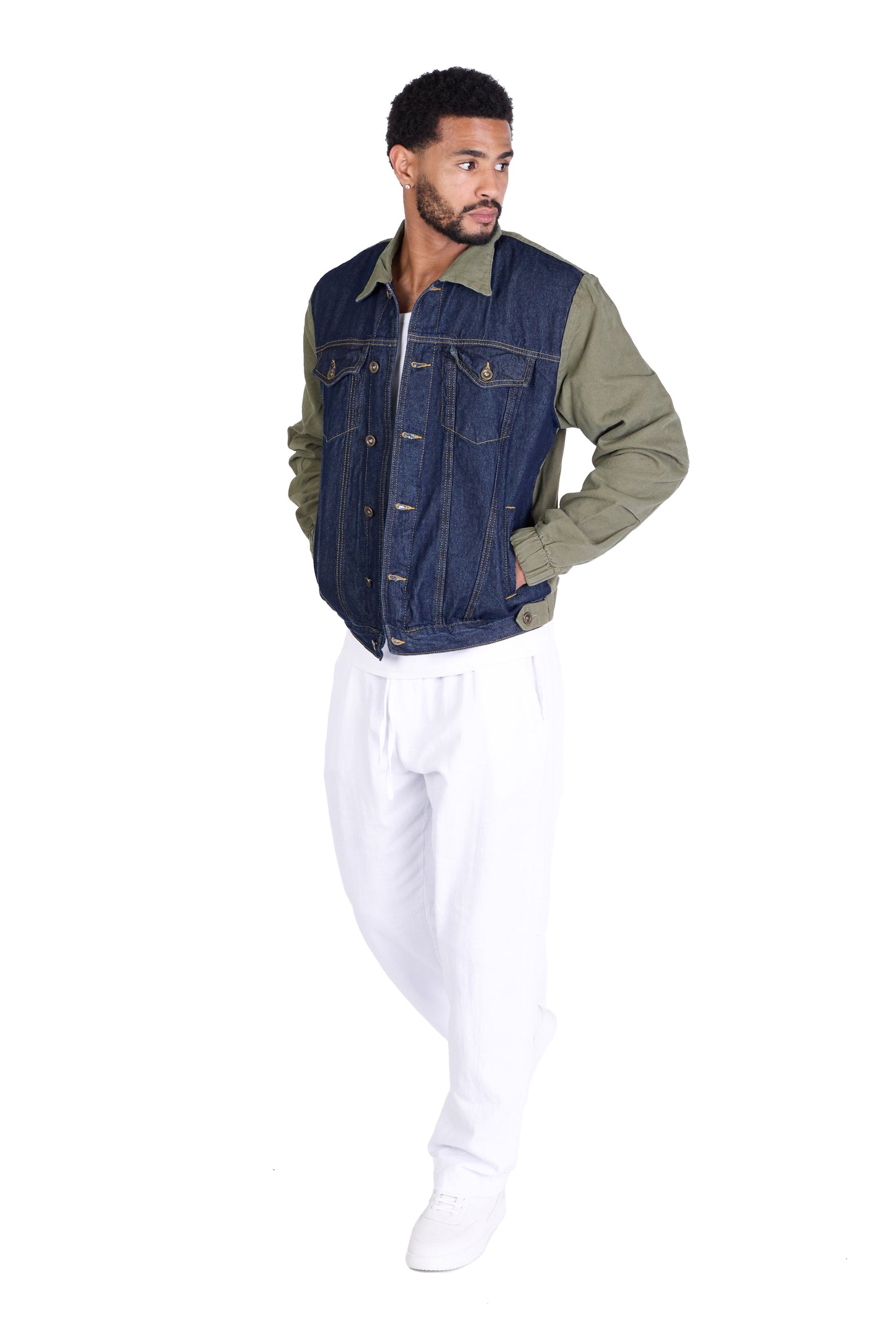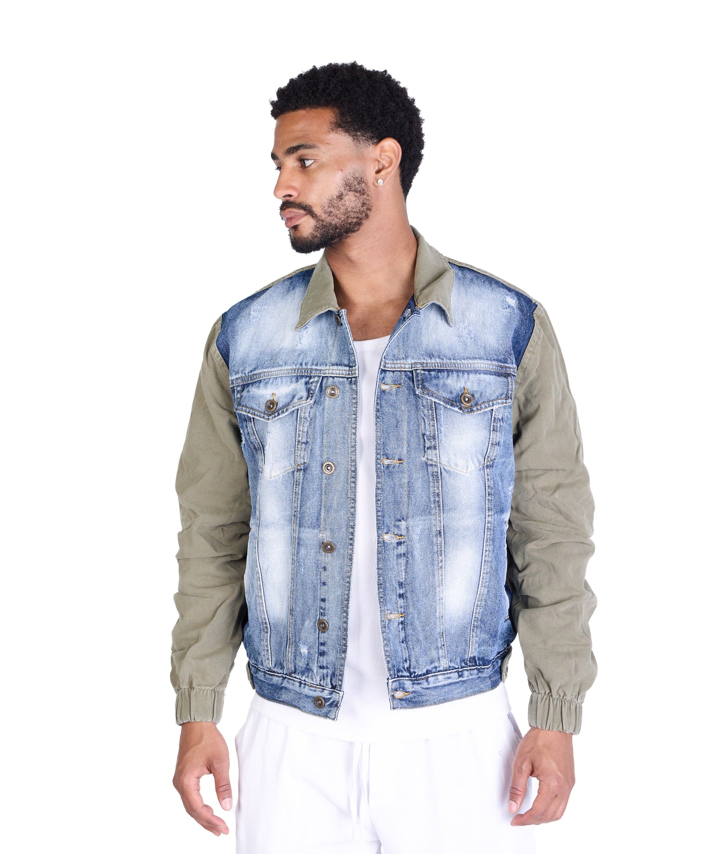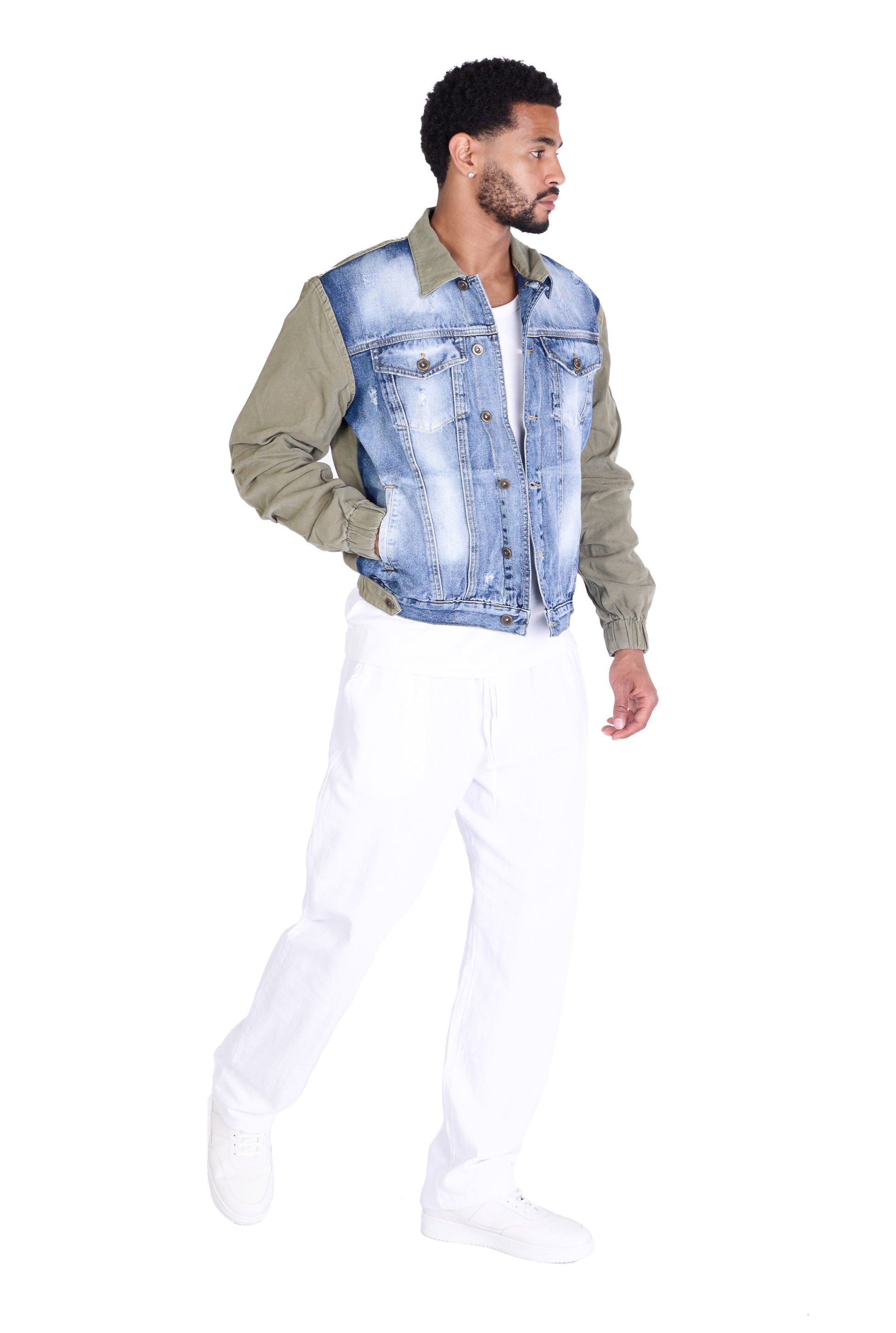 Diese einzigartige Jeansjacke von Kingz vereint zwei Denim-Looks in einem atemberaubenden Design. Die Ärmel und der Rückenpartie sind aus grünem Denim gefertigt, während die Vorderseite in klassischem Blau oder ausgewaschenem Hellblau im Destroyed Look gehalten ist.