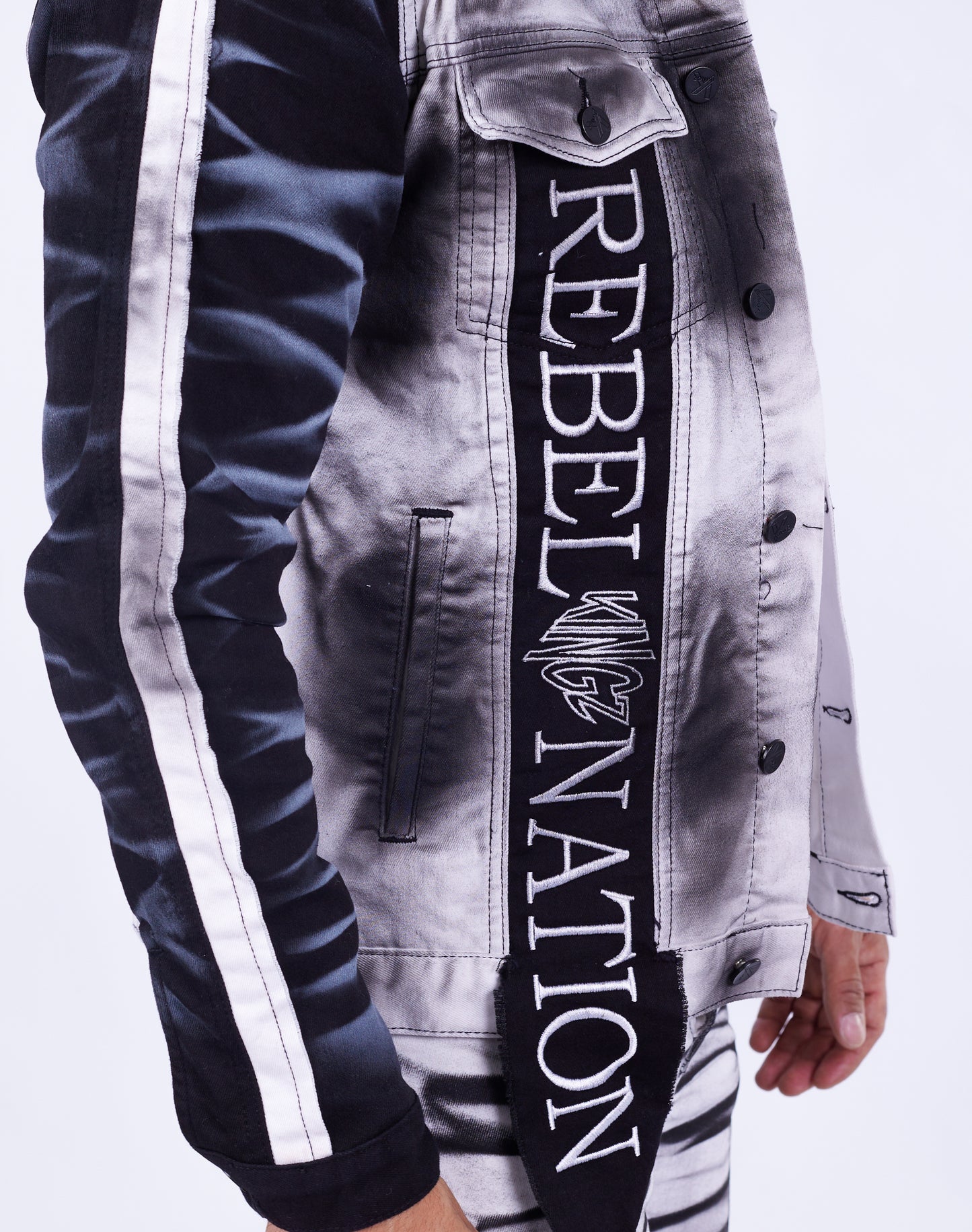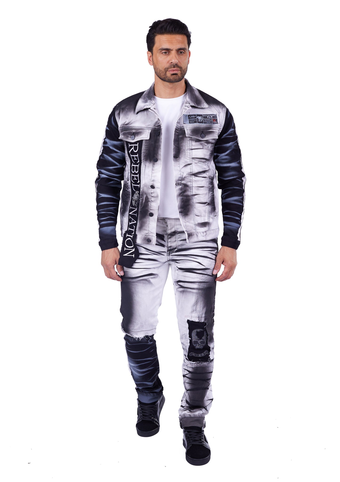 - Kontrastreiche Ärmel und Front-Details: Die in Schwarz mit weißer Waschung abgesetzten Ärmel bilden einen spannenden Kontrast zur Batikoptik des Hauptteils. Die Frontpartie ist mit dem kraftvollen Schriftzug "KINGZ REBEL NATION" bestickt.