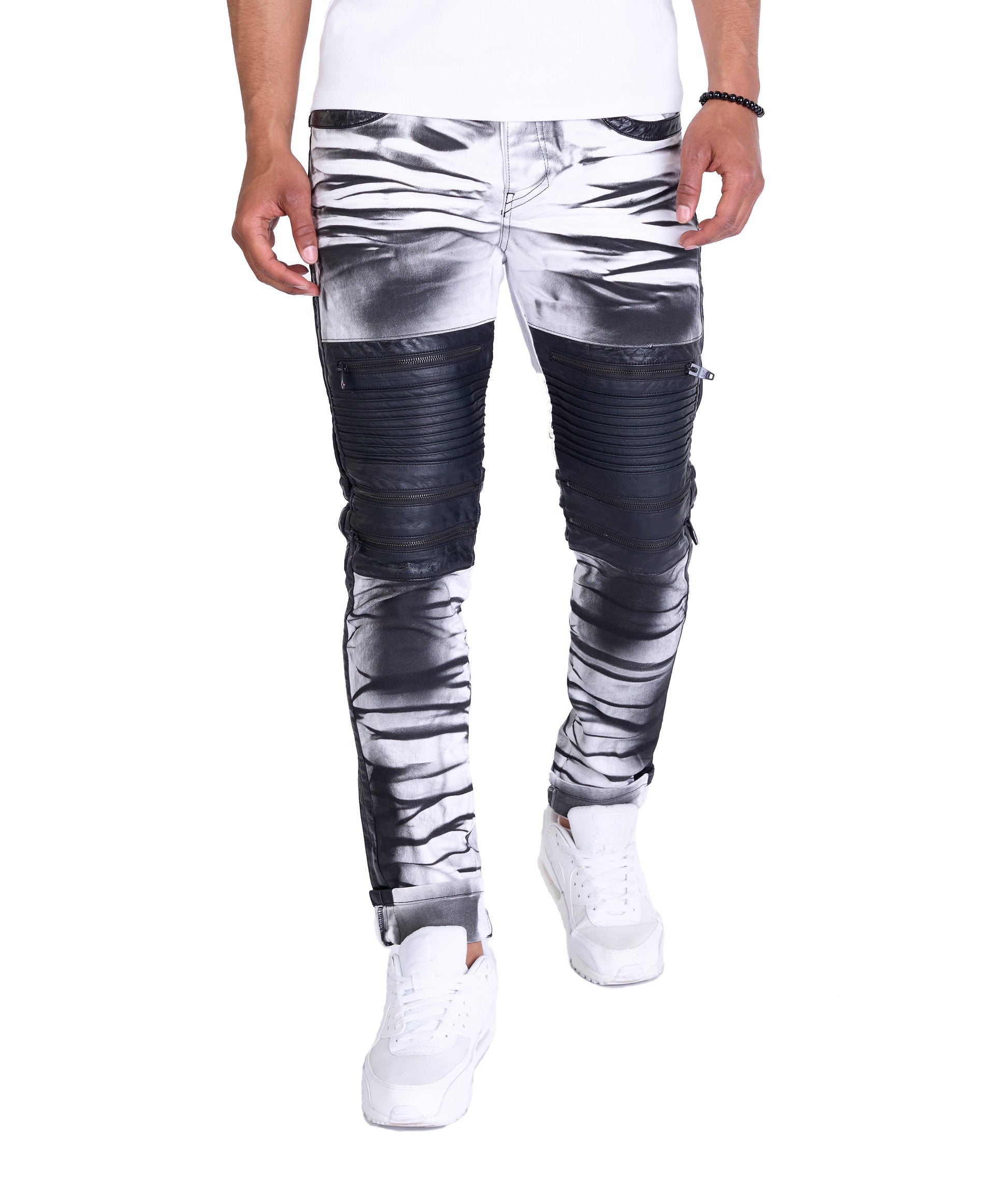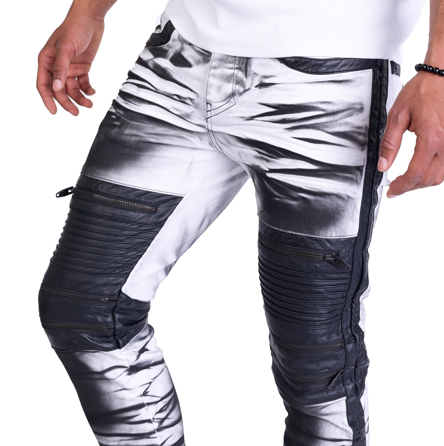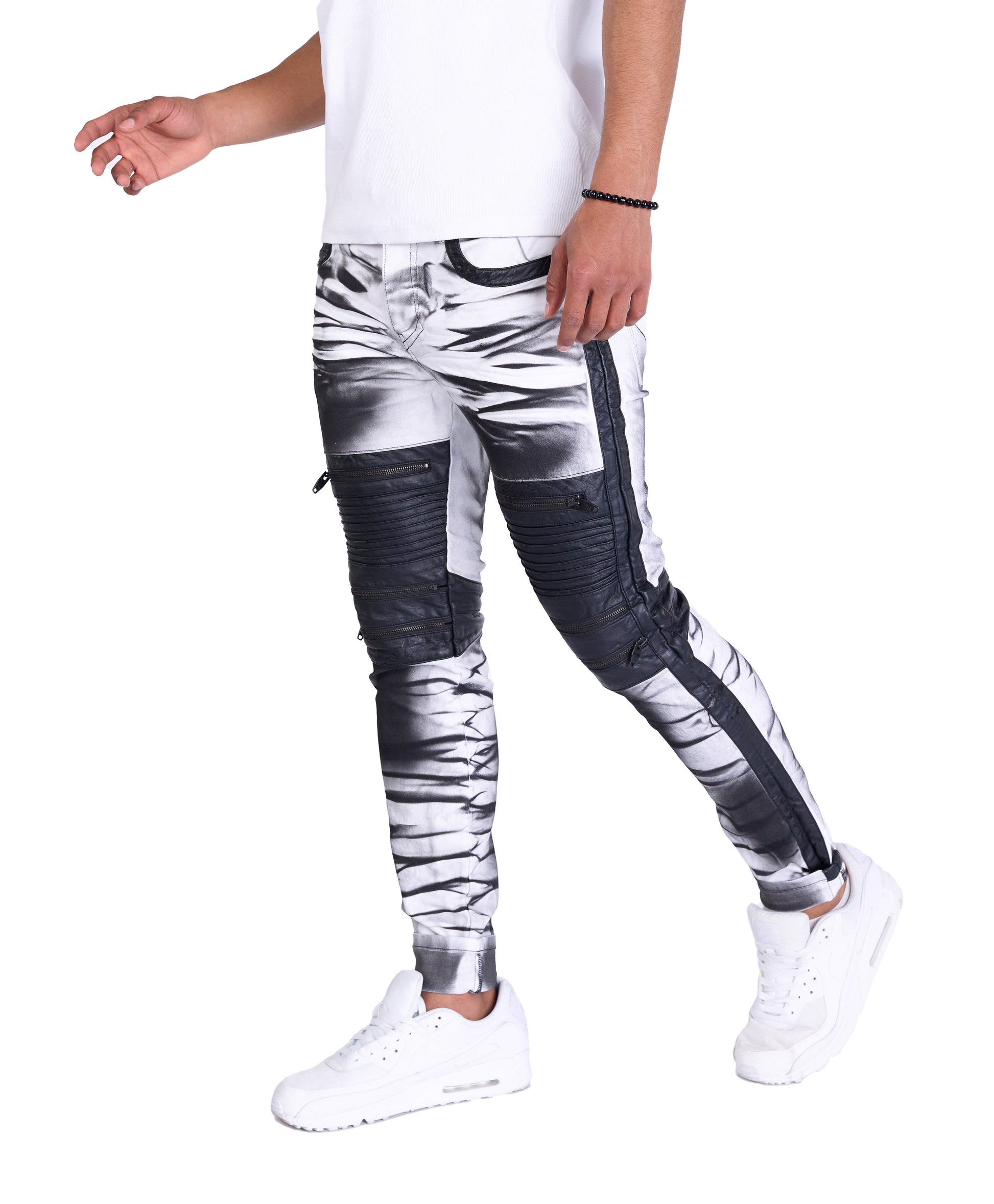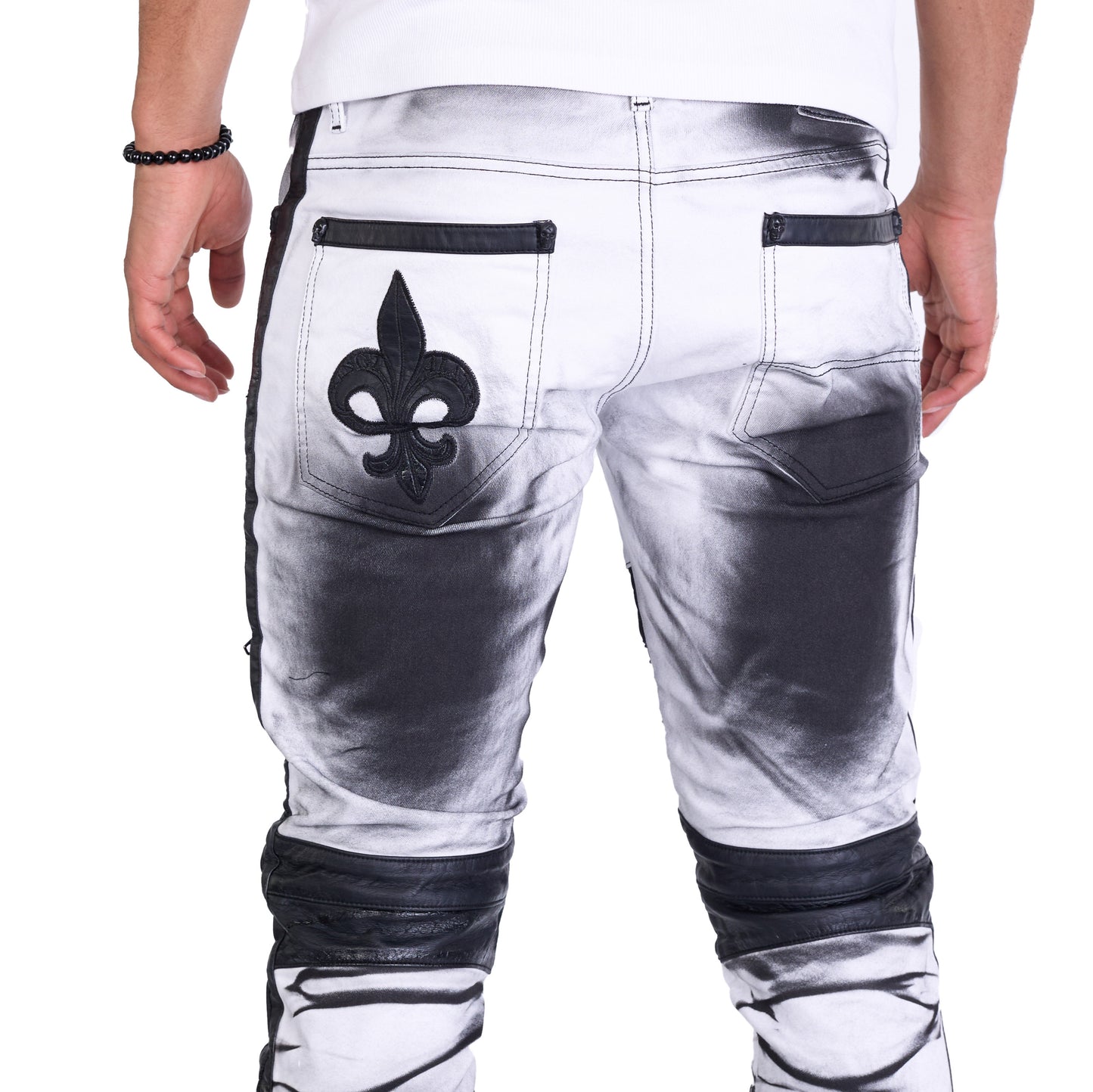 Setze ein starkes Fashion-Statement mit dieser einzigartigen weißen Herren Jeans. Die markante schwarze Batikwaschung in Kombination mit den Biker-Elementen aus Kunstleder macht diese Slim Fit Jeans zu einem absoluten Blickfang.