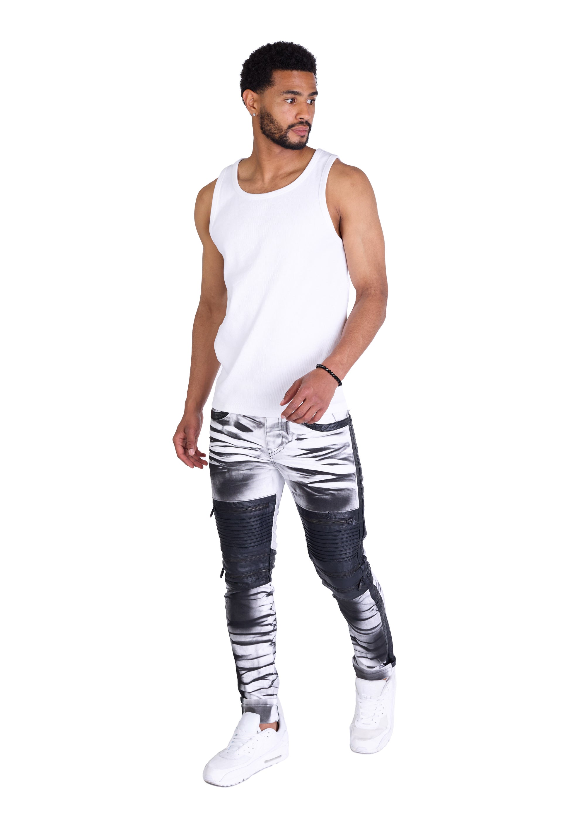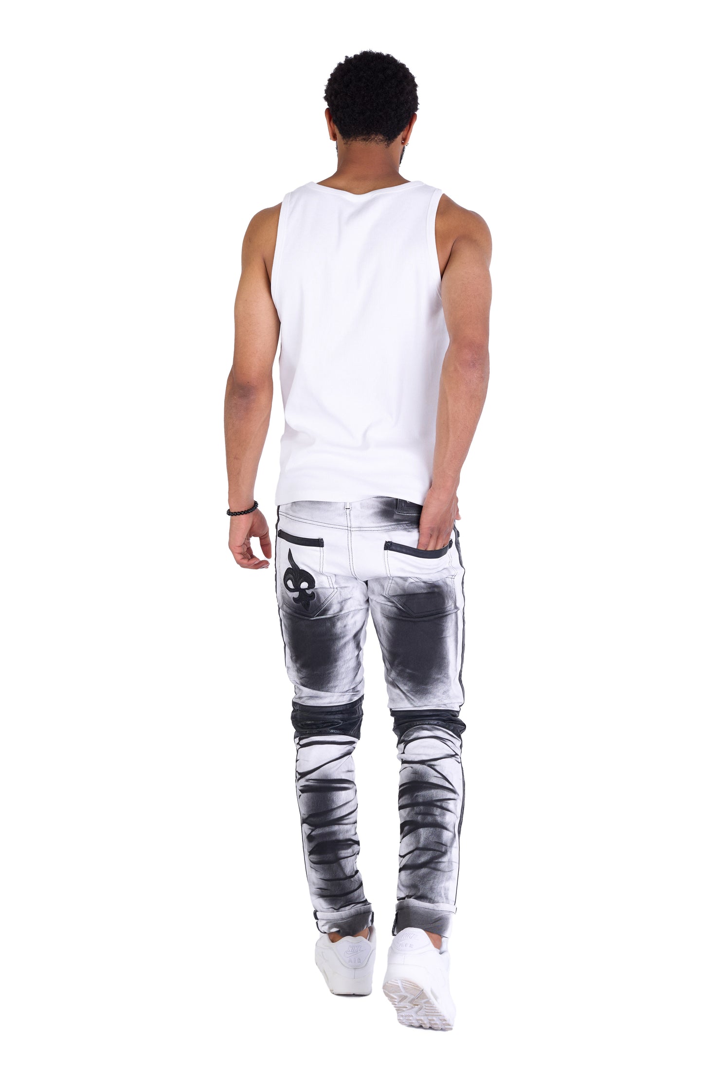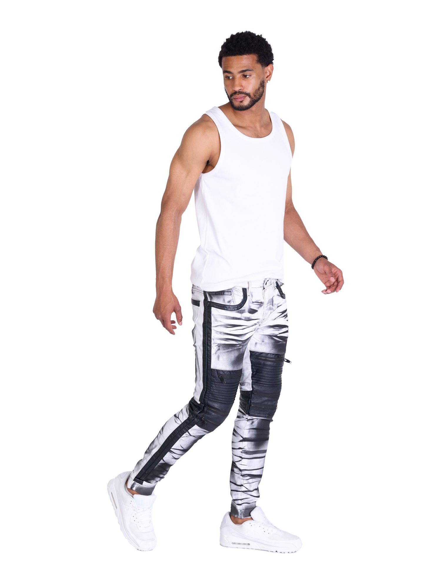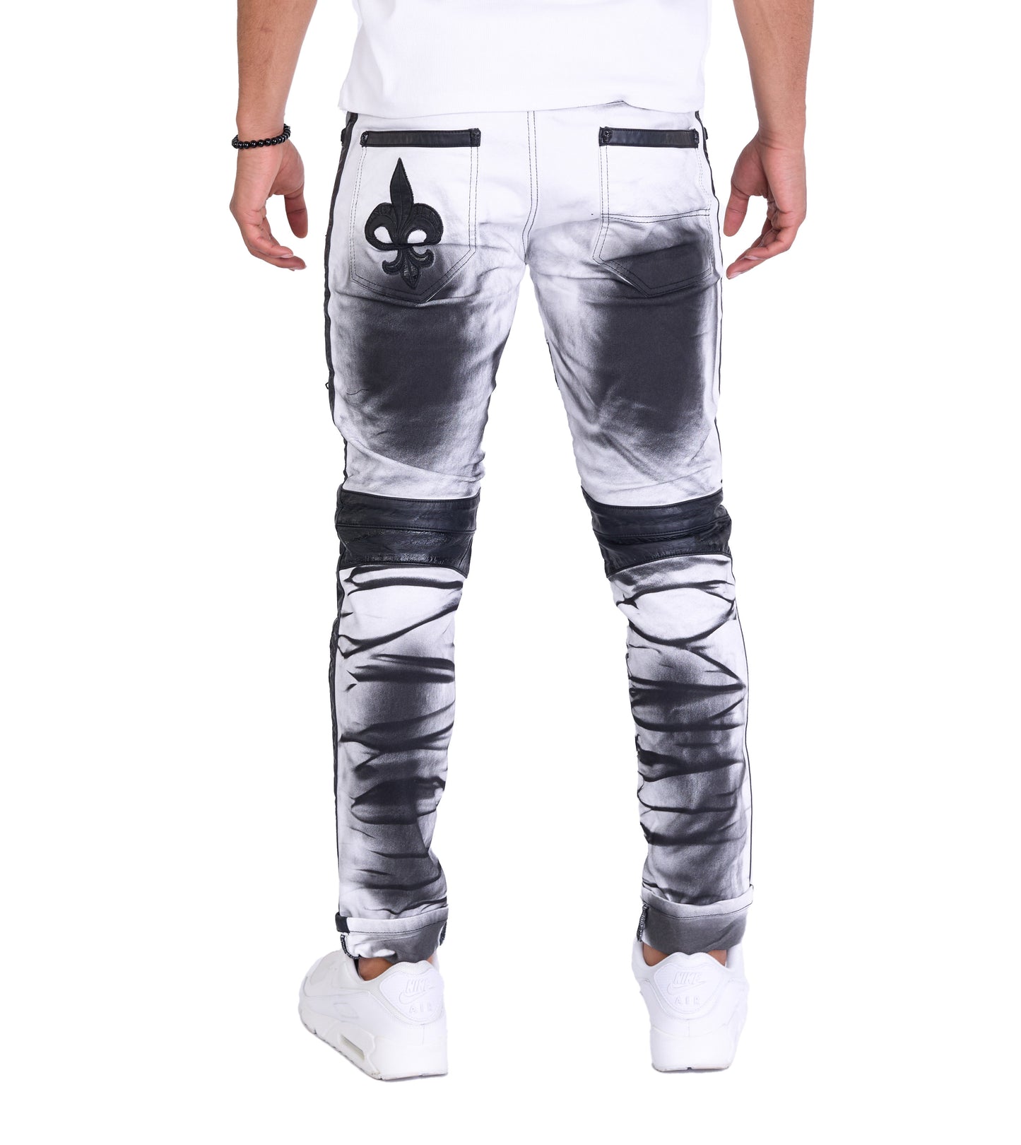 Setze ein starkes Fashion-Statement mit dieser einzigartigen weißen Herren Jeans. Die markante schwarze Batikwaschung in Kombination mit den Biker-Elementen aus Kunstleder macht diese Slim Fit Jeans zu einem absoluten Blickfang.