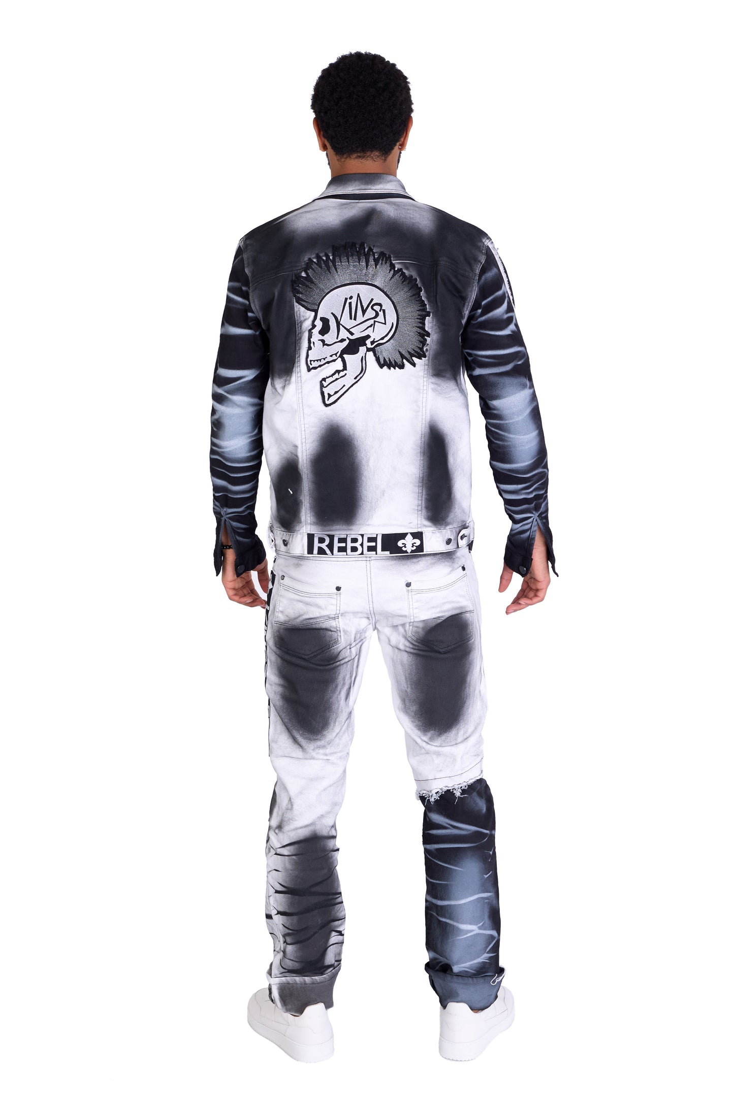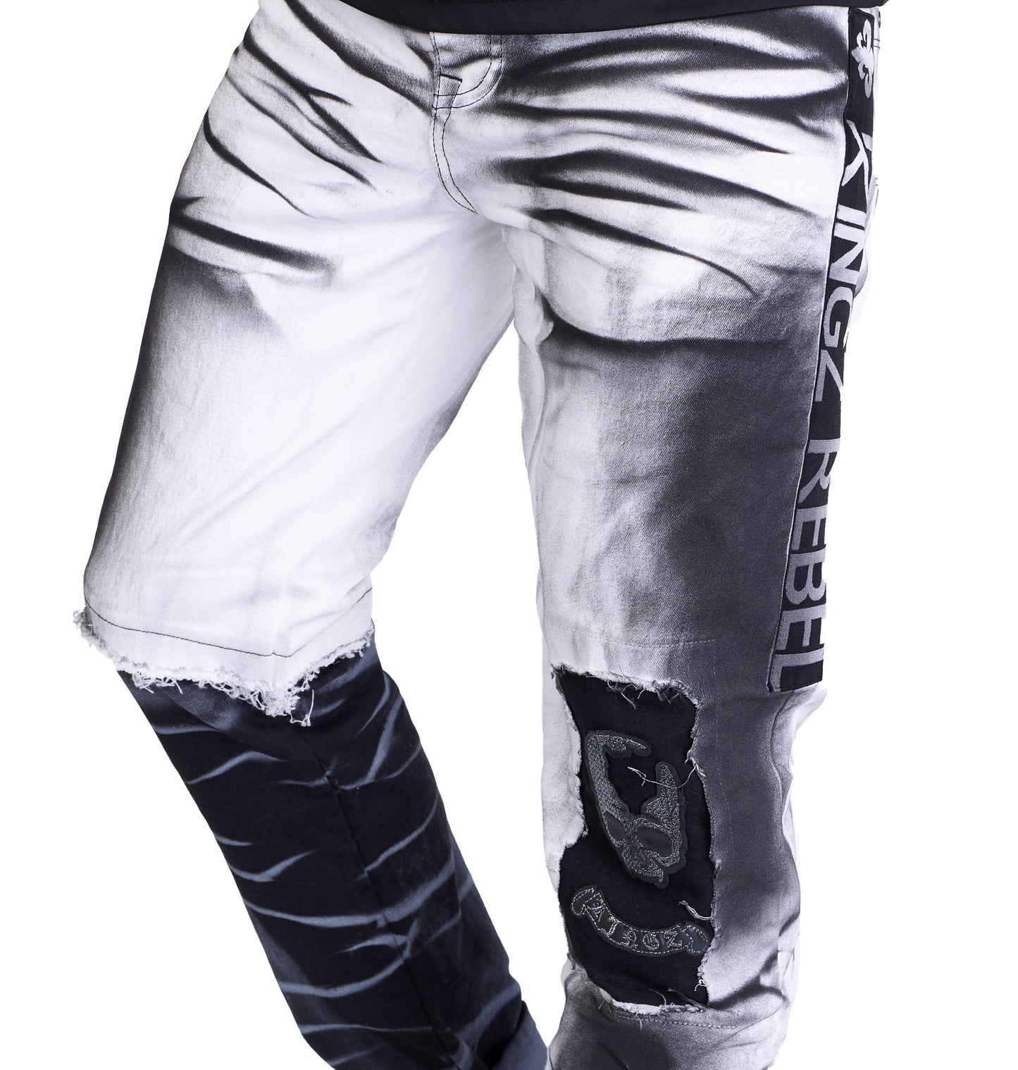 - Eyecatcher-Details: Auffälliger "KINGZ REBEL"-Schriftzug links außen am Oberschenkel, coole Totenkopfstickerei am linken Knie und ein Einsatz aus schwarzem Jeansstoff mit weißer Batikwaschung am rechten Unterbein.