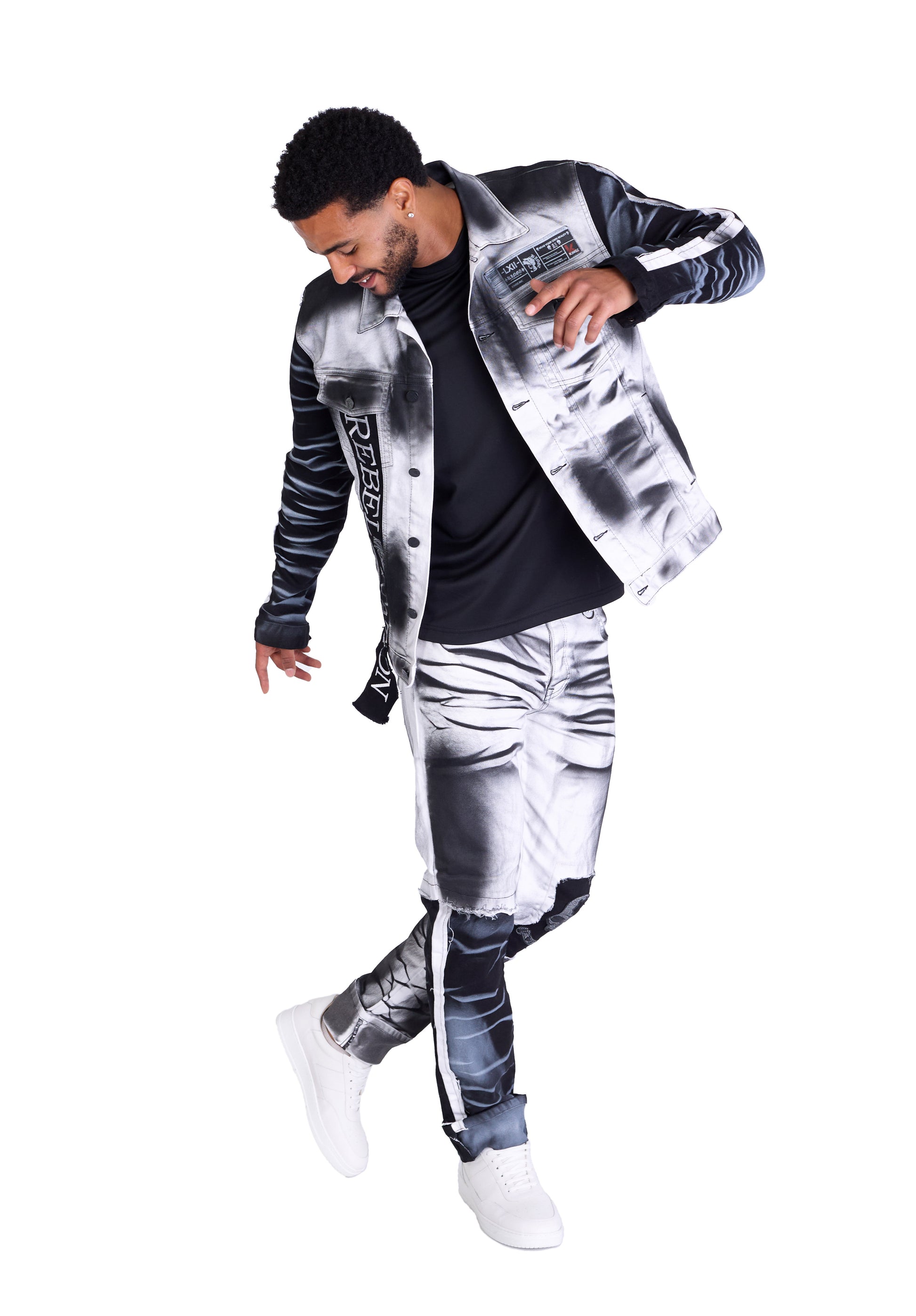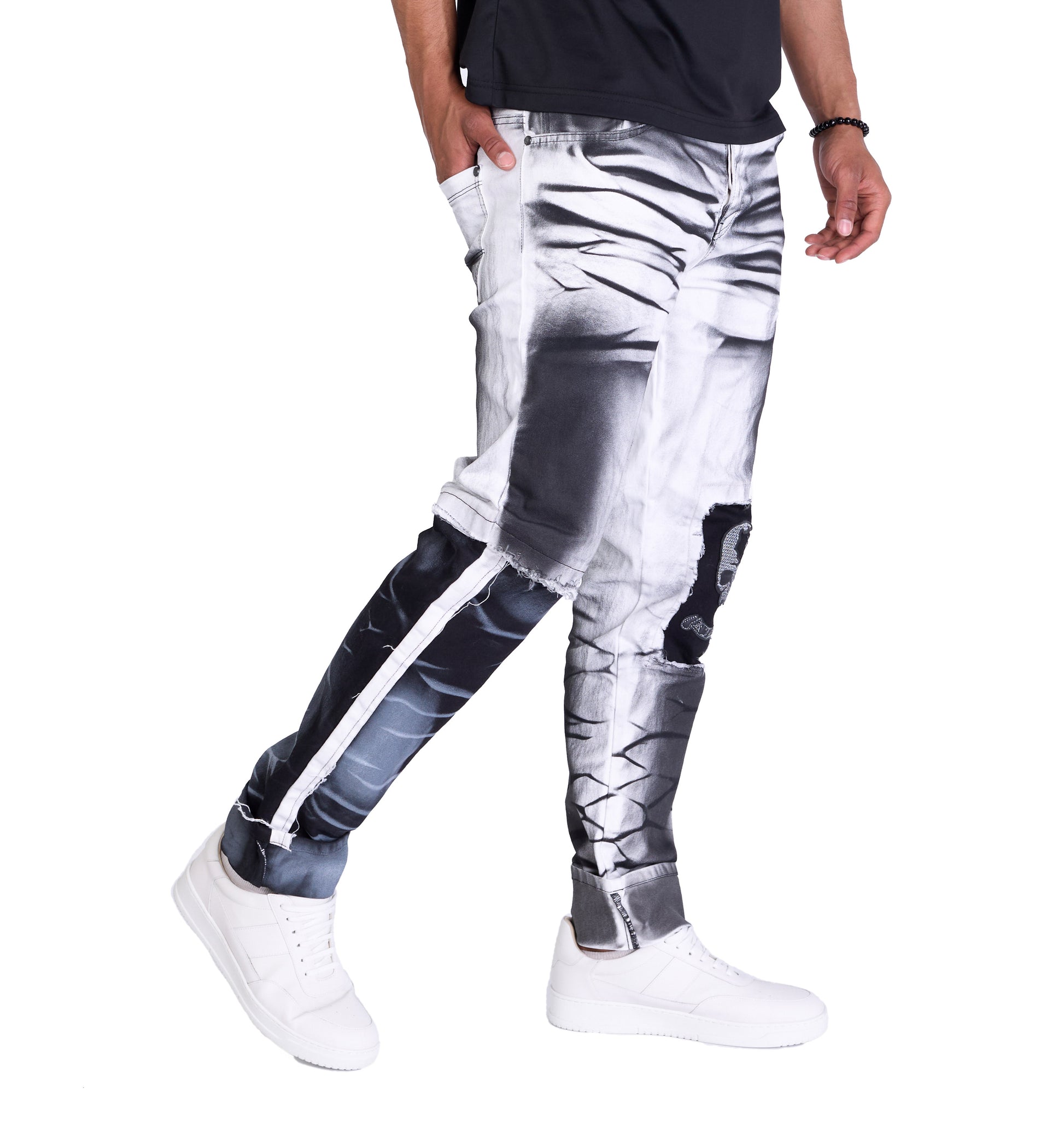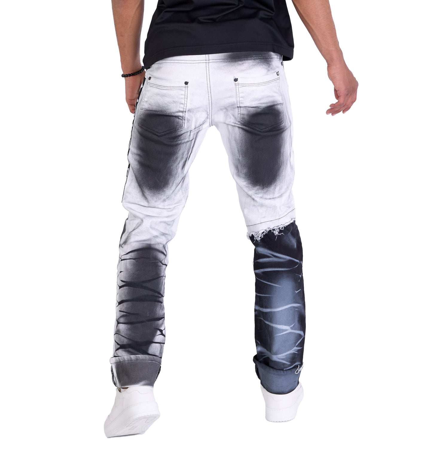 - Einzigartiges Design: Weiße Regular Fit Jeans mit markanten schwarzen Batik-Effekten für einen individuellen Look.