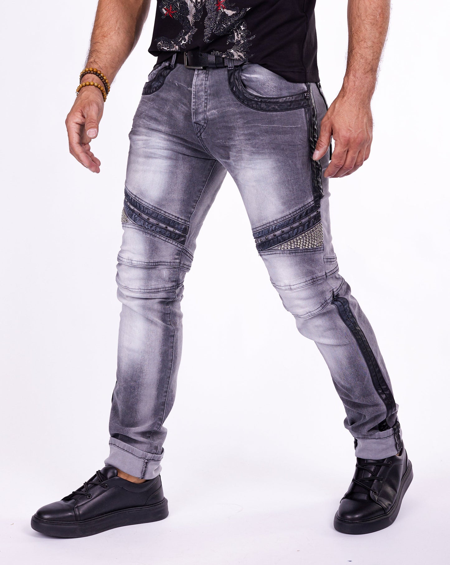 Dekorative Steppnähte und Details aus Kunstleder an den Knien und Nieten