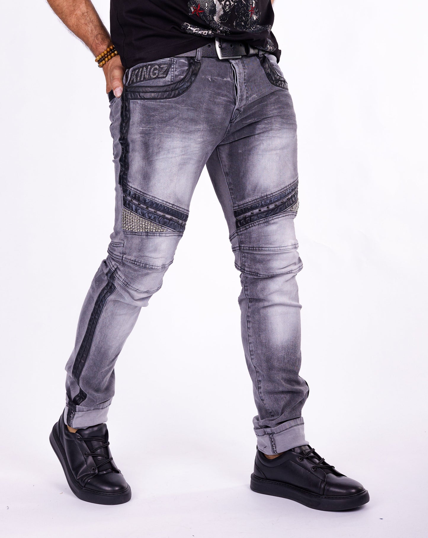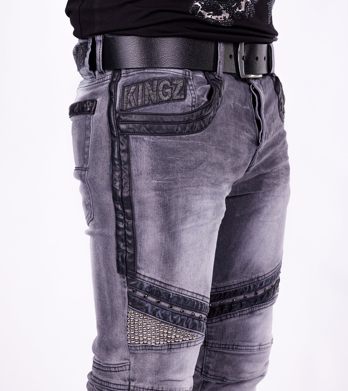KINGZ Herren Biker Jeans, Slim Fit, Modell 1649, Grau