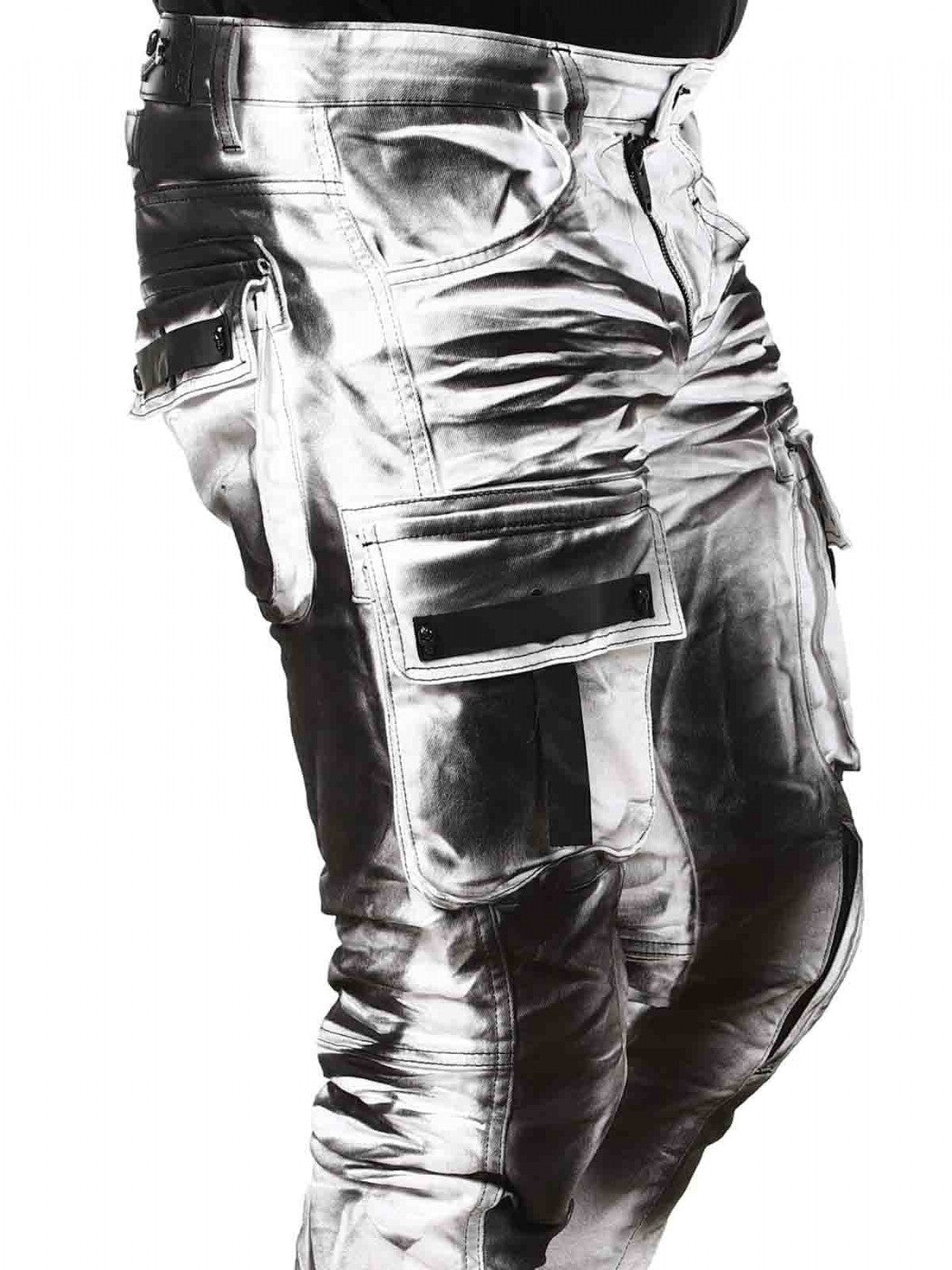 - Edle Kunstleder-Details: Zierreißverschlüsse auf den Oberschenkeln sind mit Kunstleder verziert, und die Gesäßtaschen verfügen über Klappen, die ebenfalls mit Kunstleder verfeinert wurden – ein Zeichen für exklusive Designakzente.